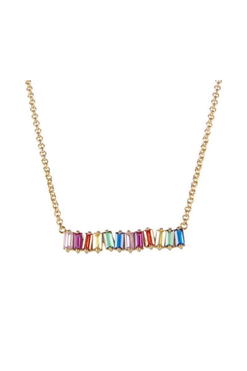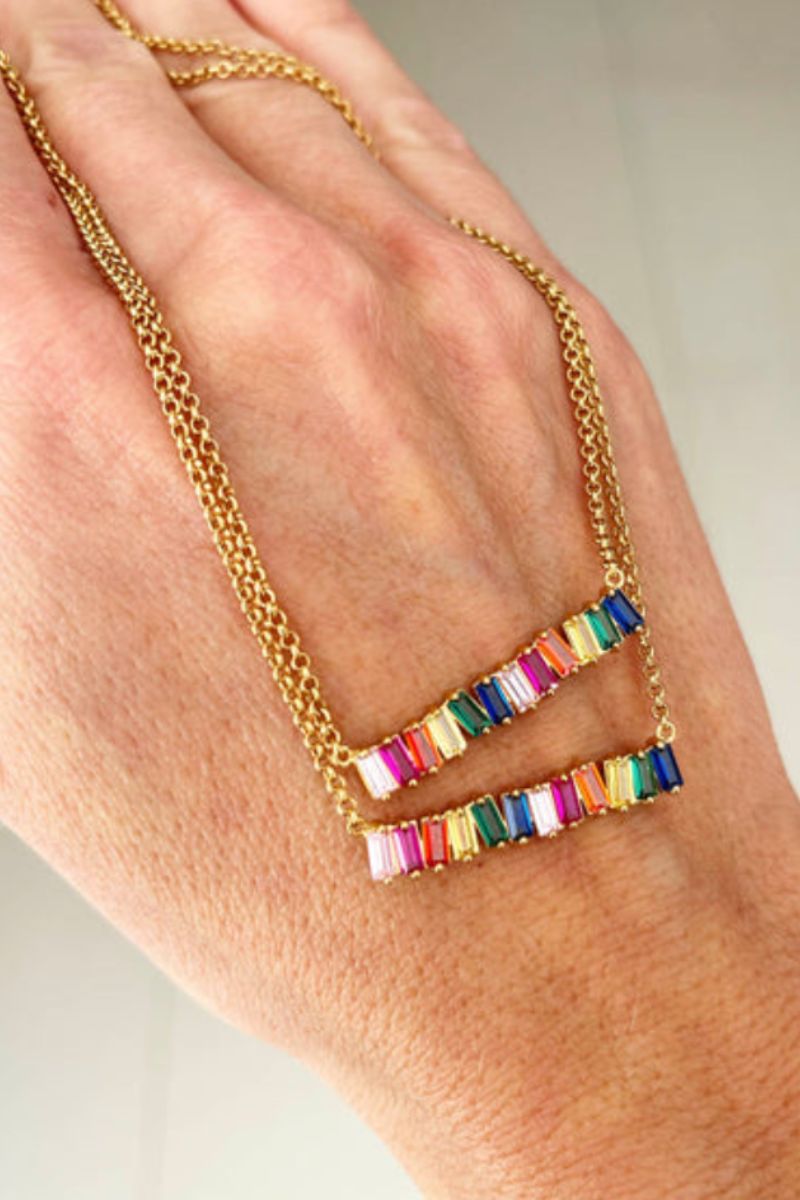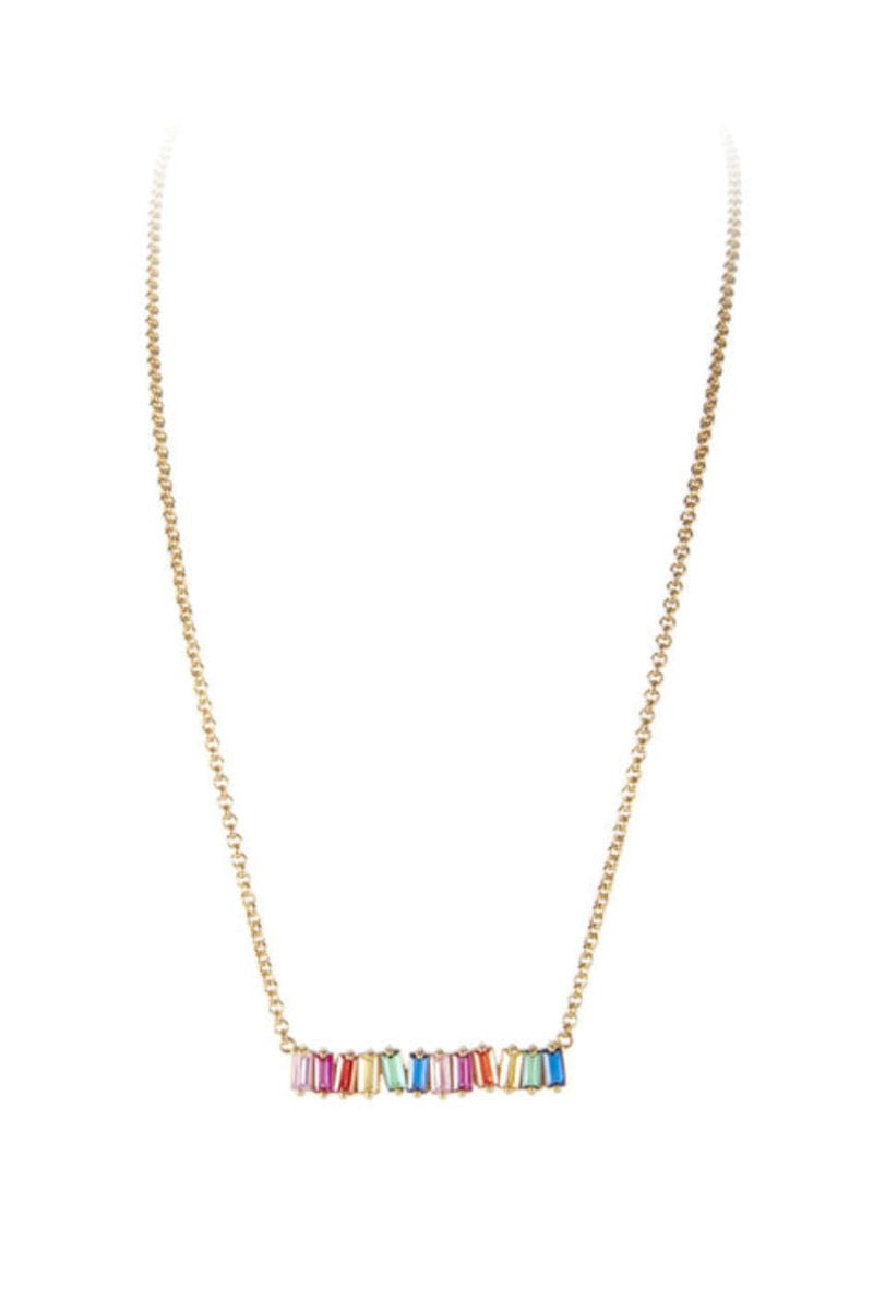 Add a splash of colour to your life, with this eye-catching sterling silver 18k gold plate necklace encrusted in a rainbow of baguette Swarovski crystals.