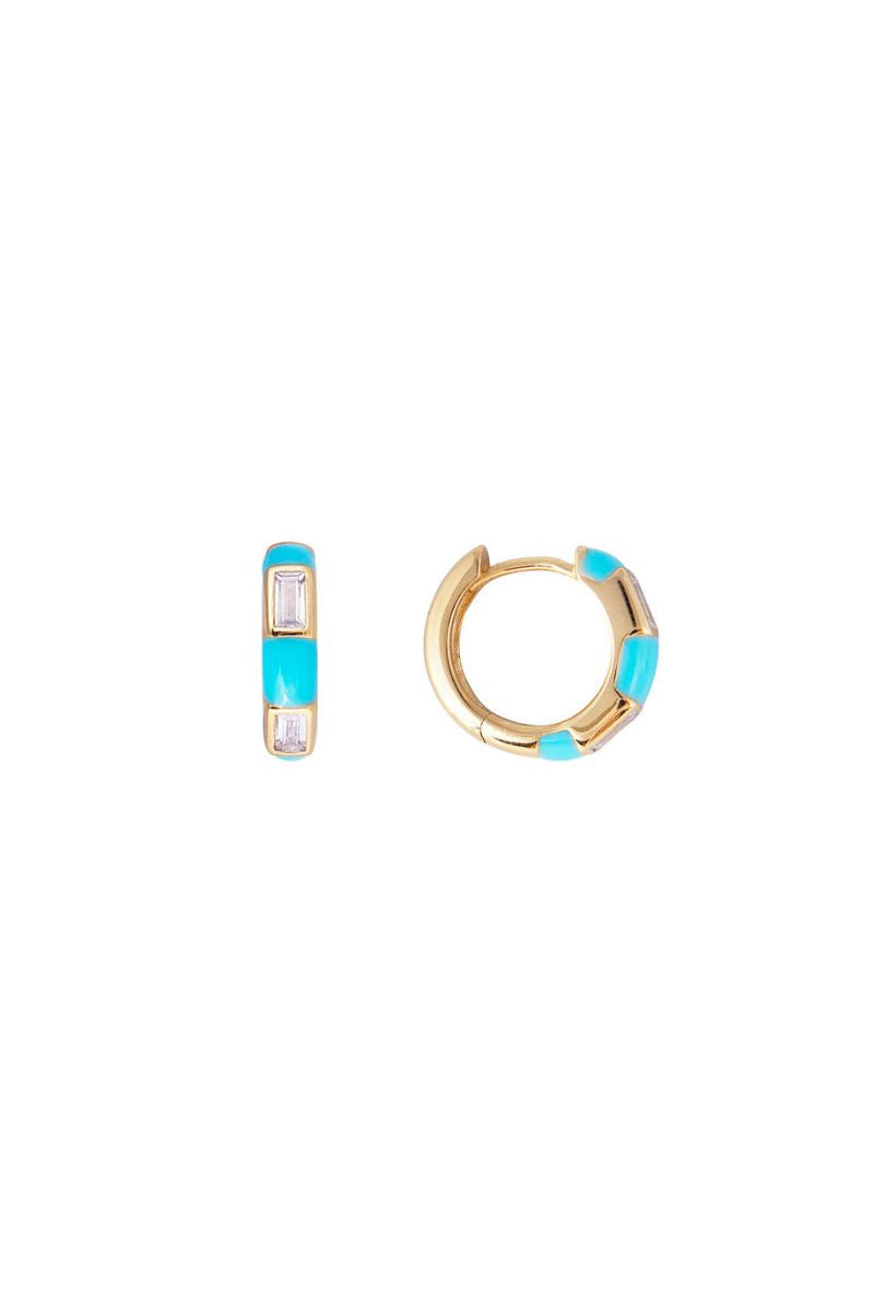 Huggie earrings have certainly skyrocketed in popularity in recent times and these mid size huggie hoops surrounded in turquoise enamel and white deco crystals will certainly add some colour and playfulness to your outfit.