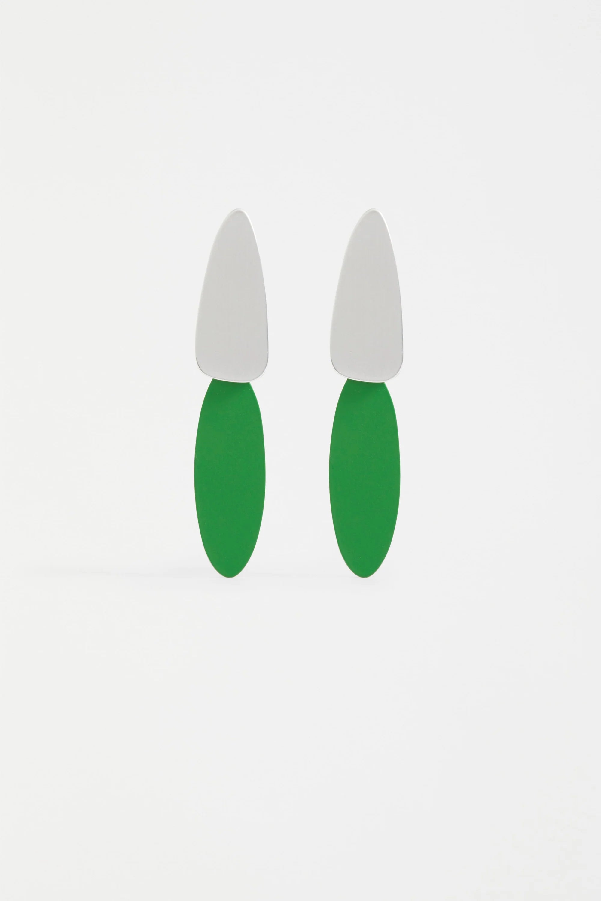 The Finn Long Drop Earring features two long, rounded shapes which contrast against one another in opposing finishes. The top component shines with its brushed metal lustre, whilst the bottom piece contrasts in vibrant rubberised metal. Make a statement by pairing the Finn Long Drop Earrings with the Foljer Top. These earrings have standard titanium posts accompanied by brass butterfly backings.
