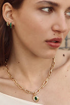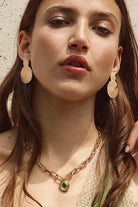 A nostalgic piece from designer Susannah Fairley who from the age of 6 began collecting trinkets from all over the world to create jewellery. This necklace showcases a deep emerald green crystal surrounded by an oval gold disc with ridges symbolising the green forest and desert sun. A meaningful chunky, yet lightweight statement necklace for the luxe traveller.