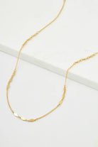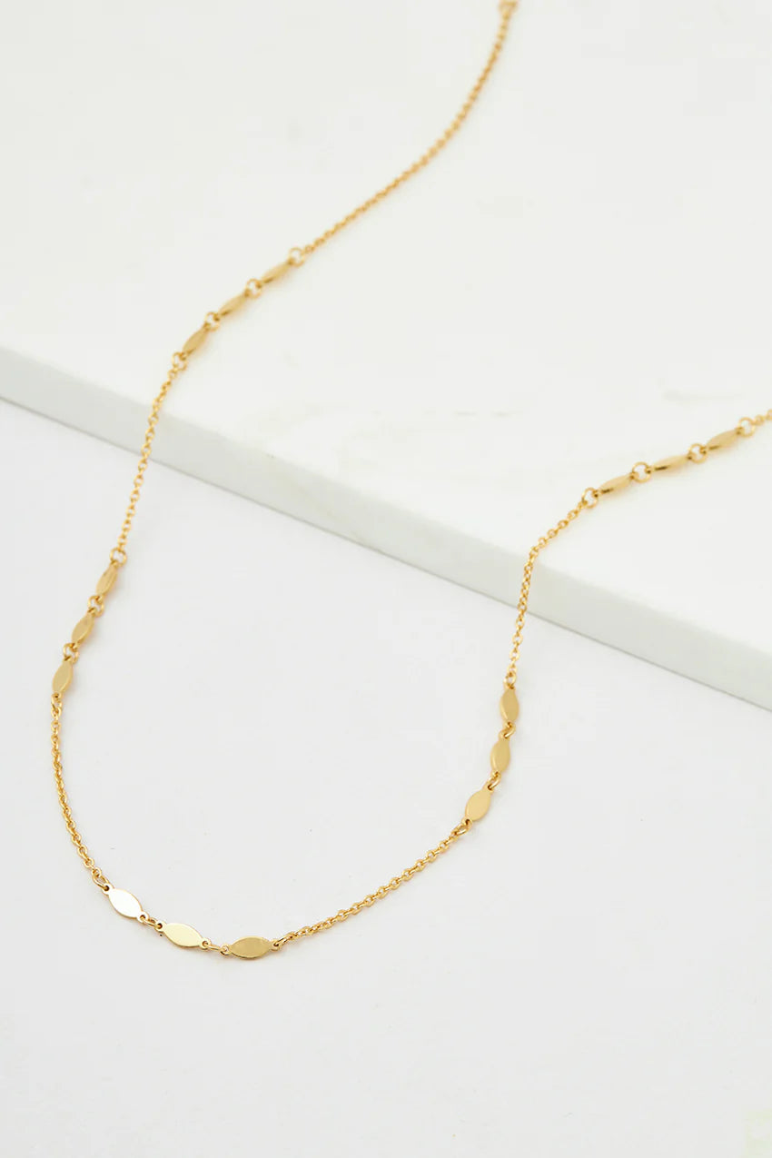 This necklace features a chain with small disks attached, creating a beautiful and intricate design. Its detail adds a modern and stylish element to the piece, while the necklace's length makes it the perfect layering companion.