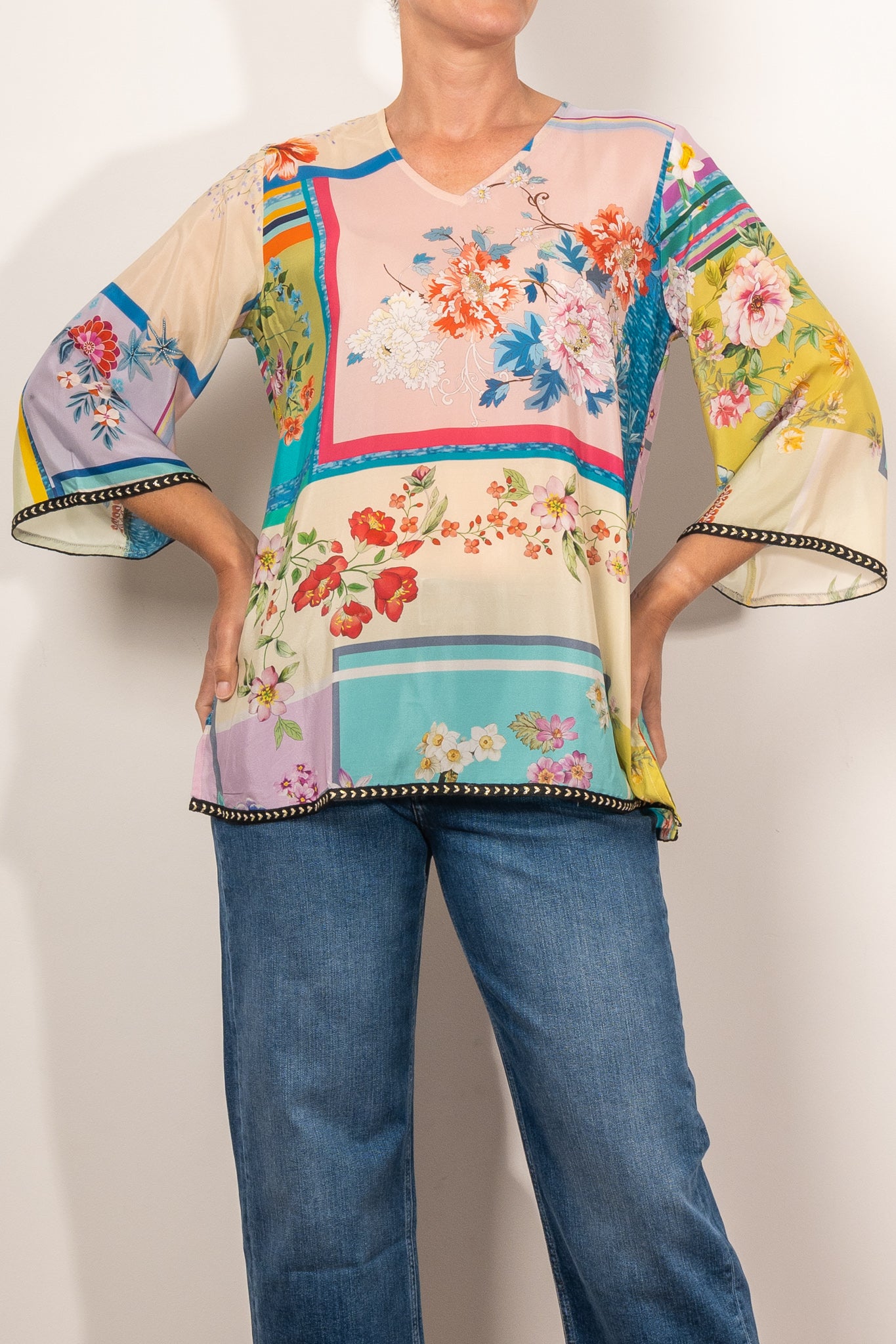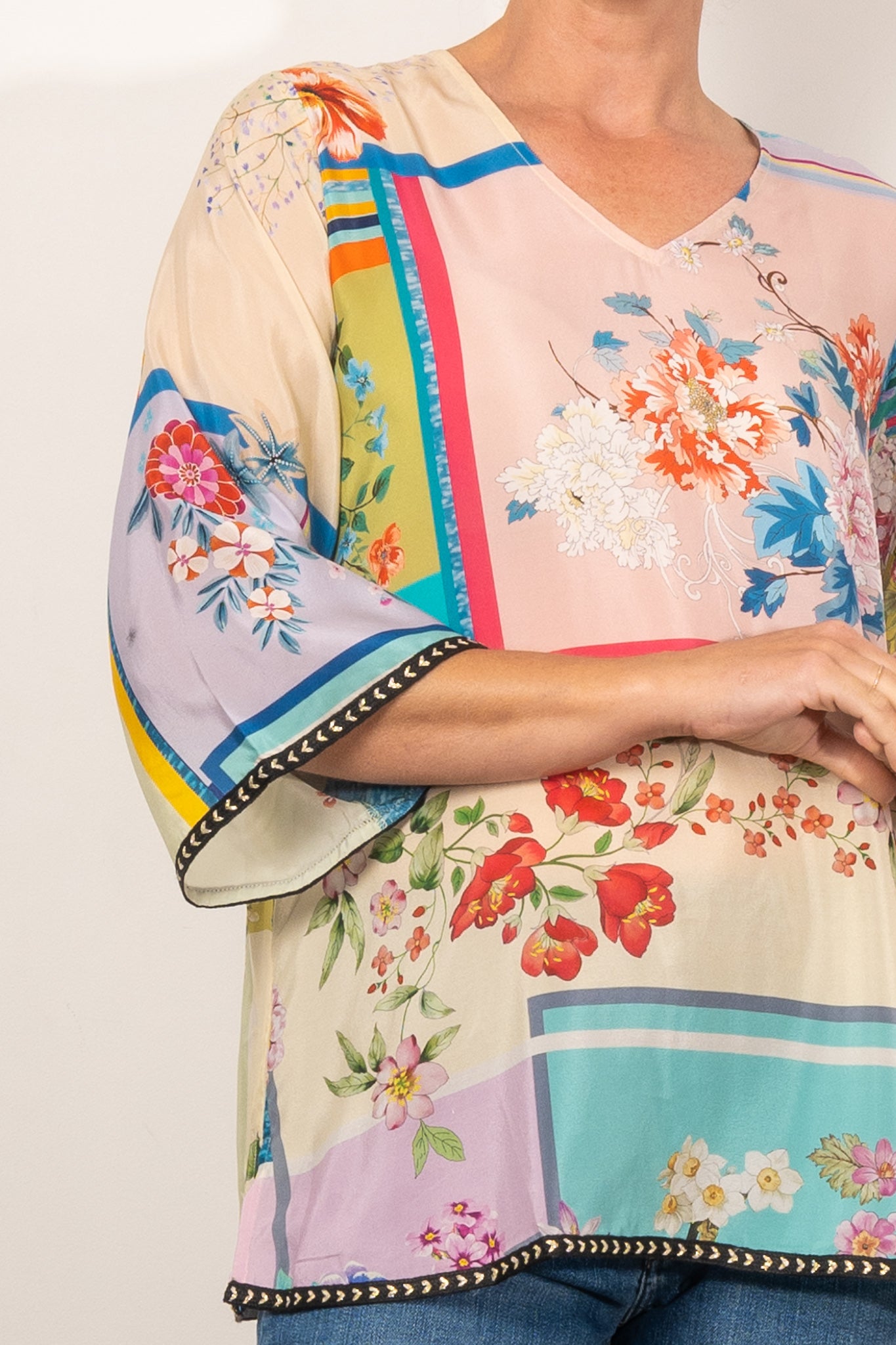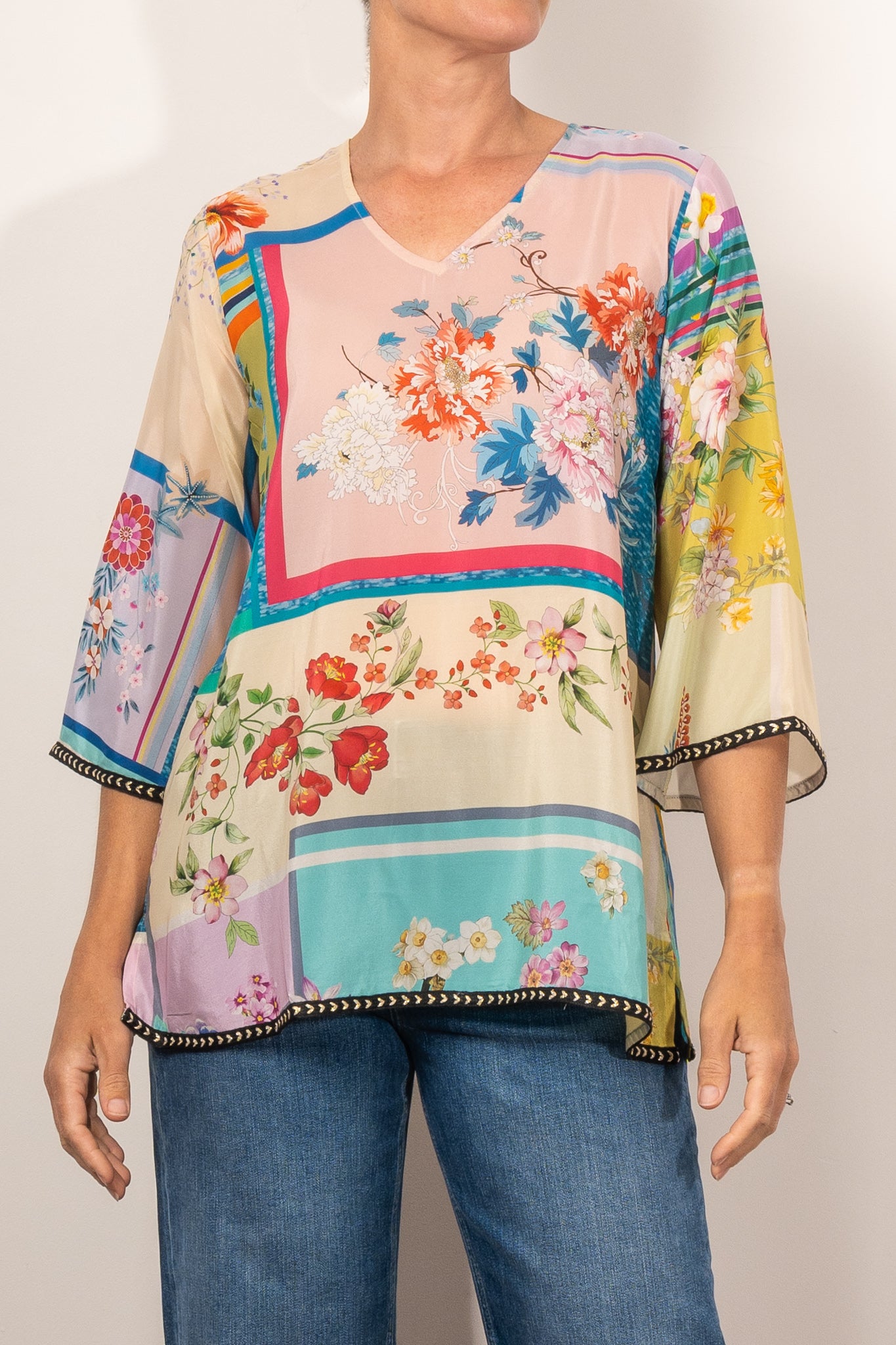 Introducing the Johnny Was Cali Blouse in Stallion - a luxurious 100% silk blouse with a V neckline, wide 3/4 sleeves and relaxed fit. Its colourful floral patchwork print adds an effortless touch of elegance to any outfit.
