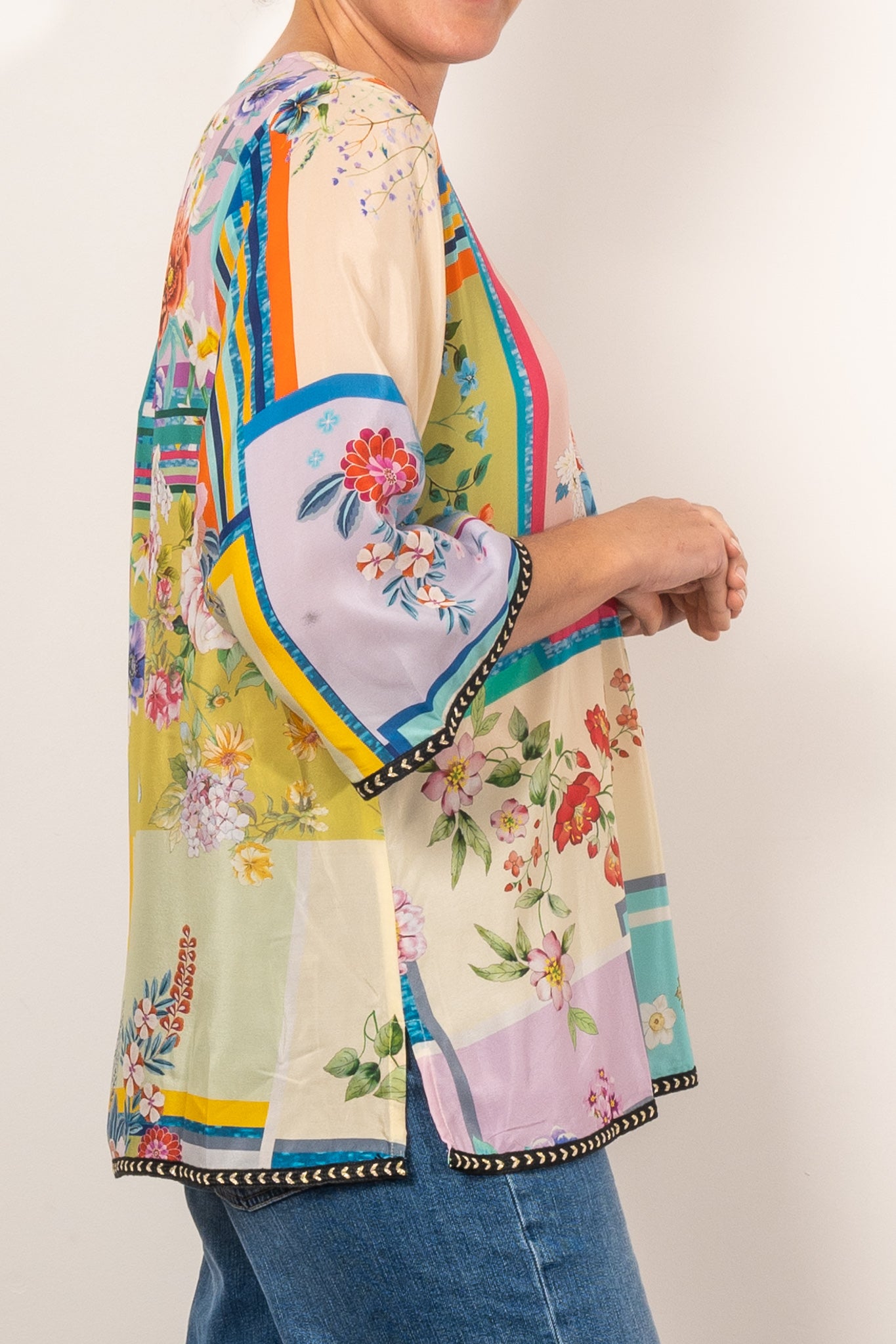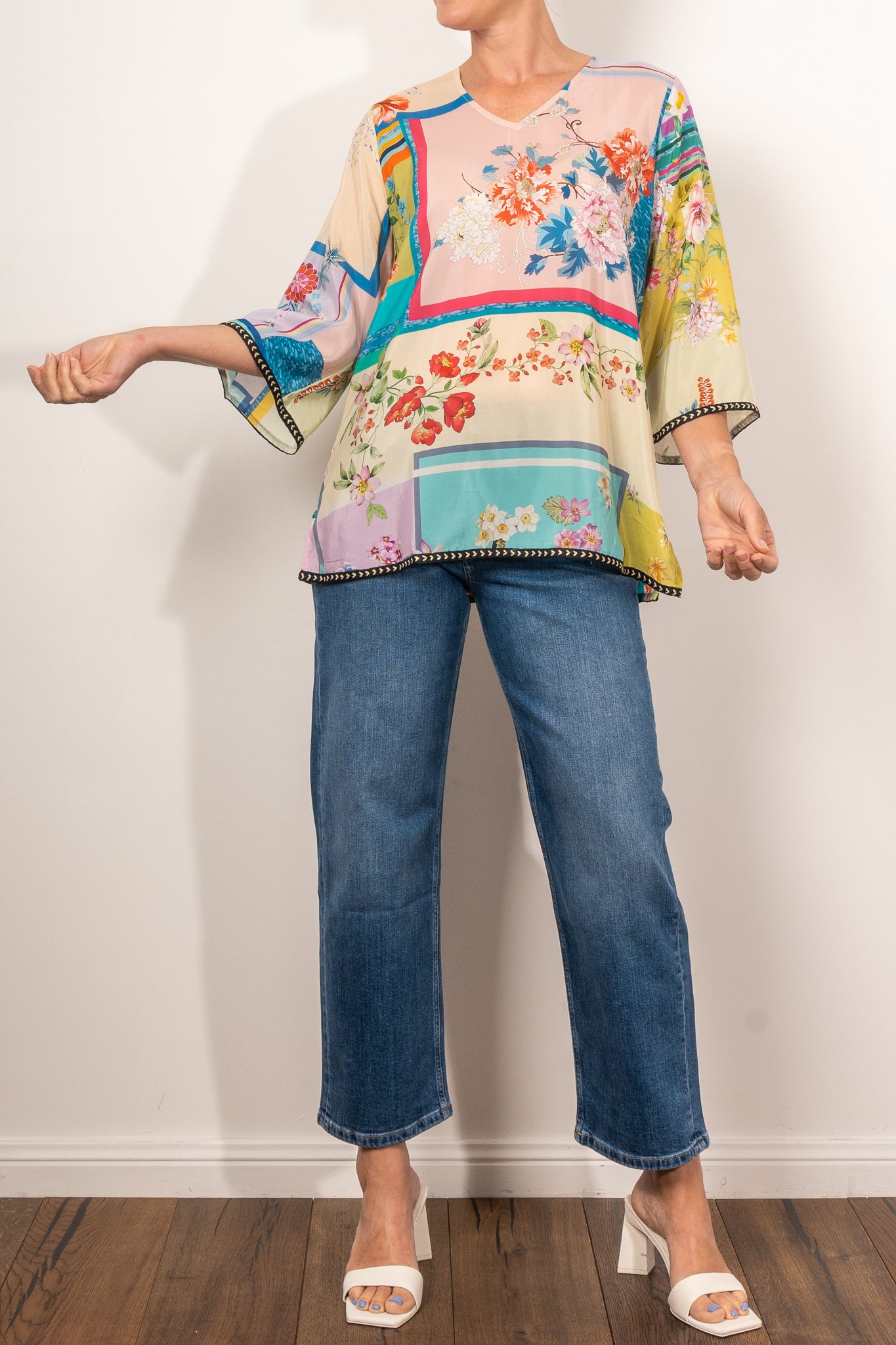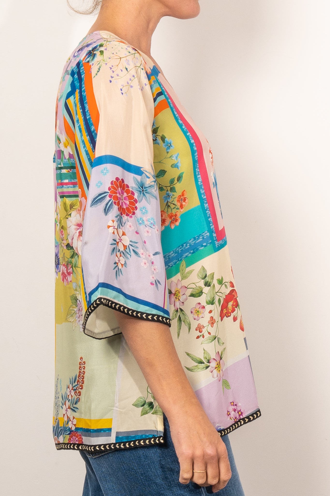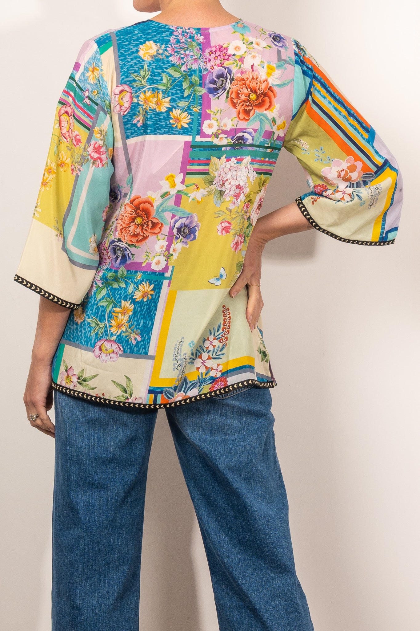 Introducing the Johnny Was Cali Blouse in Stallion - a luxurious 100% silk blouse with a V neckline, wide 3/4 sleeves and relaxed fit. Its colourful floral patchwork print adds an effortless touch of elegance to any outfit.