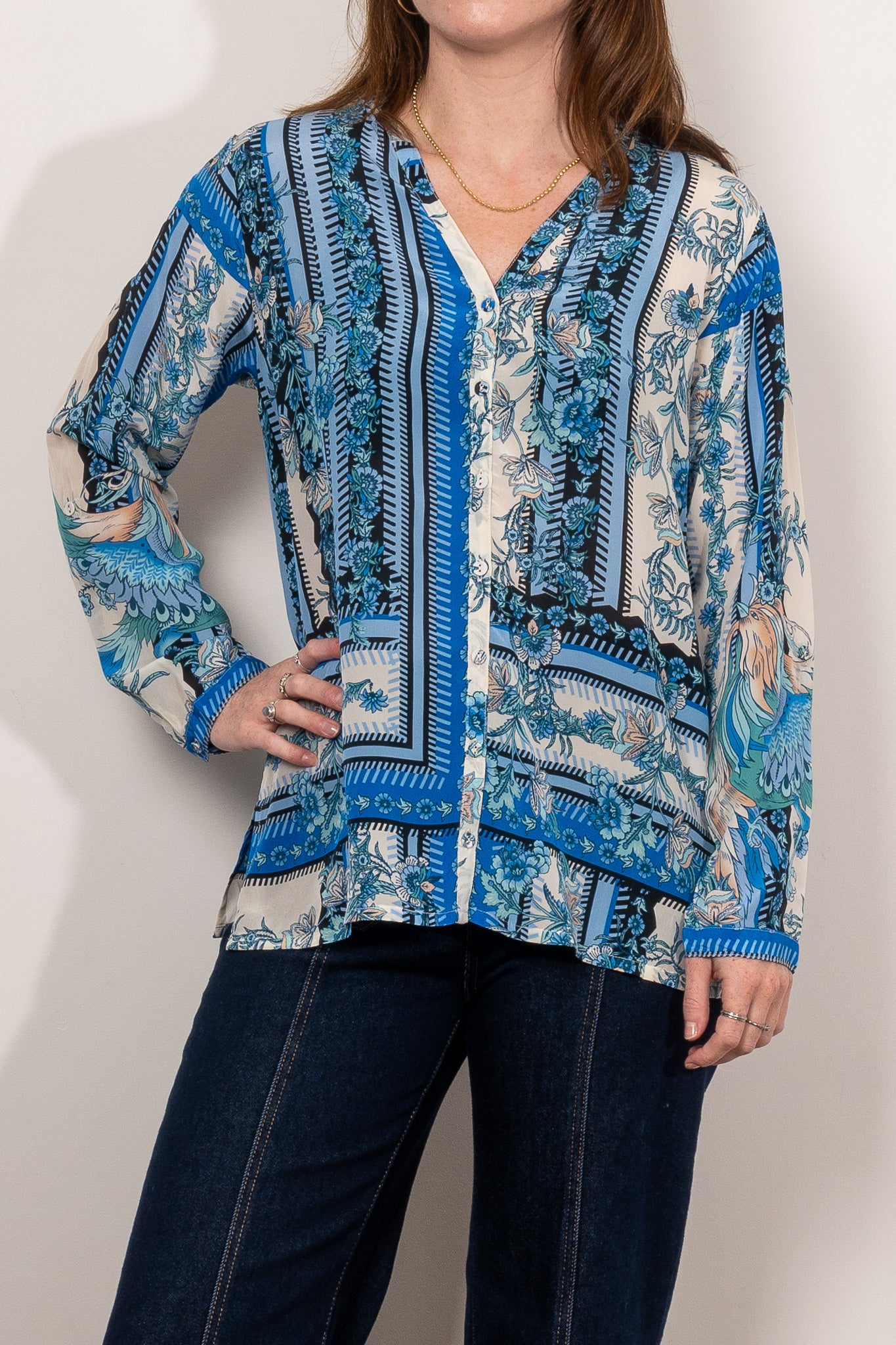 Introducing the Australian exclusive Johnny Was Marritt Blouse in Revive Jacky. Made of luxurious silk, this blue blouse features a playful combination of florals and stripes. With a button-up front and tab sleeve option, this long-length blouse is both easy to wear and effortlessly chic.