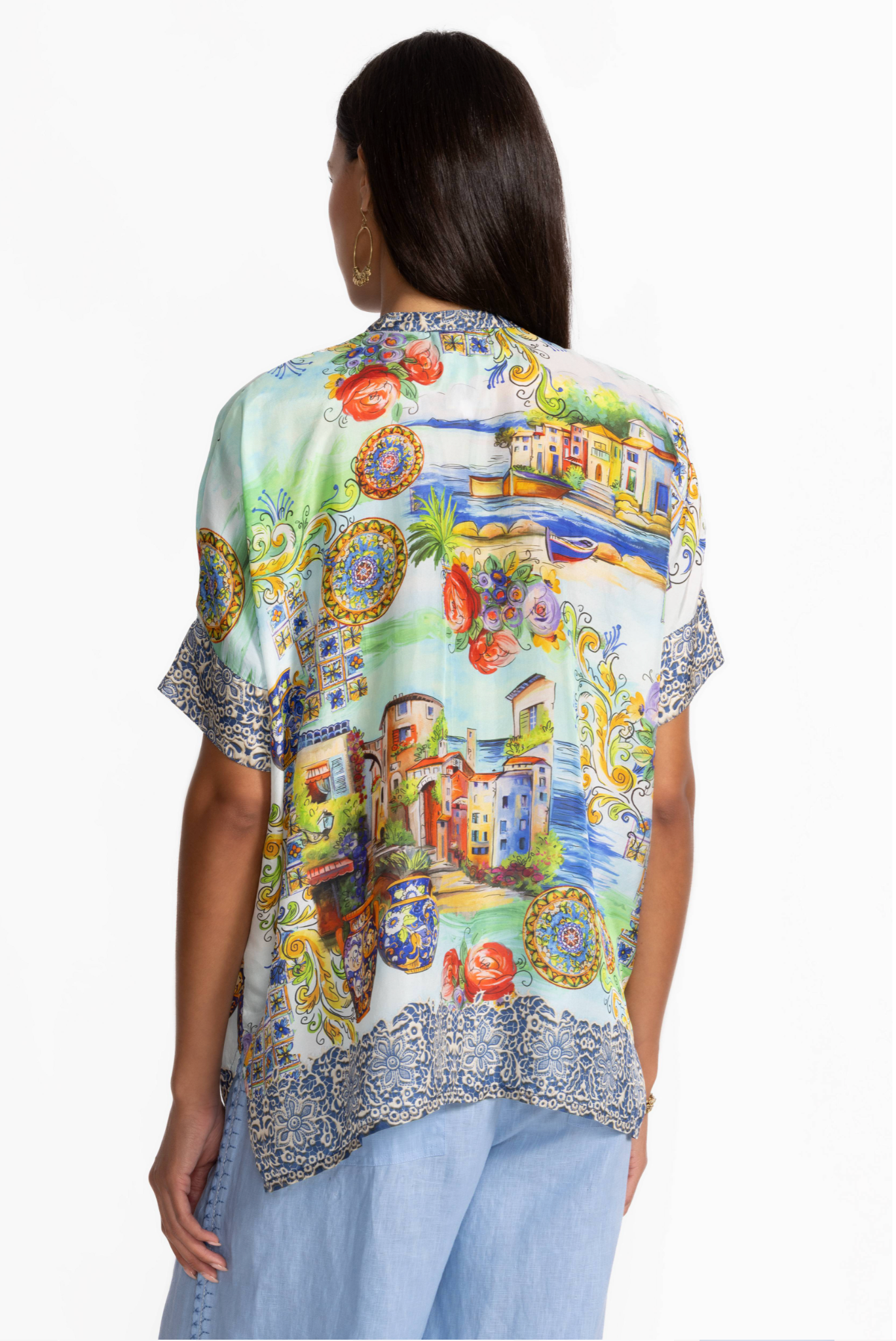 Experience luxury with the Johnny Was Shiro Buttoned Down Shirt, crafted from 100% sumptuous silk. Its bold scenic pattern and vibrant colors make a striking statement, while the banded collar and button-front add refined detail. Designed with a relaxed fit, Dolman sleeves, and side slits, this blouse ensures comfort and effortless style. Perfectly pair it with coordinating silk pants and kitten heels for an elegant, resort-ready look that turns heads wherever you go.