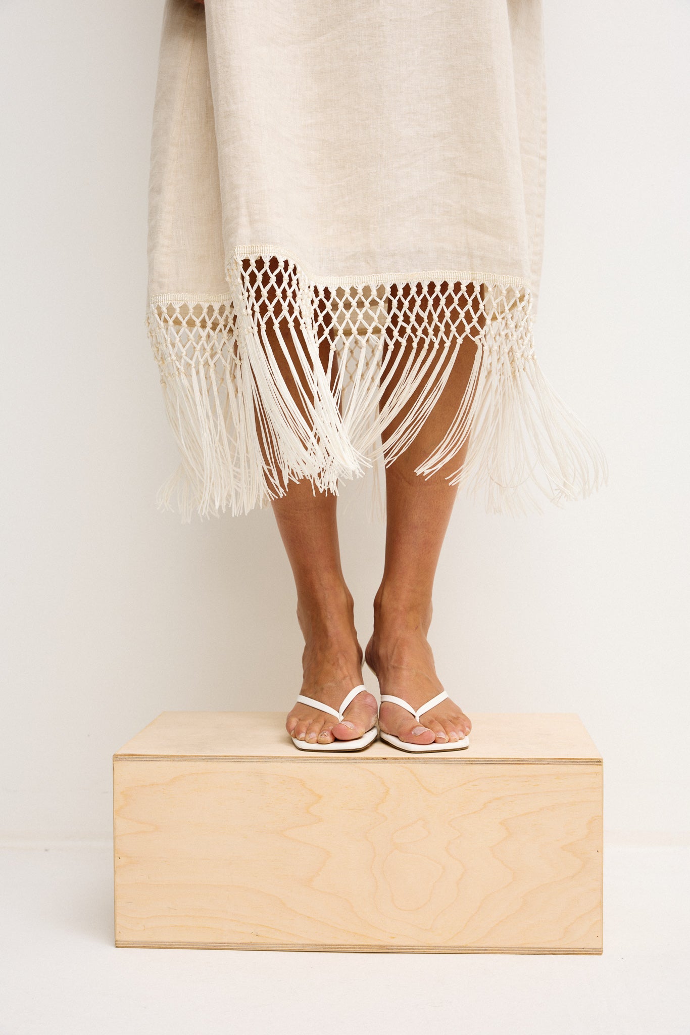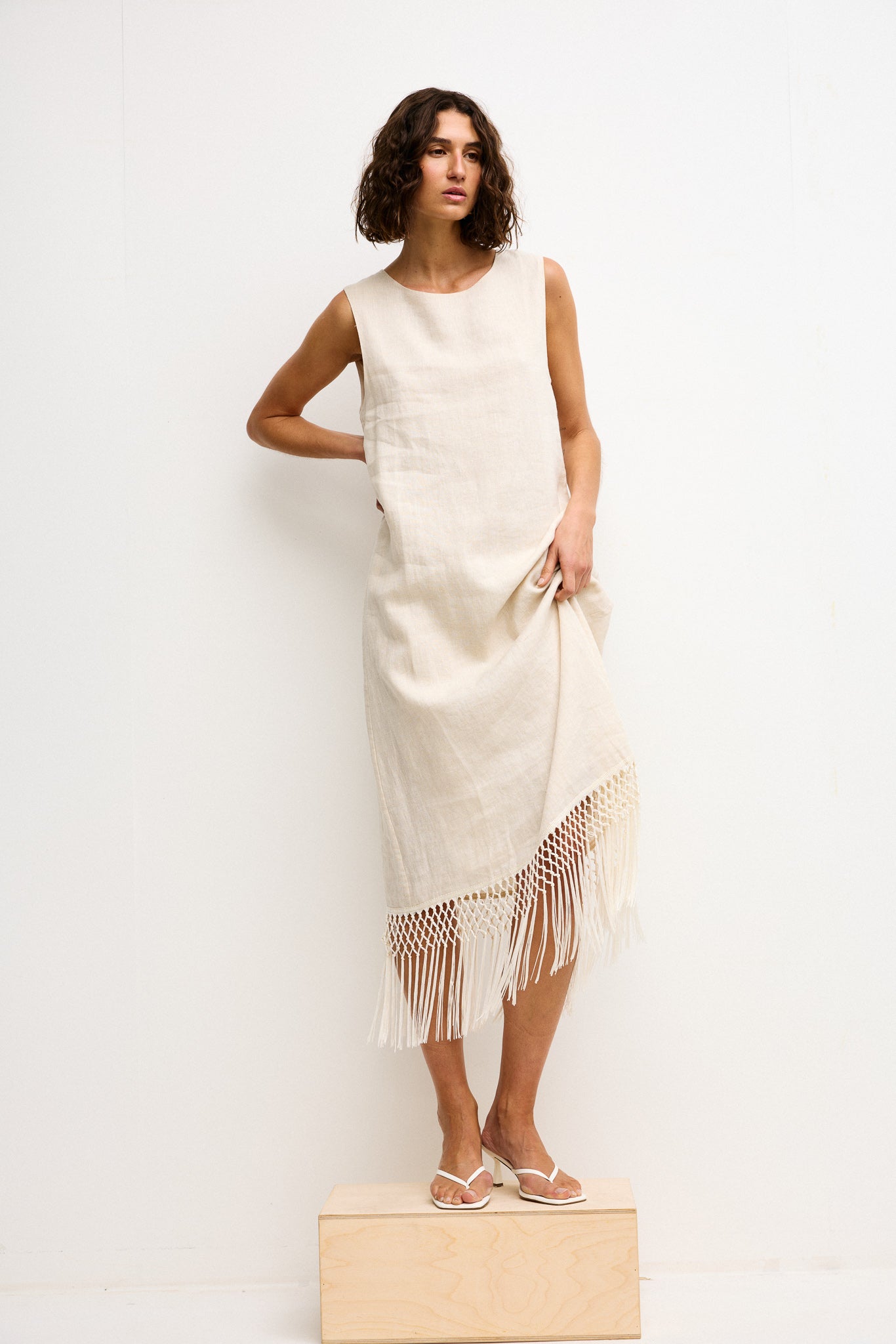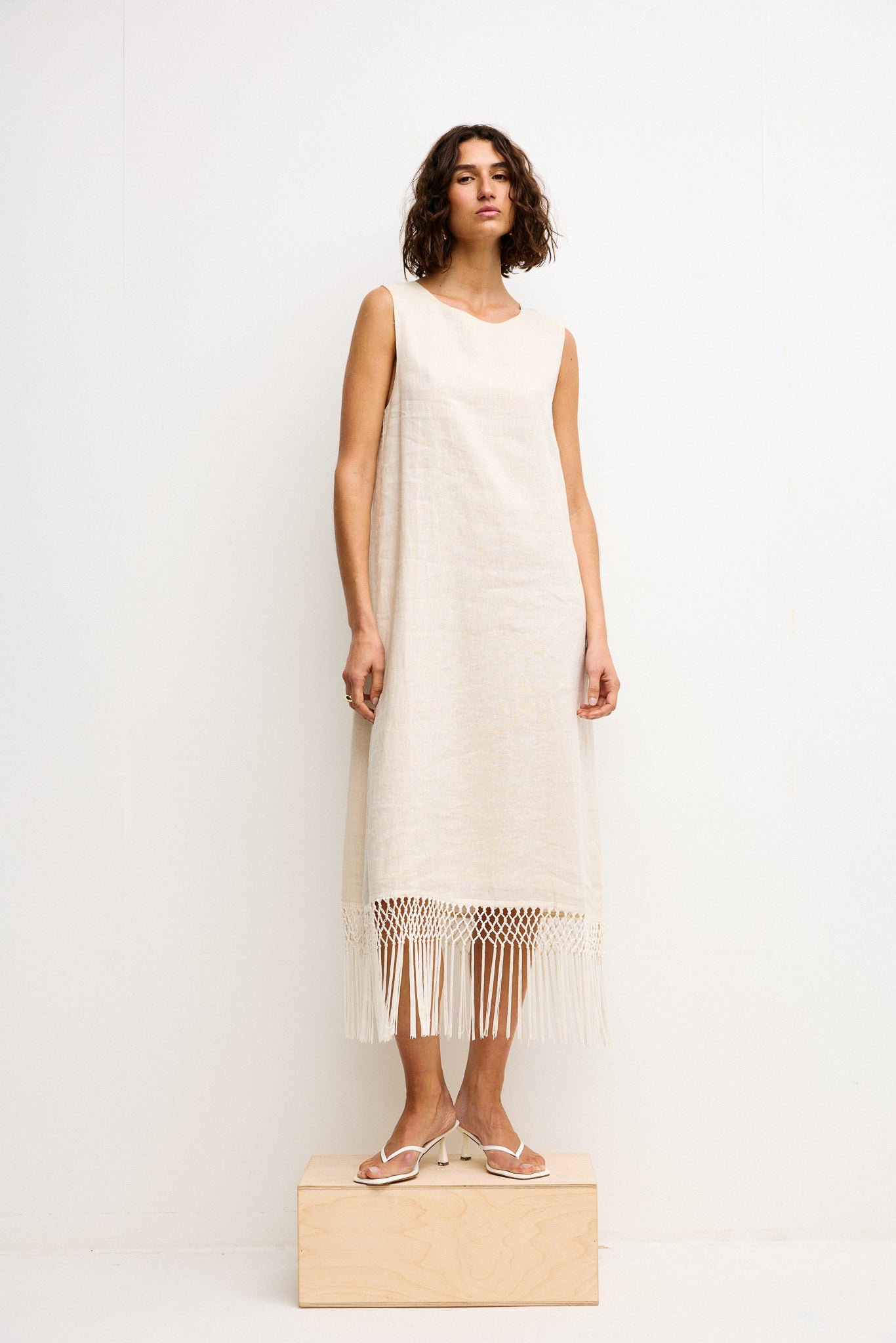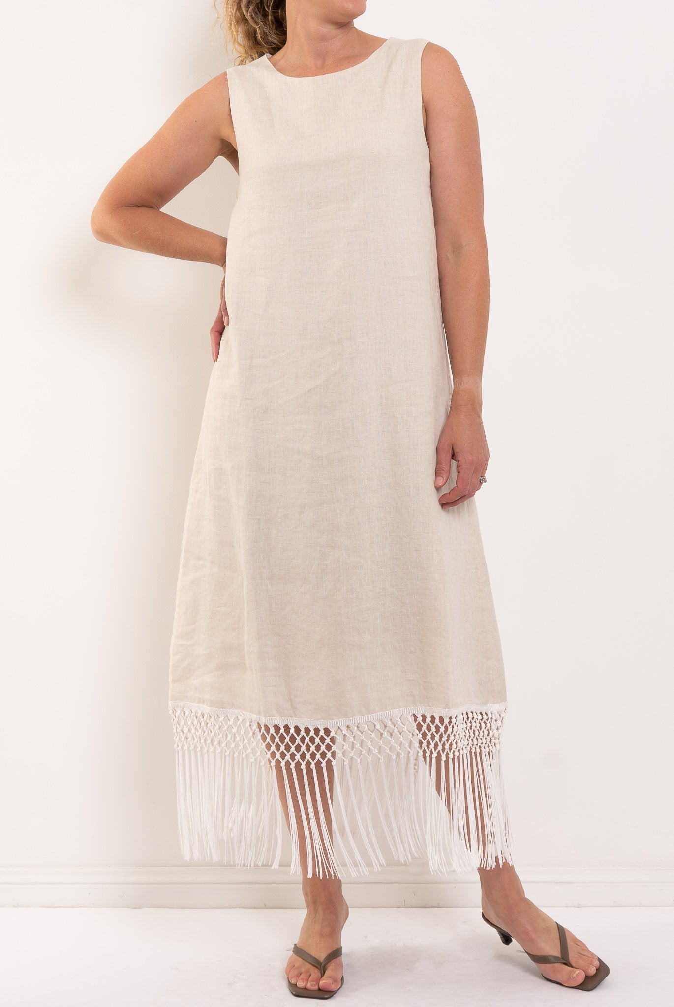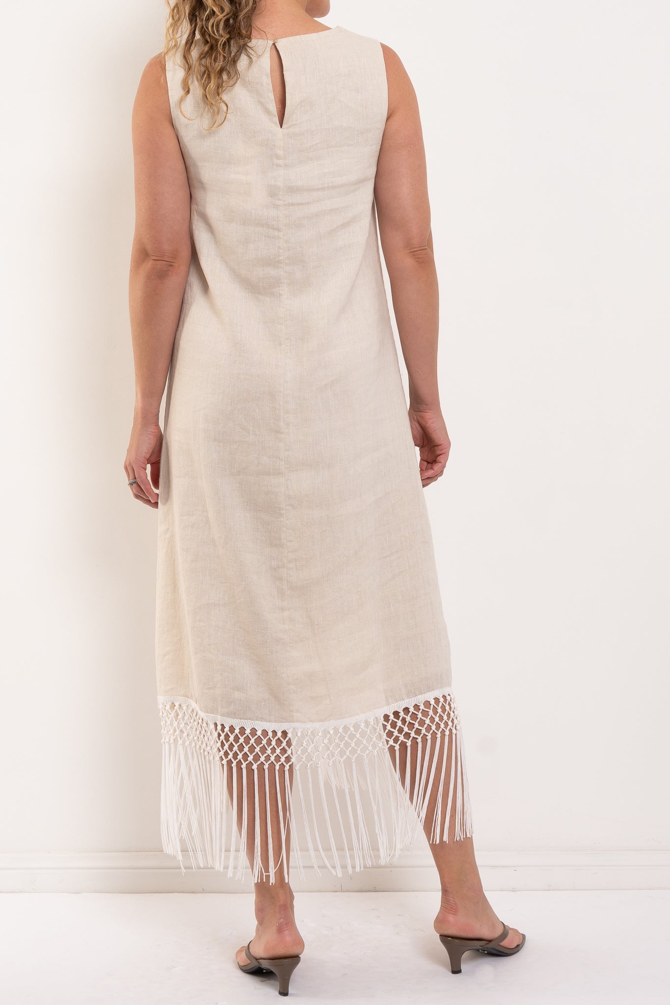 Featuring a clean, straight silhouette and a high round neckline, the Gala falls gracefully to mid-calf where a statement macramé fringe hem adds textural interest and movement. Its pull-on design and keyhole button closure at the back ensure effortless wearability. Ideal for long lunches, relaxed summer gatherings or holiday evenings — simply add sandals or heels for a polished finish.