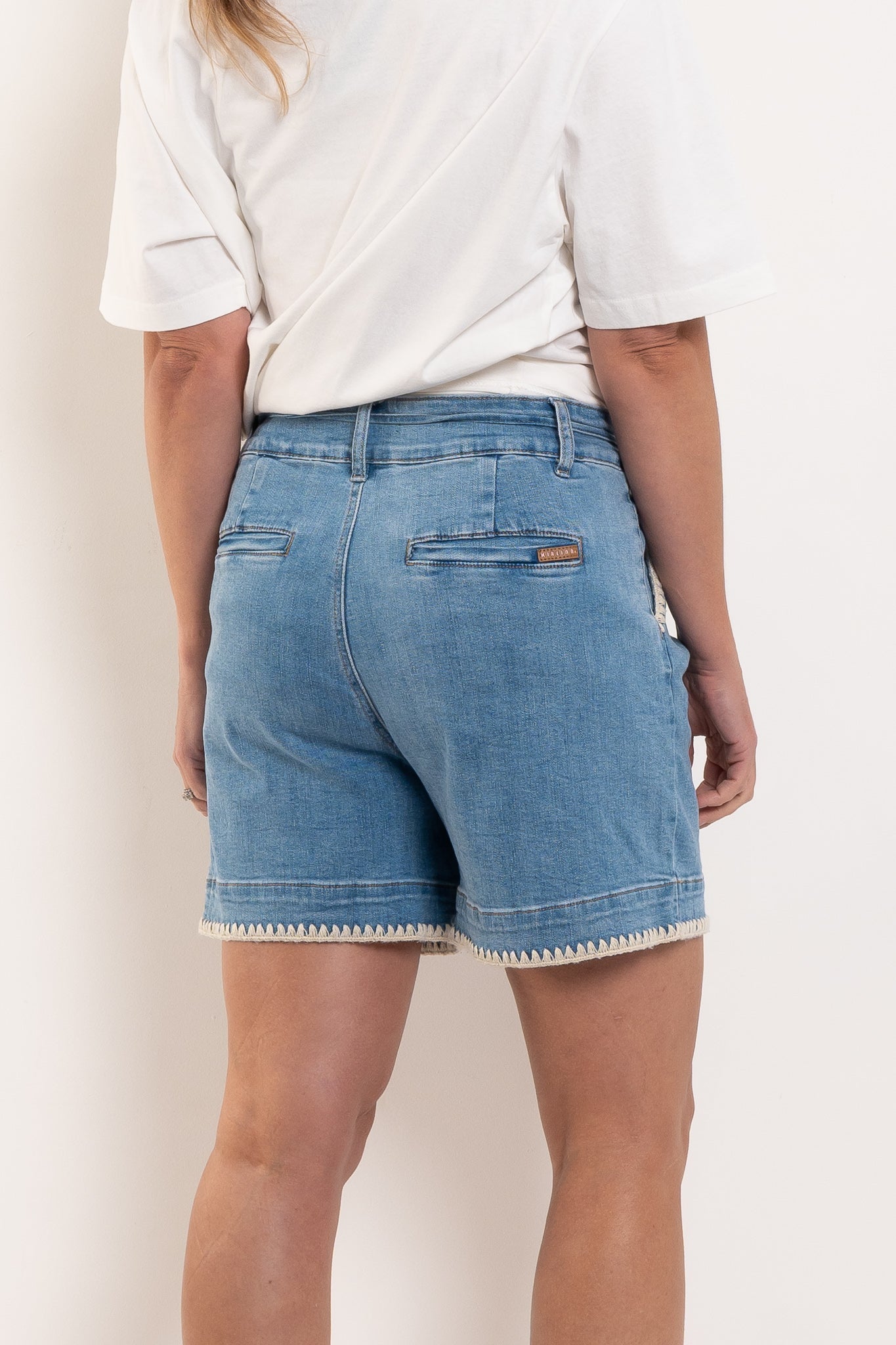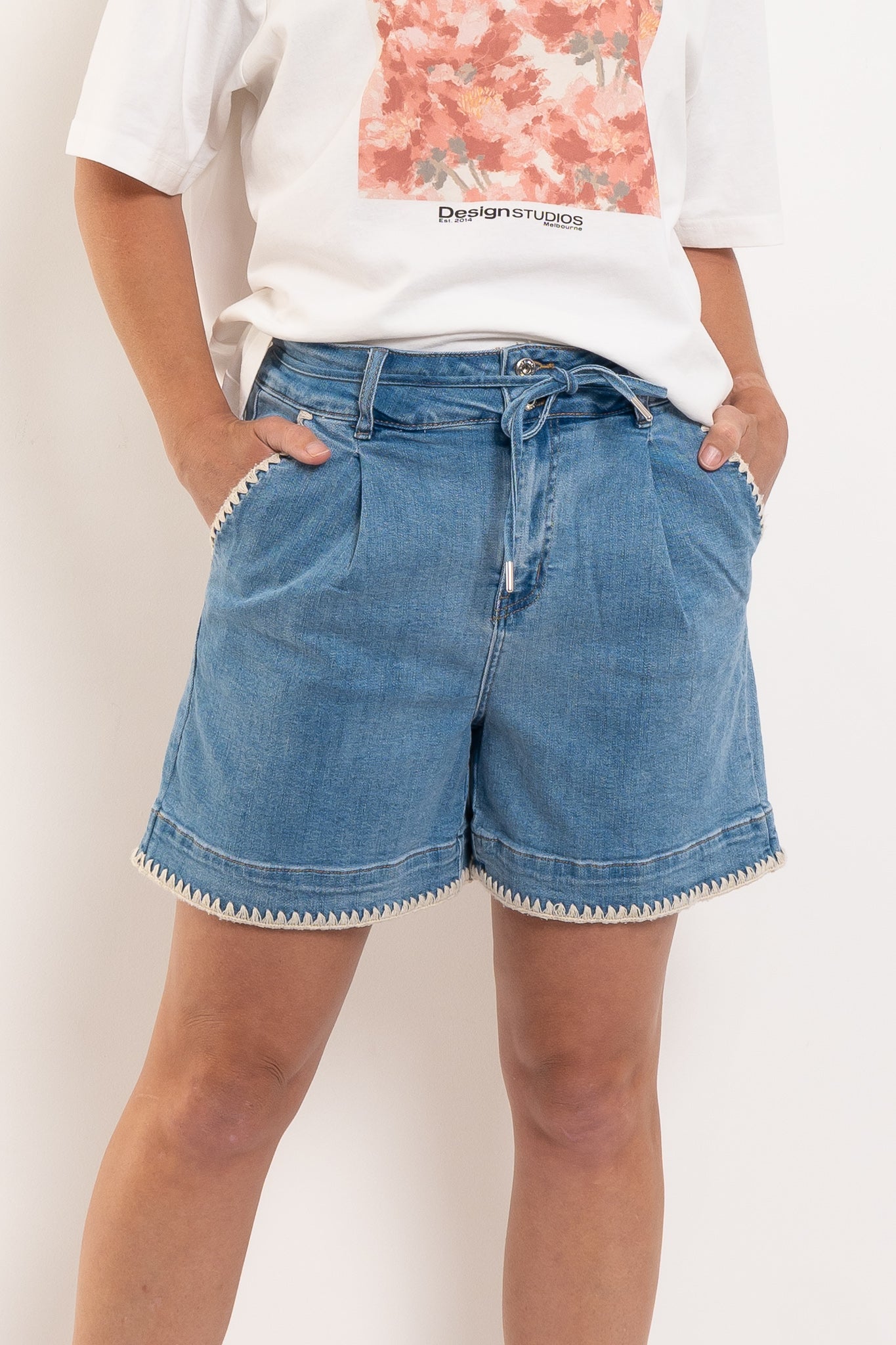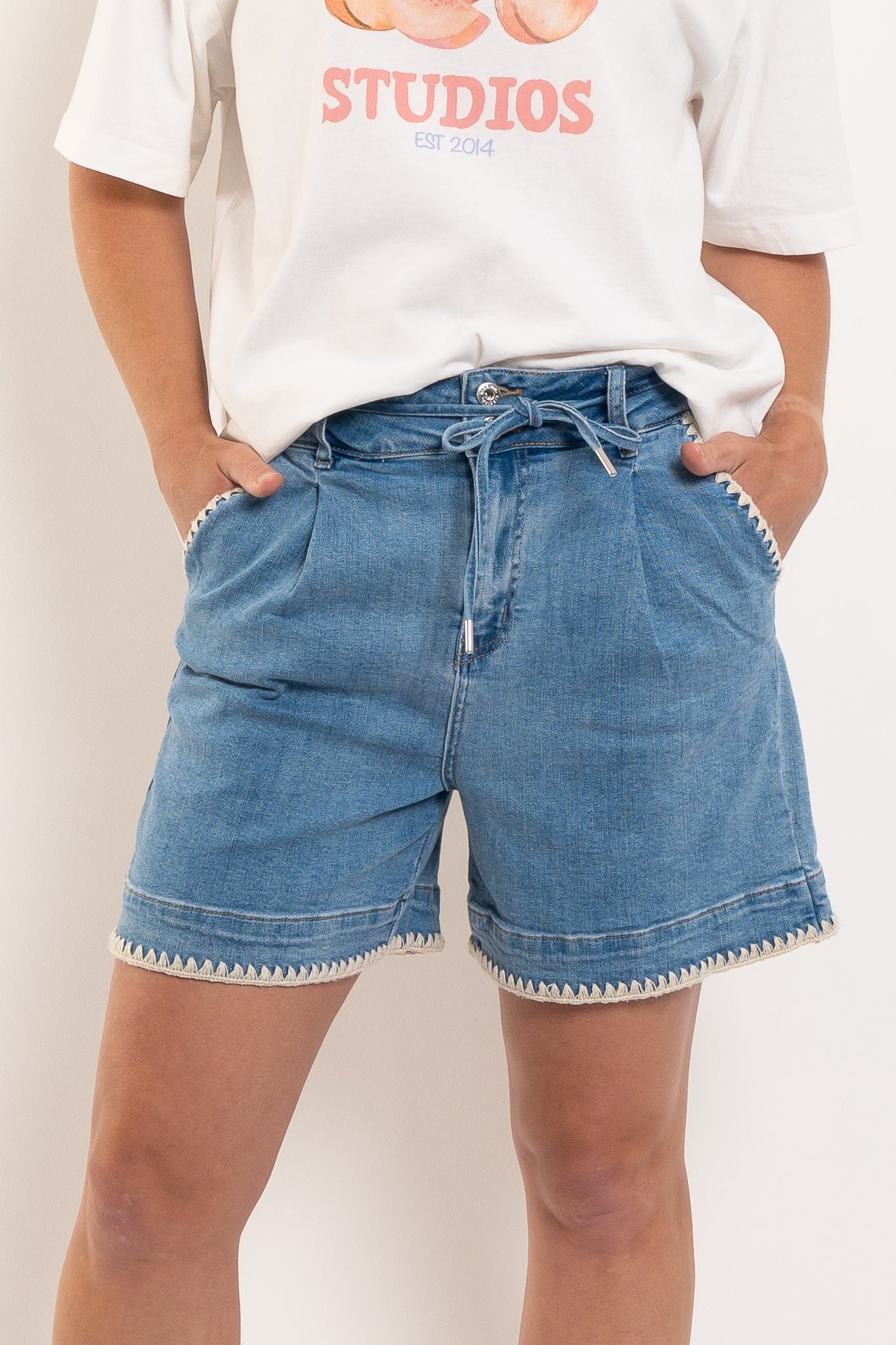 Elevate your casual wardrobe with the Kireina Abigail Short—a thoughtfully designed denim piece that balances comfort with style. Crafted from a soft elastane-cotton blend, these shorts move with you throughout the day. The flattering front pleats create dimension, while the adjustable waist tie ensures a perfect fit. Distinctive contrast blanket stitch detailing on the hem and pockets adds character and visual interest. Cut at a modest length, they're versatile enough for weekend errands or relaxed social outings. Quality construction meets everyday wearability in this essential denim short.