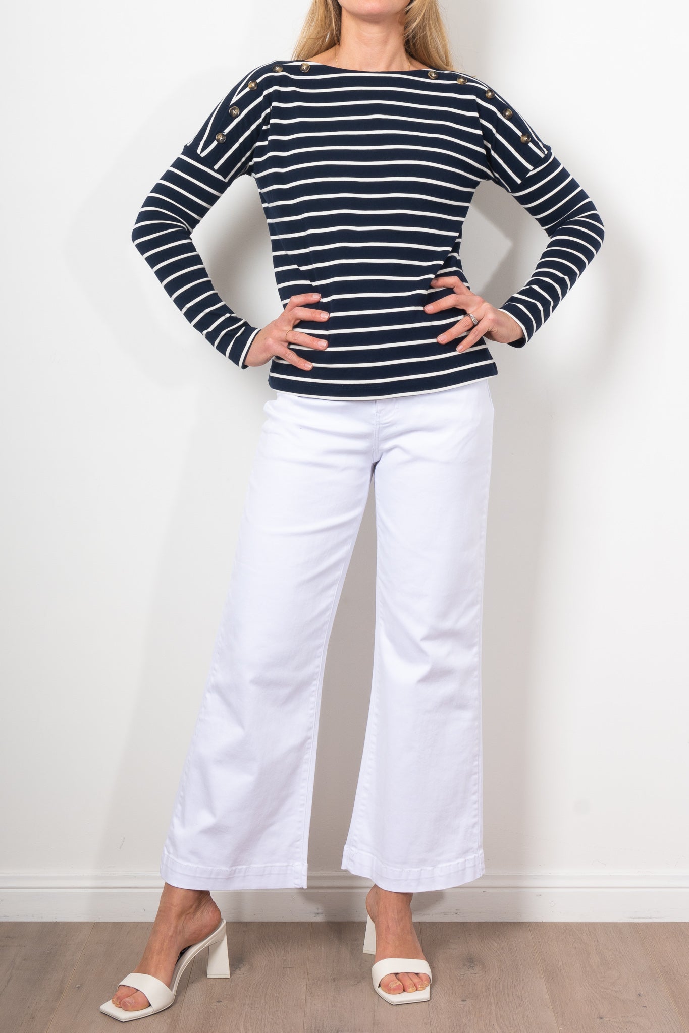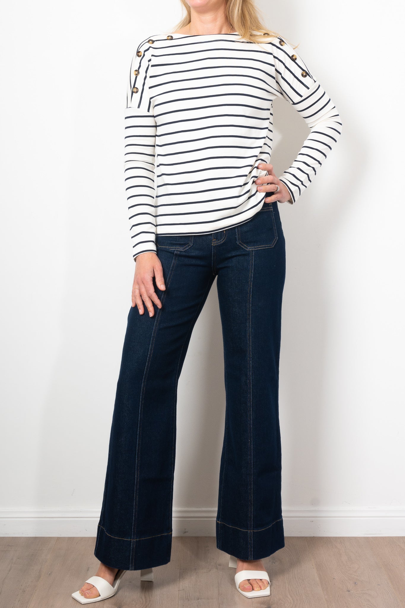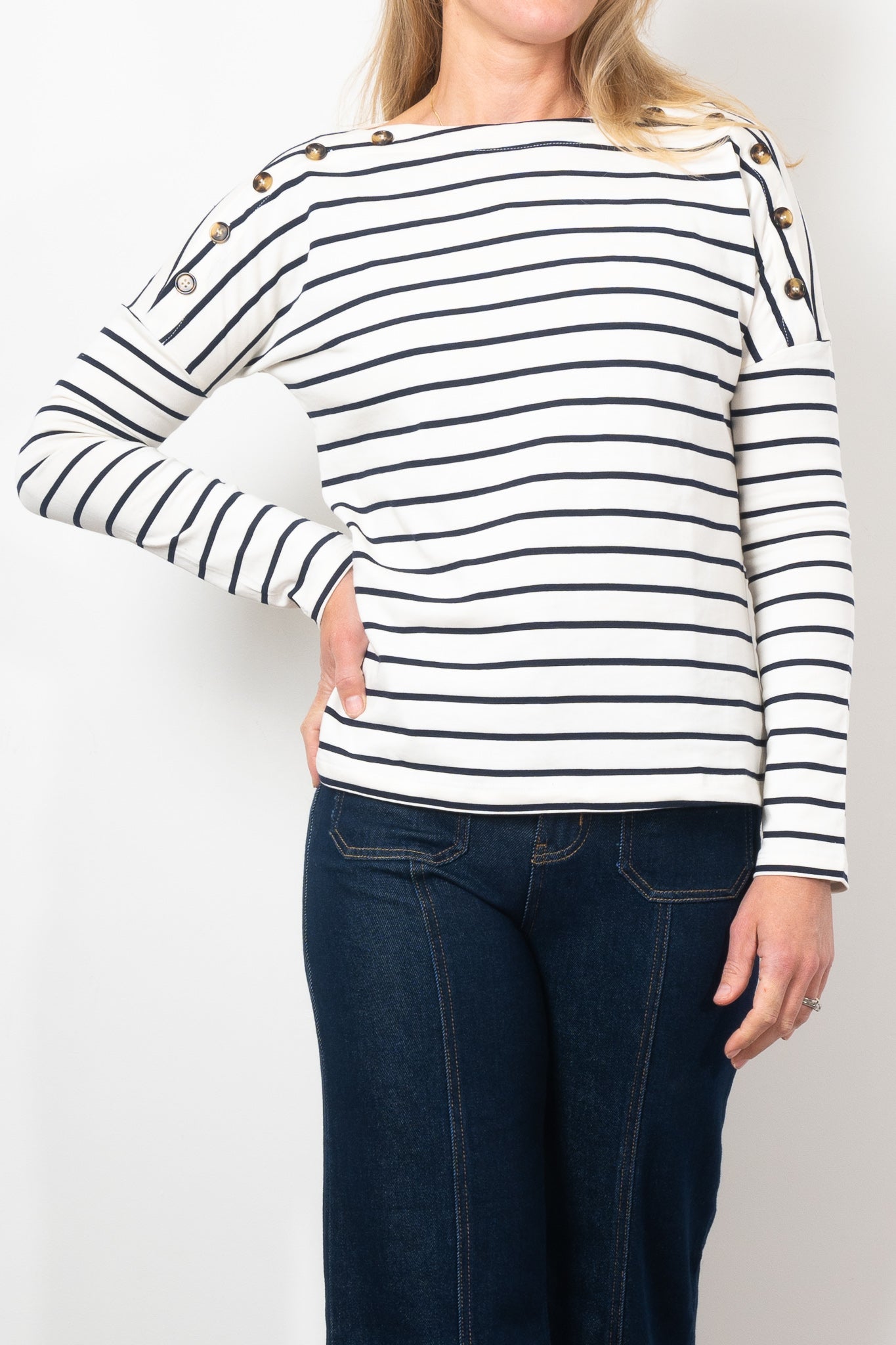Elevate your style with the Kireina Juliette Stripe Top. Classic stripes deliver Parisian chic while the boatneck, buttoned shoulders, and floaty fit add unique touches. Wear tucked in for a polished look or loose for a casual vibe. Perfect with the Freya Jeans or summer shorts.