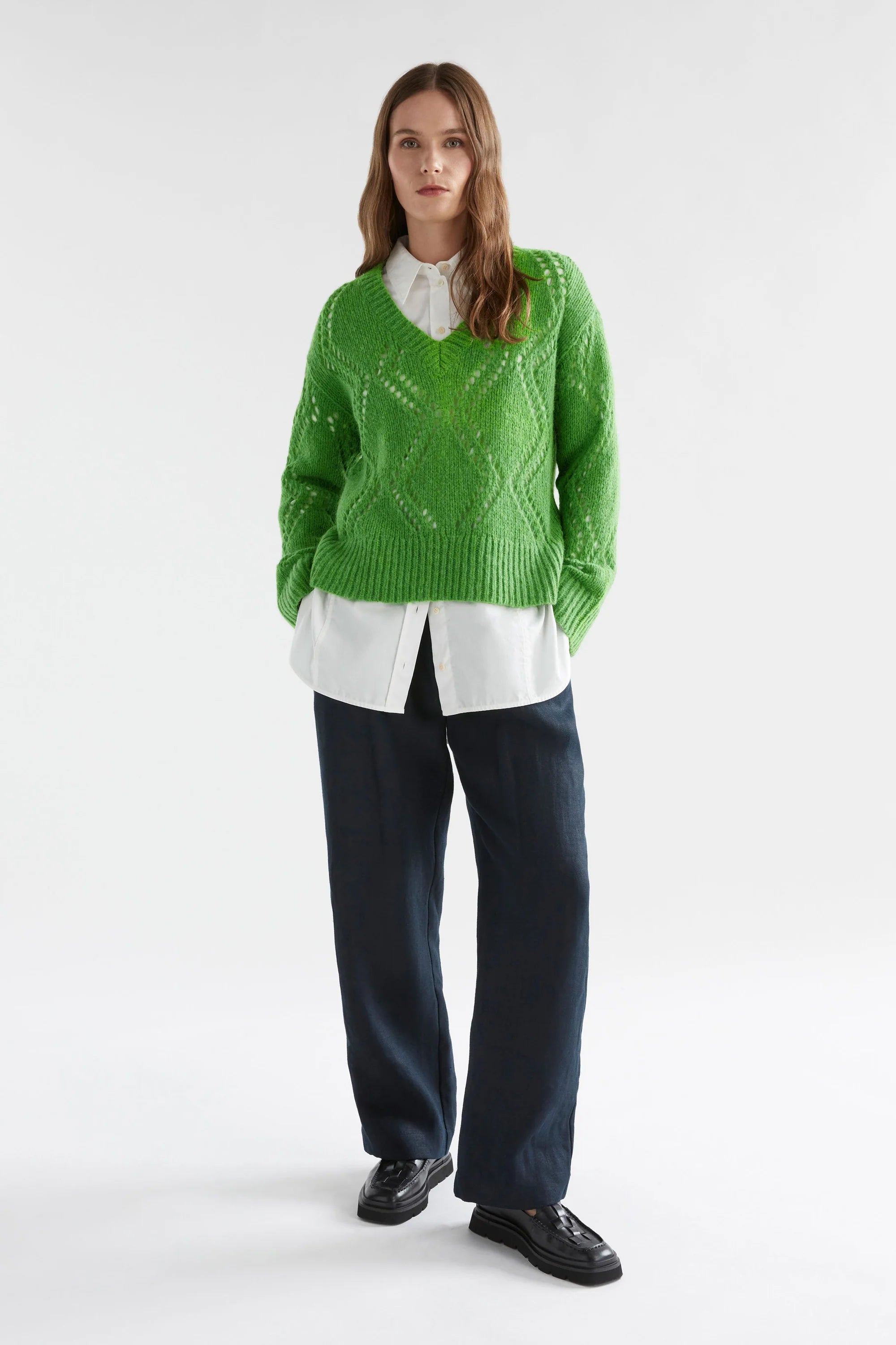 Elevate your wardrobe with the ELK Sirona Sweater. The bold argyle pointelle knit adds texture, while the ribbed v-neck and wide cuffs keep it laid-back. Made with a soft blend of recycled nylon, merino wool, and alpaca, this jumper is perfect for pairing with high-waisted styles. The cropped body and wide sleeves make it versatile and perfect for adventurous layering.