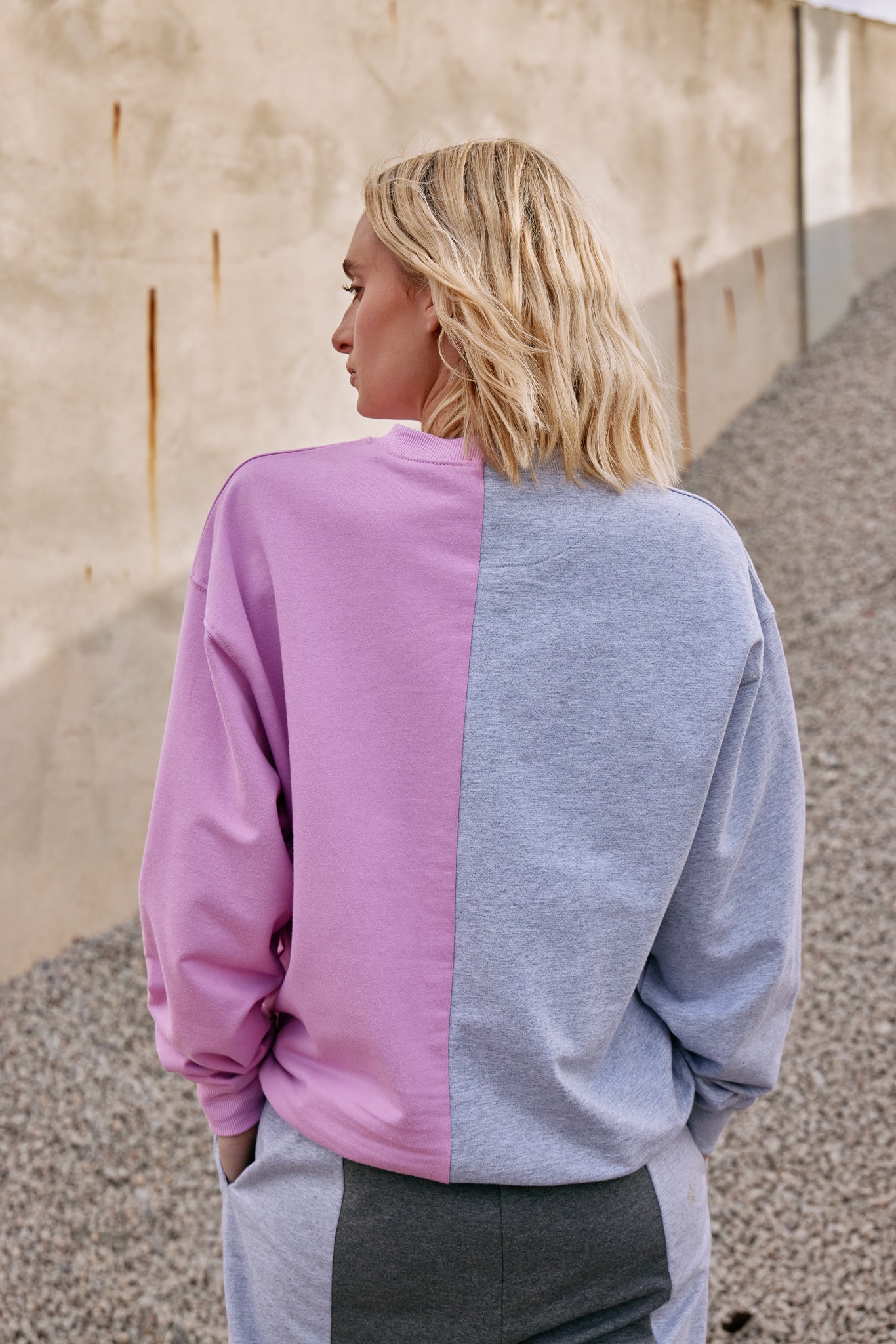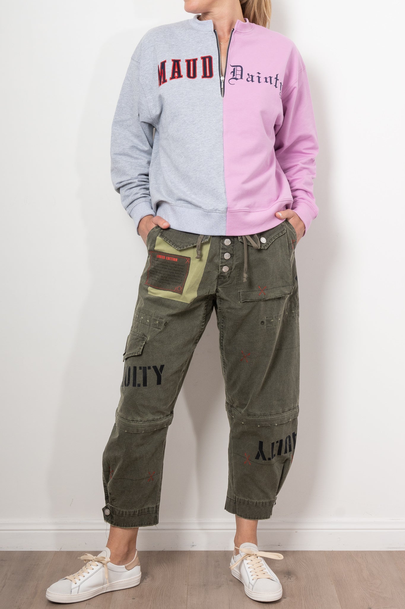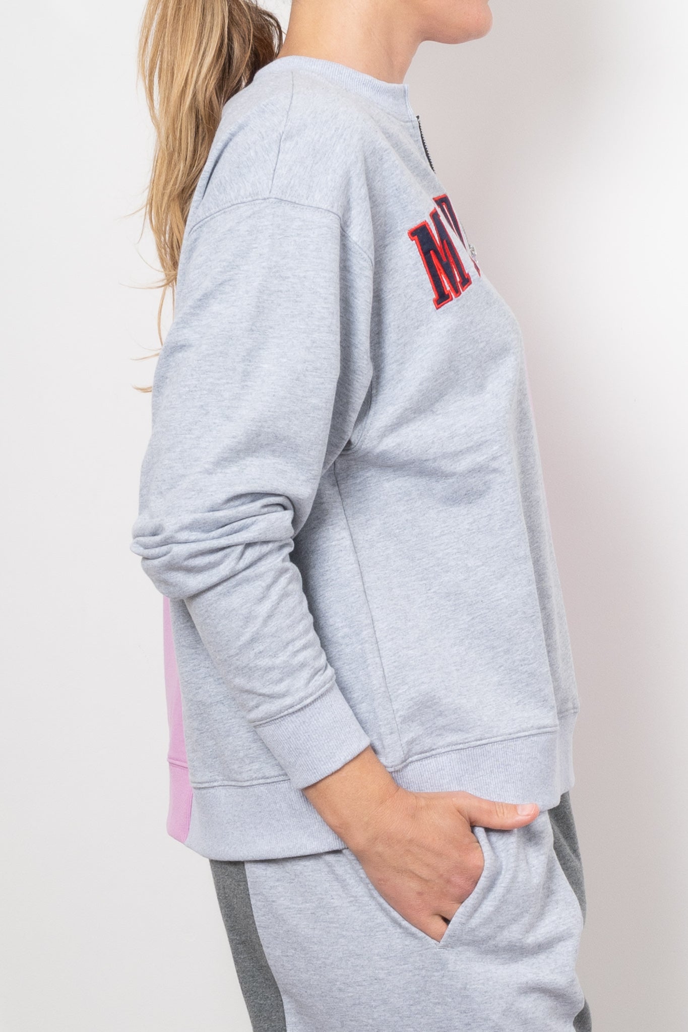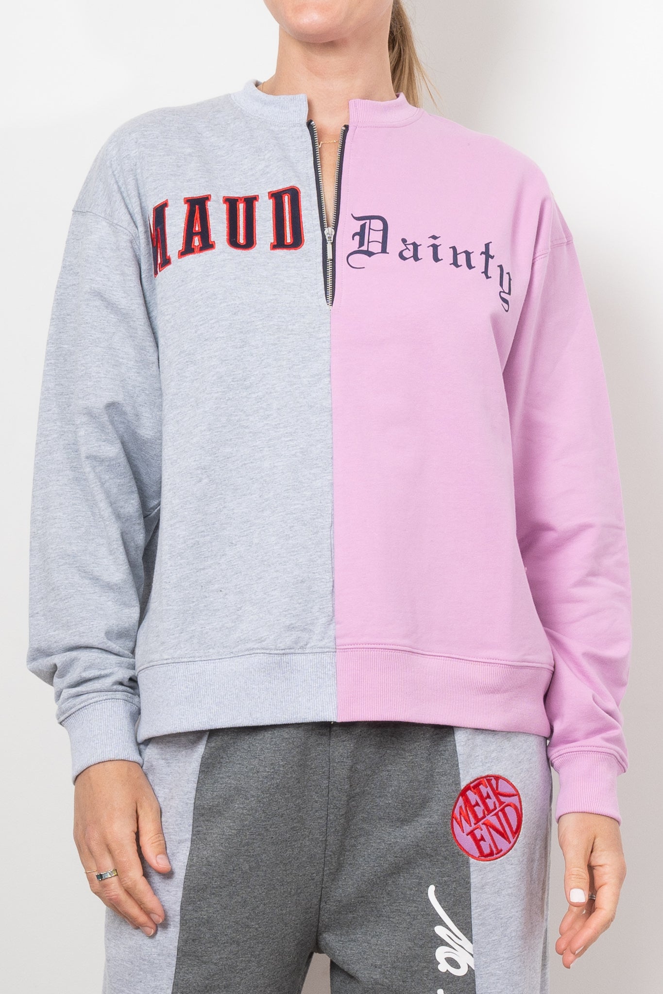 Elevate your casual wardrobe with this striking half-zip colour block jumper. Featuring a bold split design in soft pink and gray, this piece merges playful femininity with effortless cool. The contrast text embroidery adds a chic edge, making this jumper a perfect choice for those who love to stand out while staying cosy. Pair it with your favorite joggers or jeans for a laid-back yet stylish look that’s ready for anything.