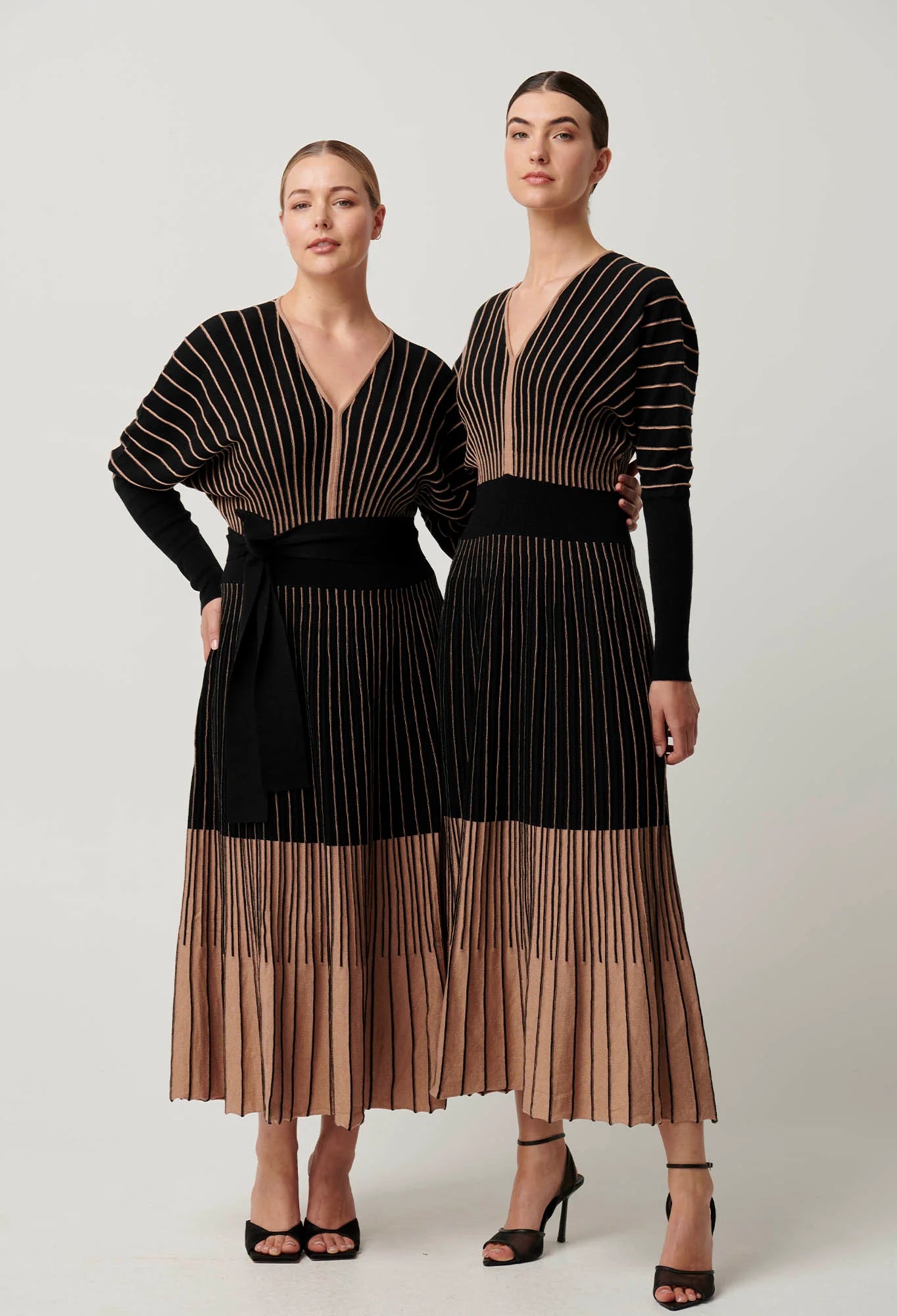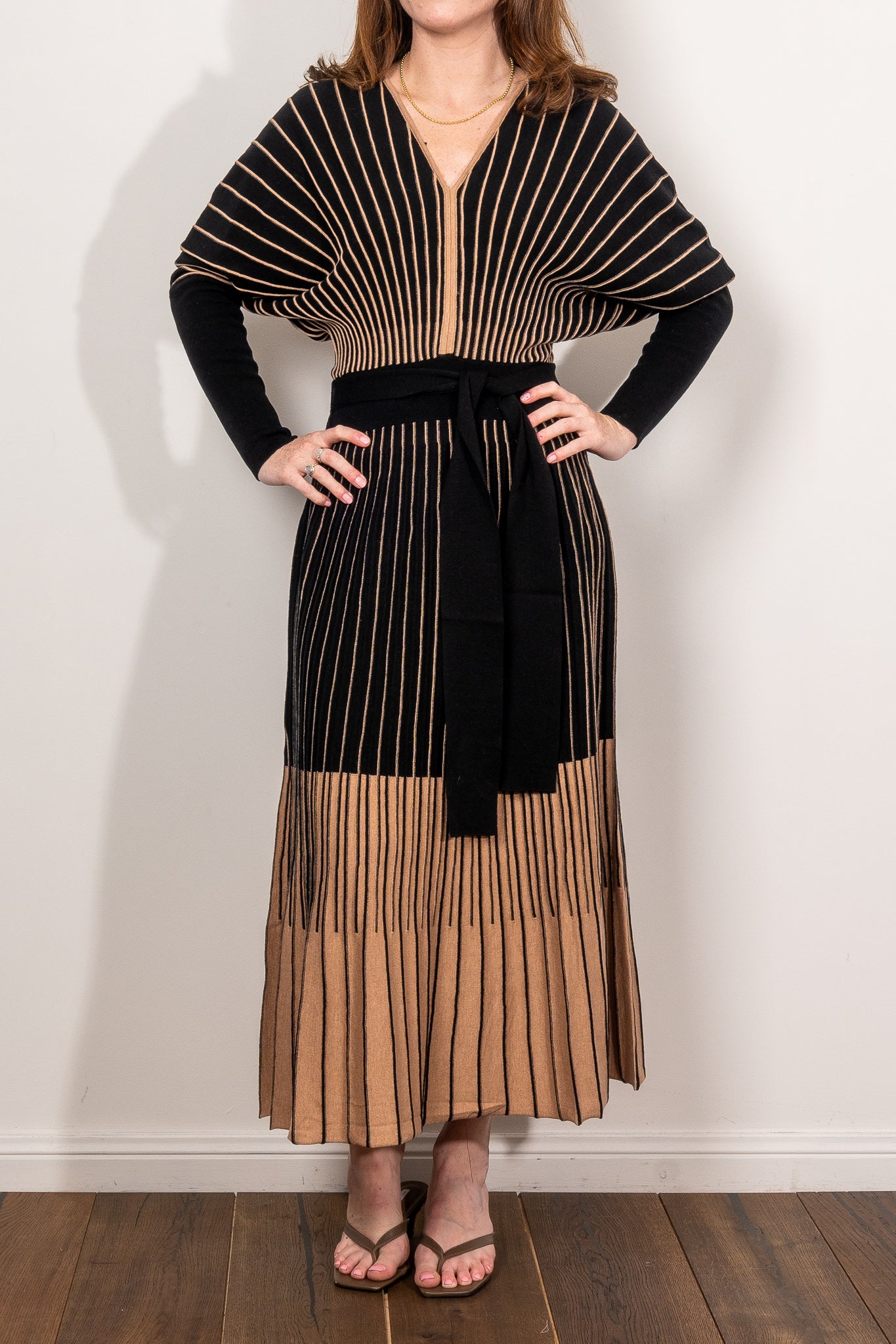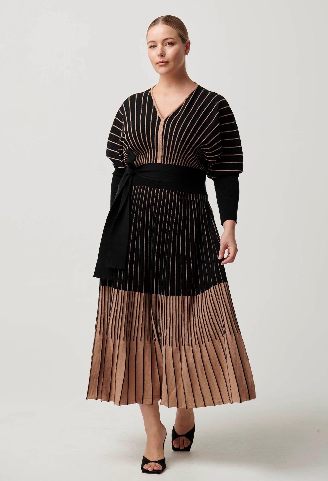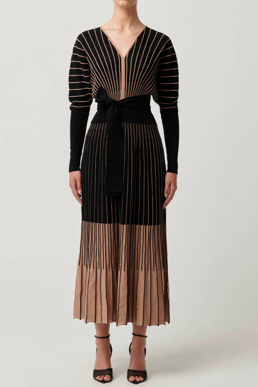 Upgrade your everyday wardrobe with the Equinox Fine Wool Ombre Stripe Dress. Made from a premium wool-cotton blend, it offers both comfort and sophistication. The ombre stripe design and pleated skirt add a touch of modernity, while the belted waist and V-neckline flatter your figure. Perfect for any occasion, day or night.