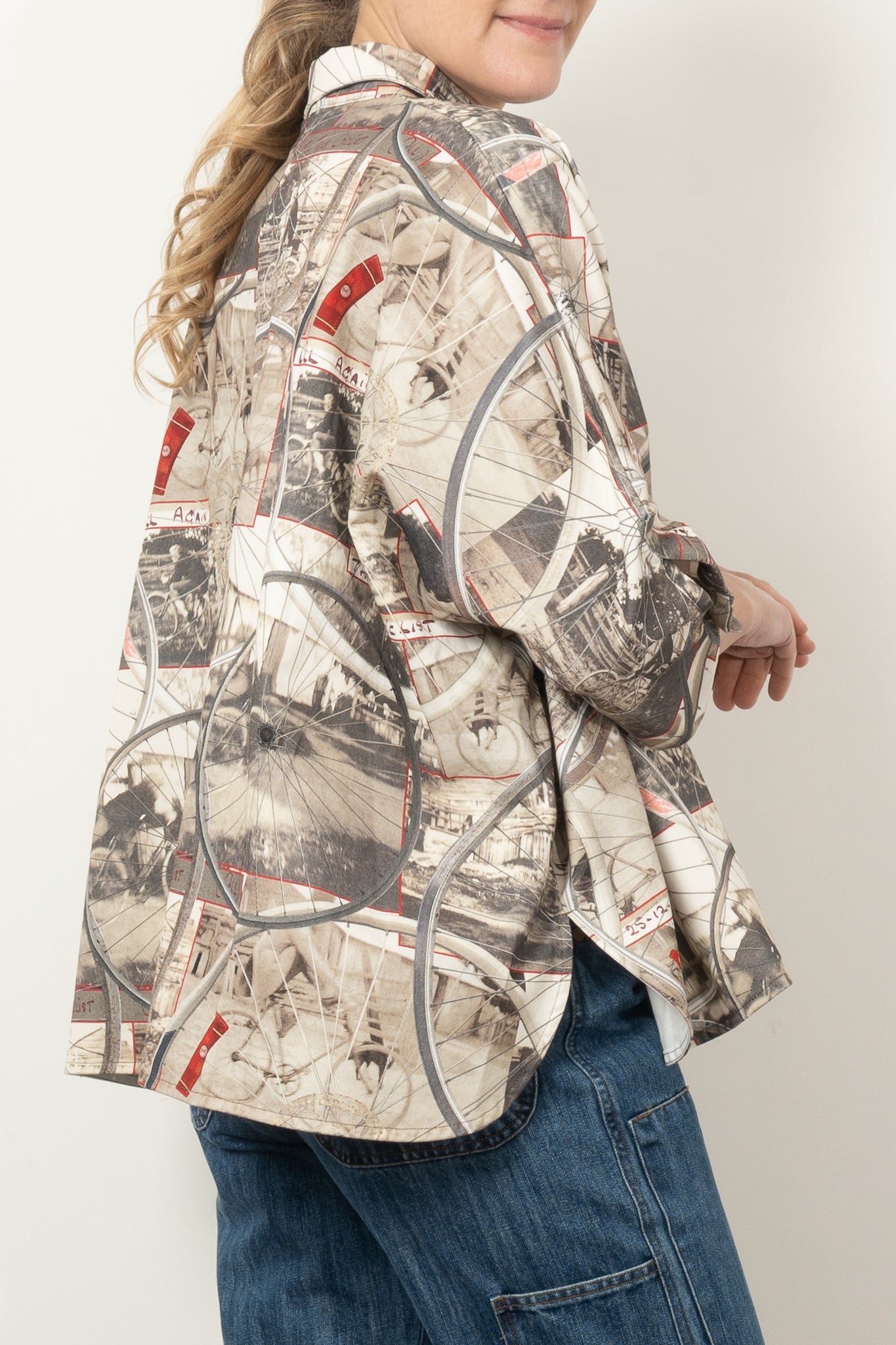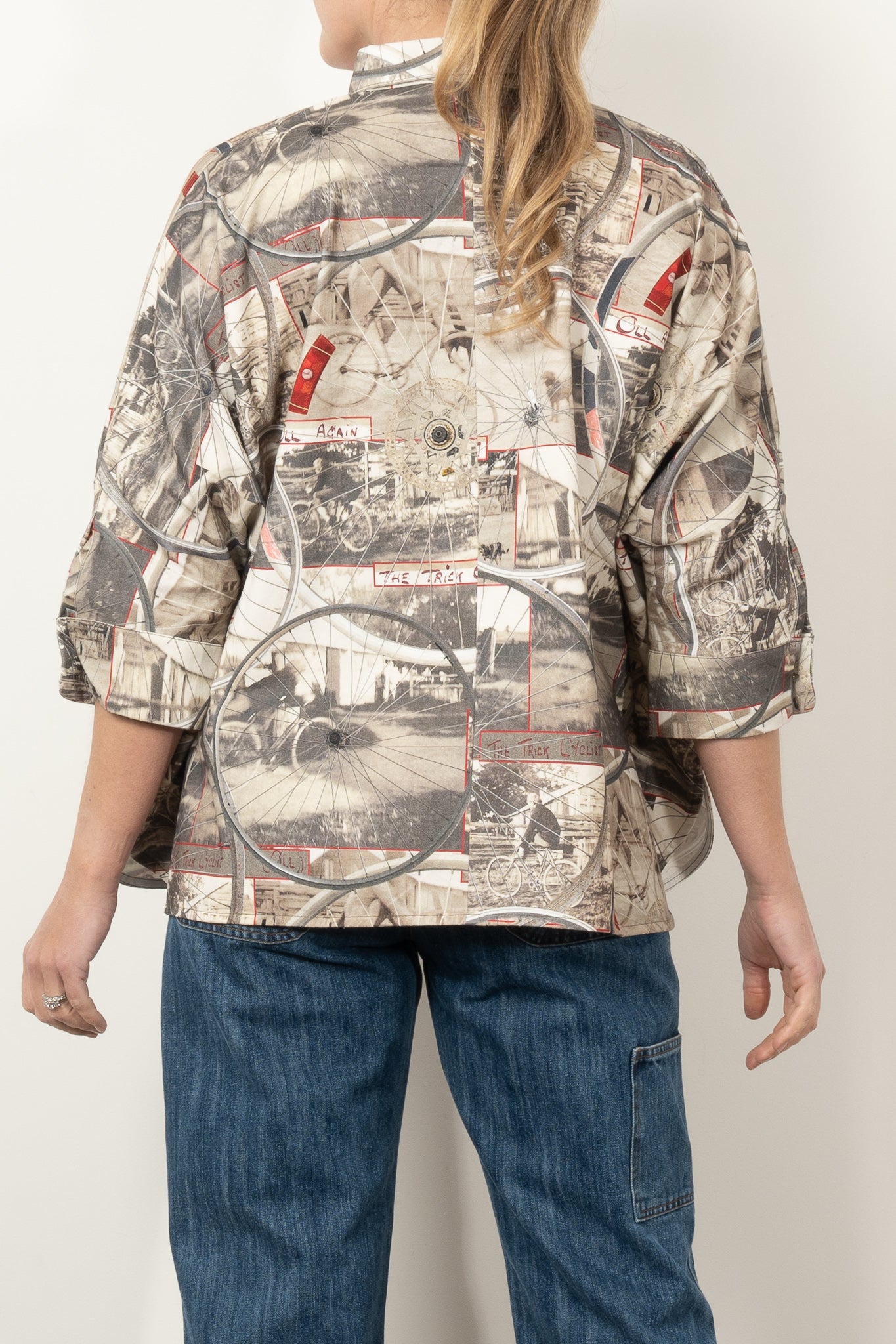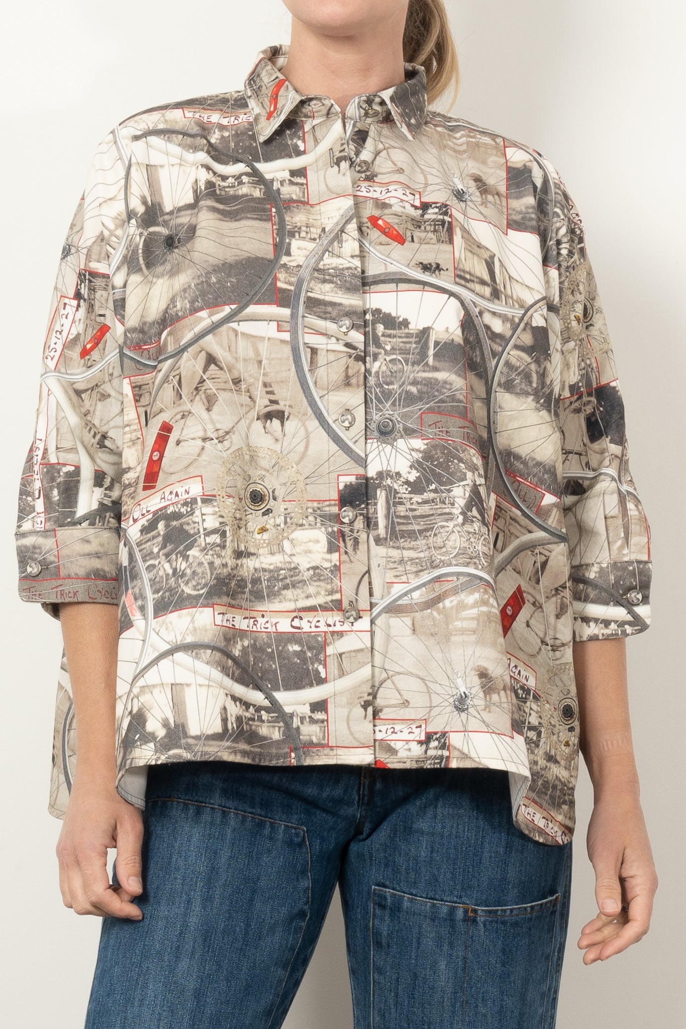 This oversized shirt is a wearable scrapbook of family nostalgia and creative storytelling. Featuring images of designer Maud's Great Uncle Oli—captured in 1927 and affectionately dubbed The Trick Cyclist—the print layers vintage cycling photos with hand-drawn detailing and wheel motifs from Circular’s own display installations.