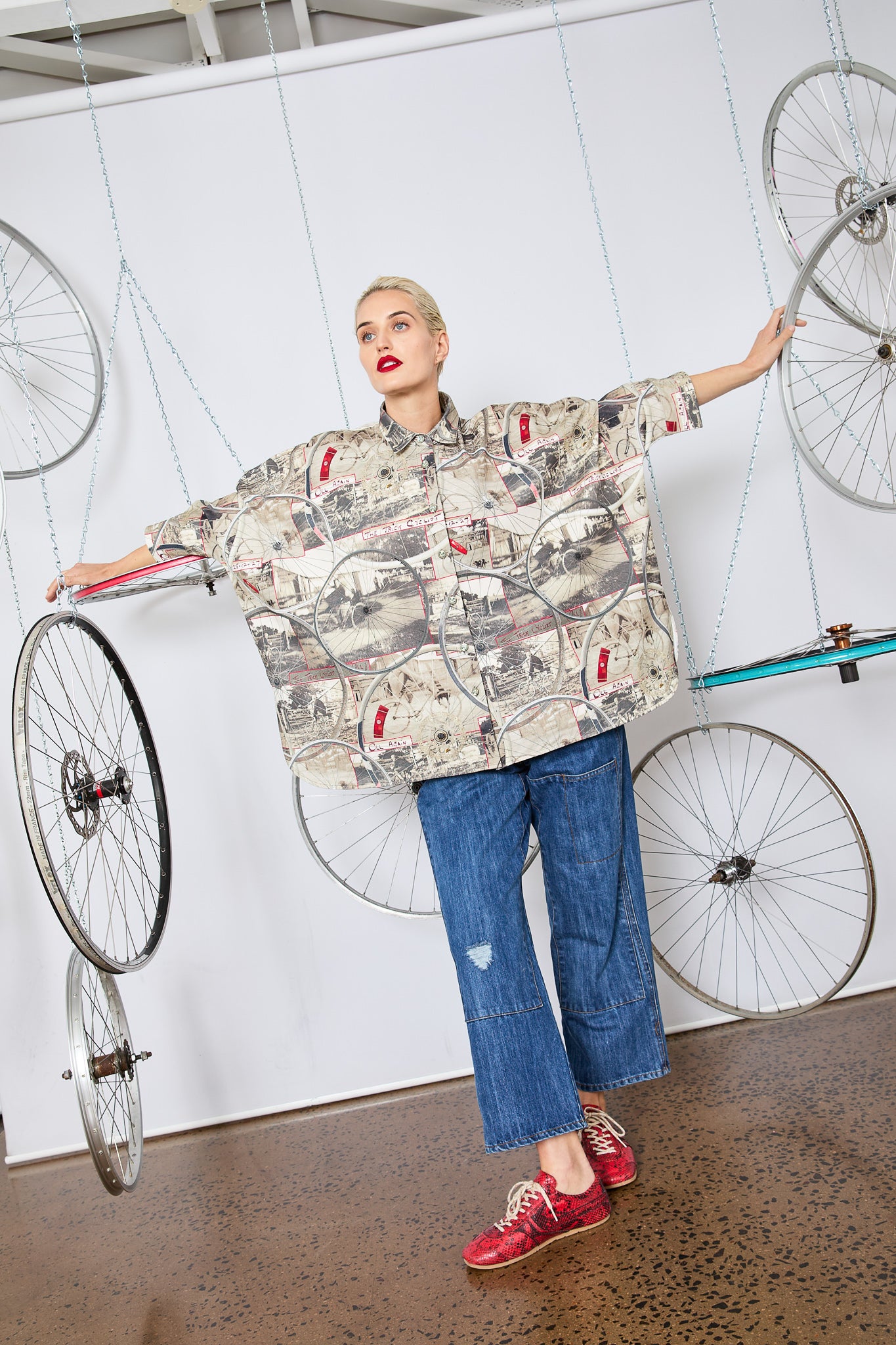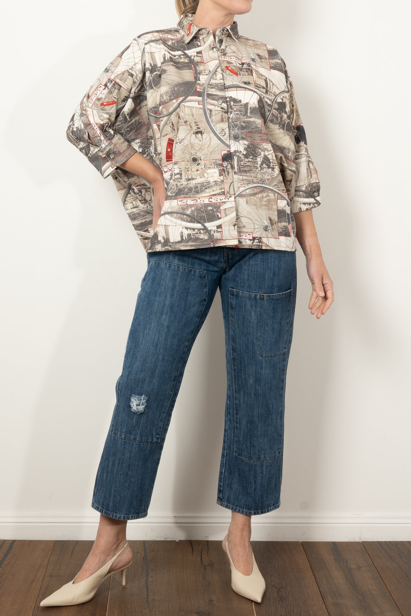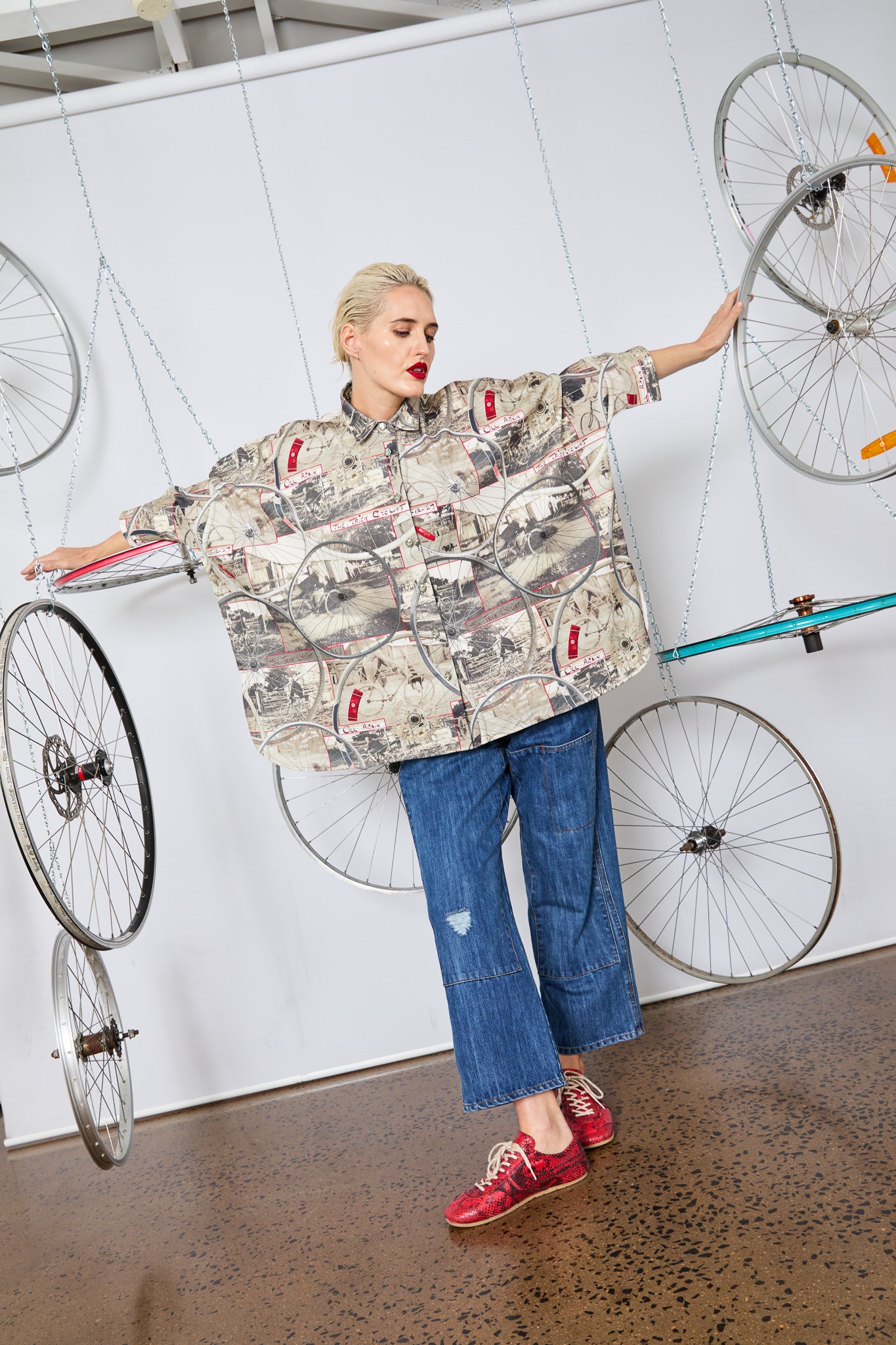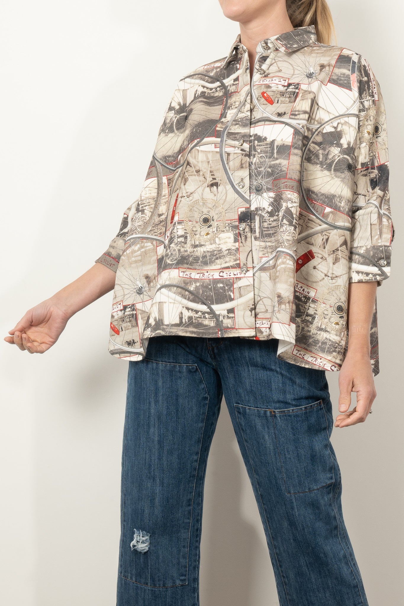This oversized shirt is a wearable scrapbook of family nostalgia and creative storytelling. Featuring images of designer Maud's Great Uncle Oli—captured in 1927 and affectionately dubbed The Trick Cyclist—the print layers vintage cycling photos with hand-drawn detailing and wheel motifs from Circular’s own display installations.