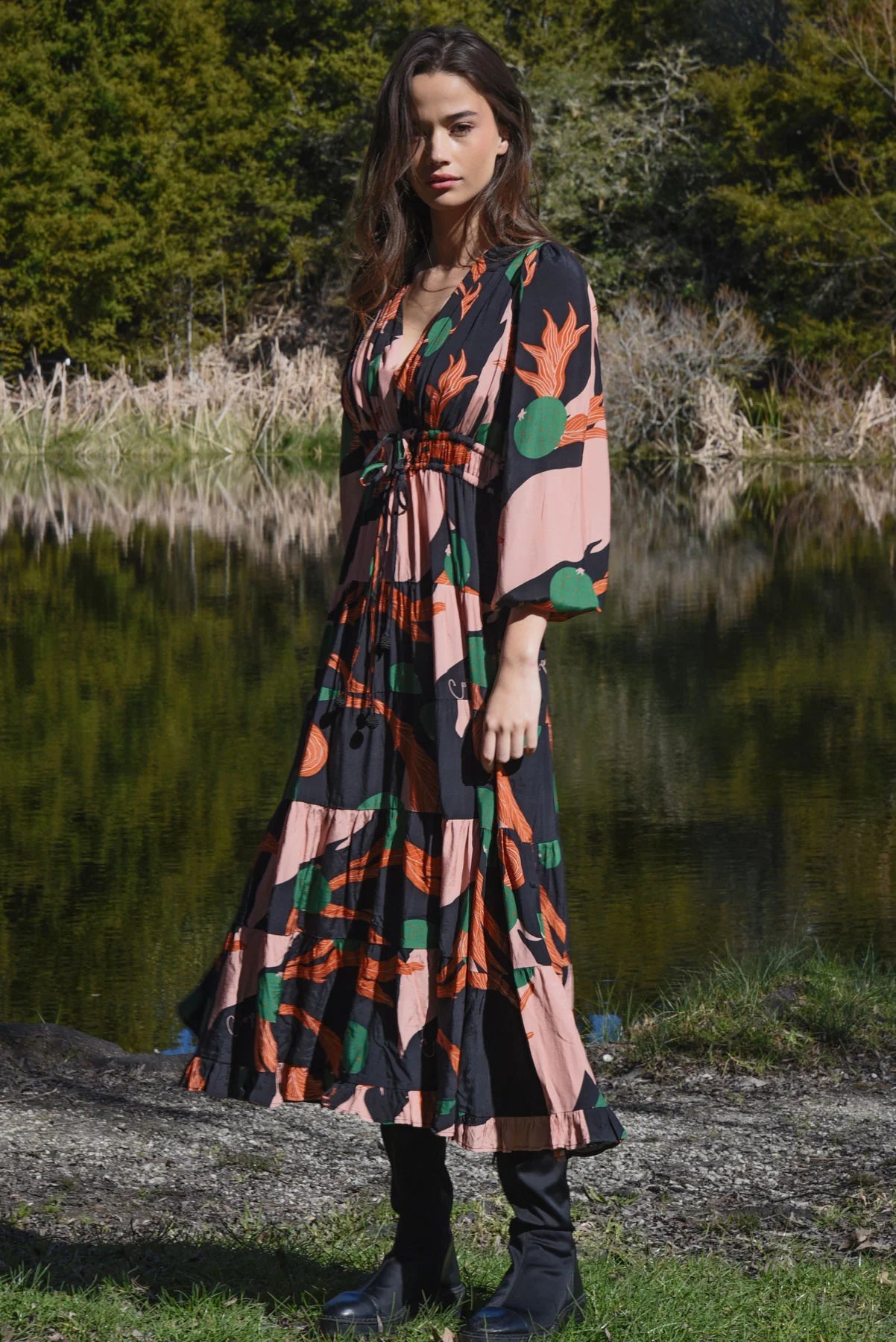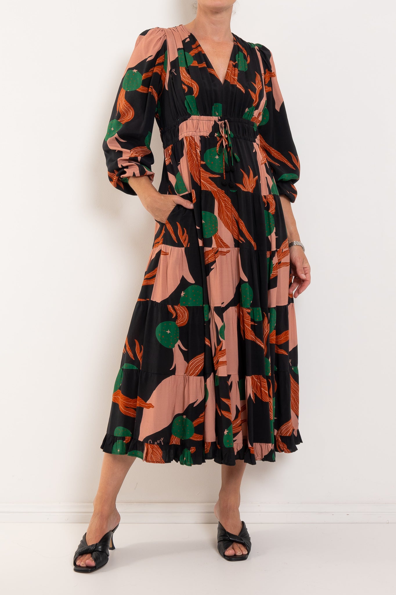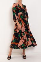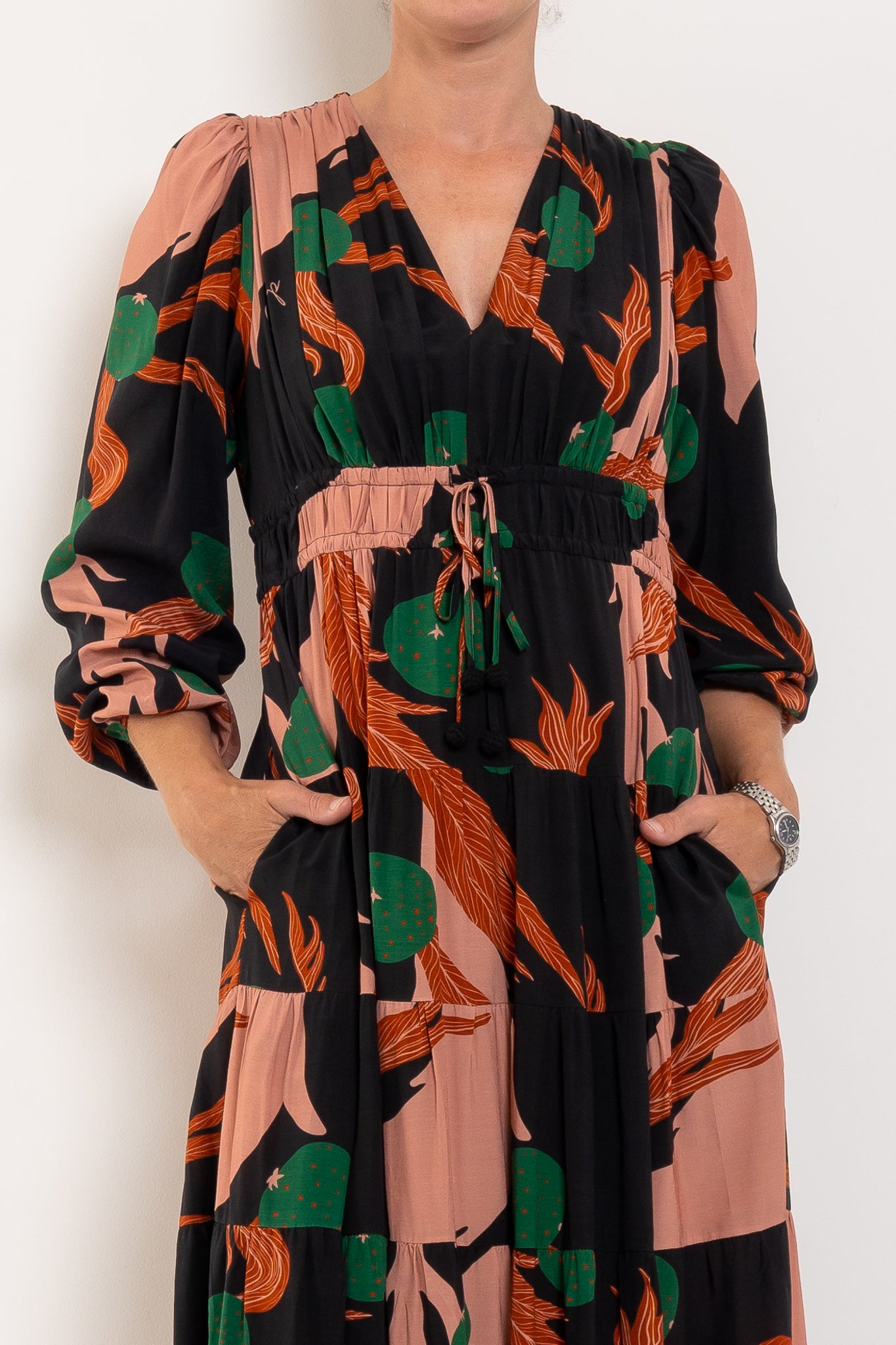 A bold abstract print sets the tone for ‘The Ruche Is On’ dress in 'Berry Unexpected' viscose blend. Framed by a flattering V-neckline, it features a double drawstring waist for adjustable shape, blouson sleeves with elasticated cuffs, a softly tiered skirt, and side pockets for effortless, everyday ease.