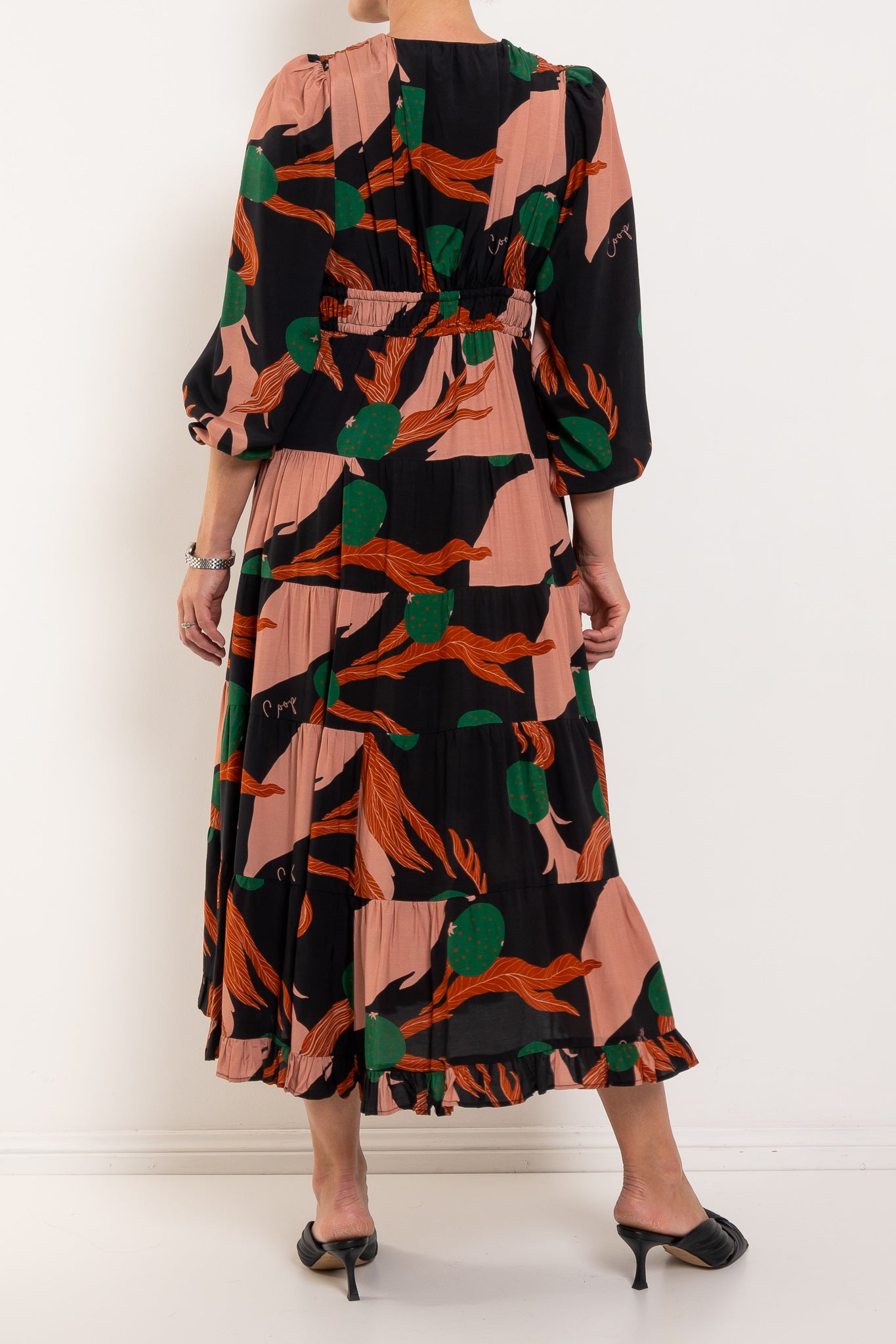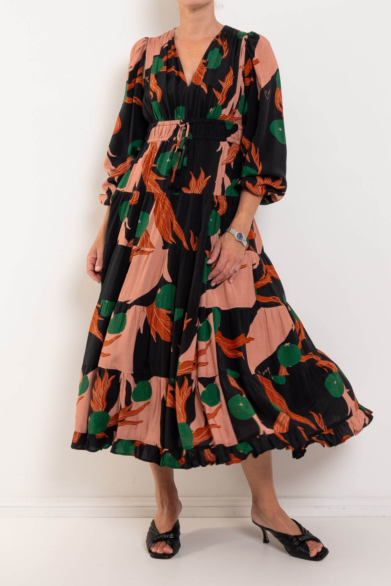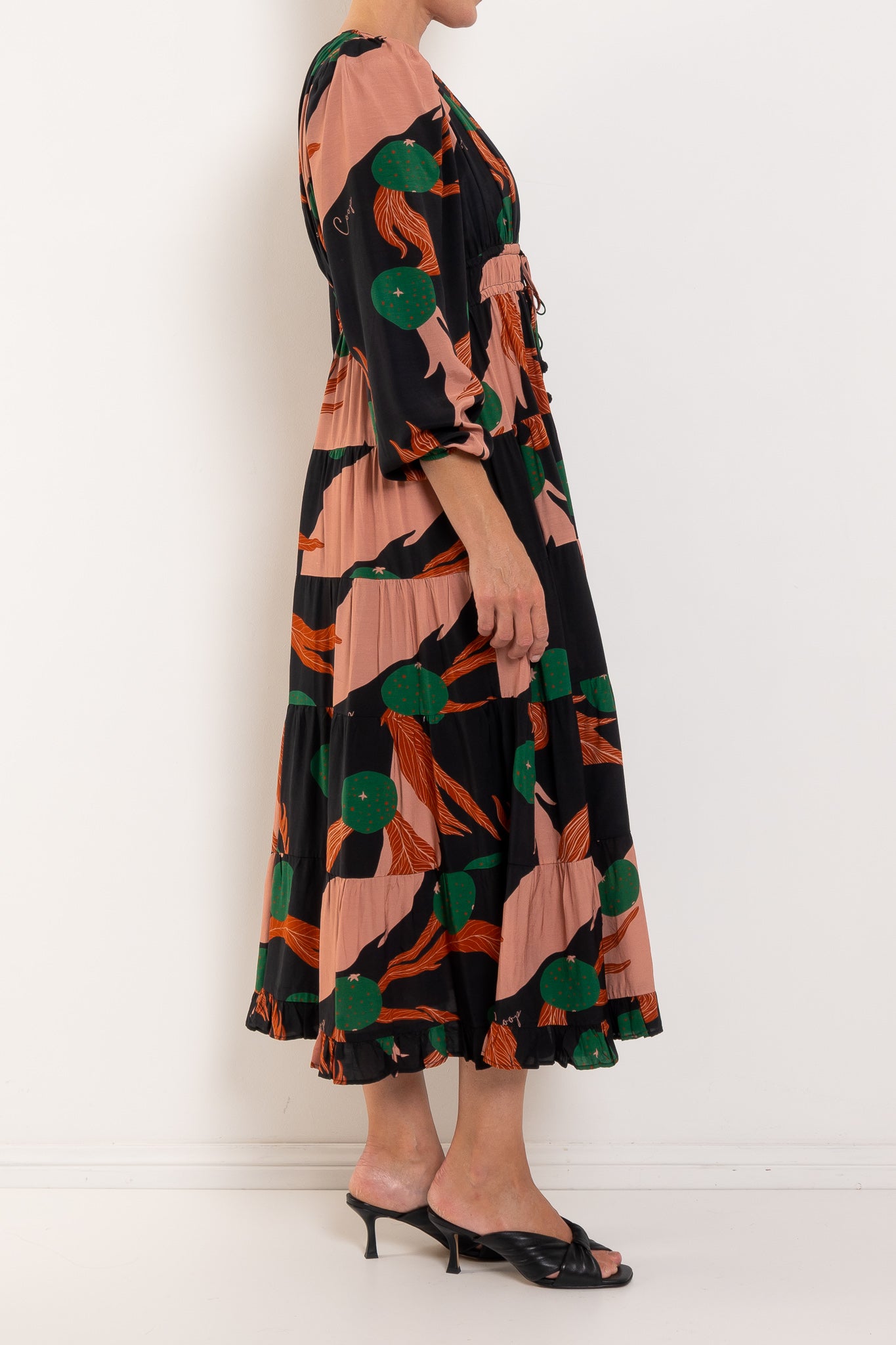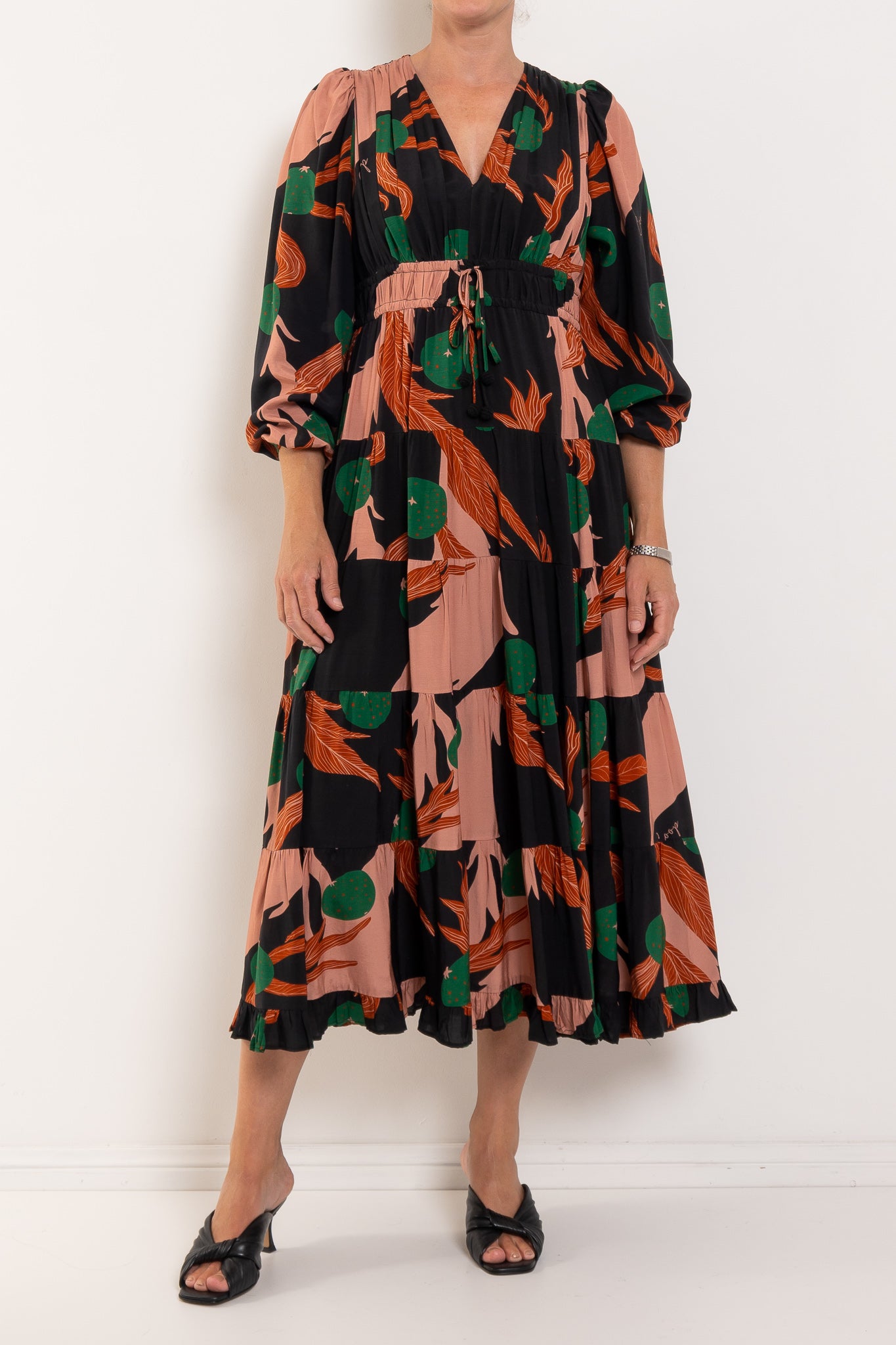 A bold abstract print sets the tone for ‘The Ruche Is On’ dress in 'Berry Unexpected' viscose blend. Framed by a flattering V-neckline, it features a double drawstring waist for adjustable shape, blouson sleeves with elasticated cuffs, a softly tiered skirt, and side pockets for effortless, everyday ease.