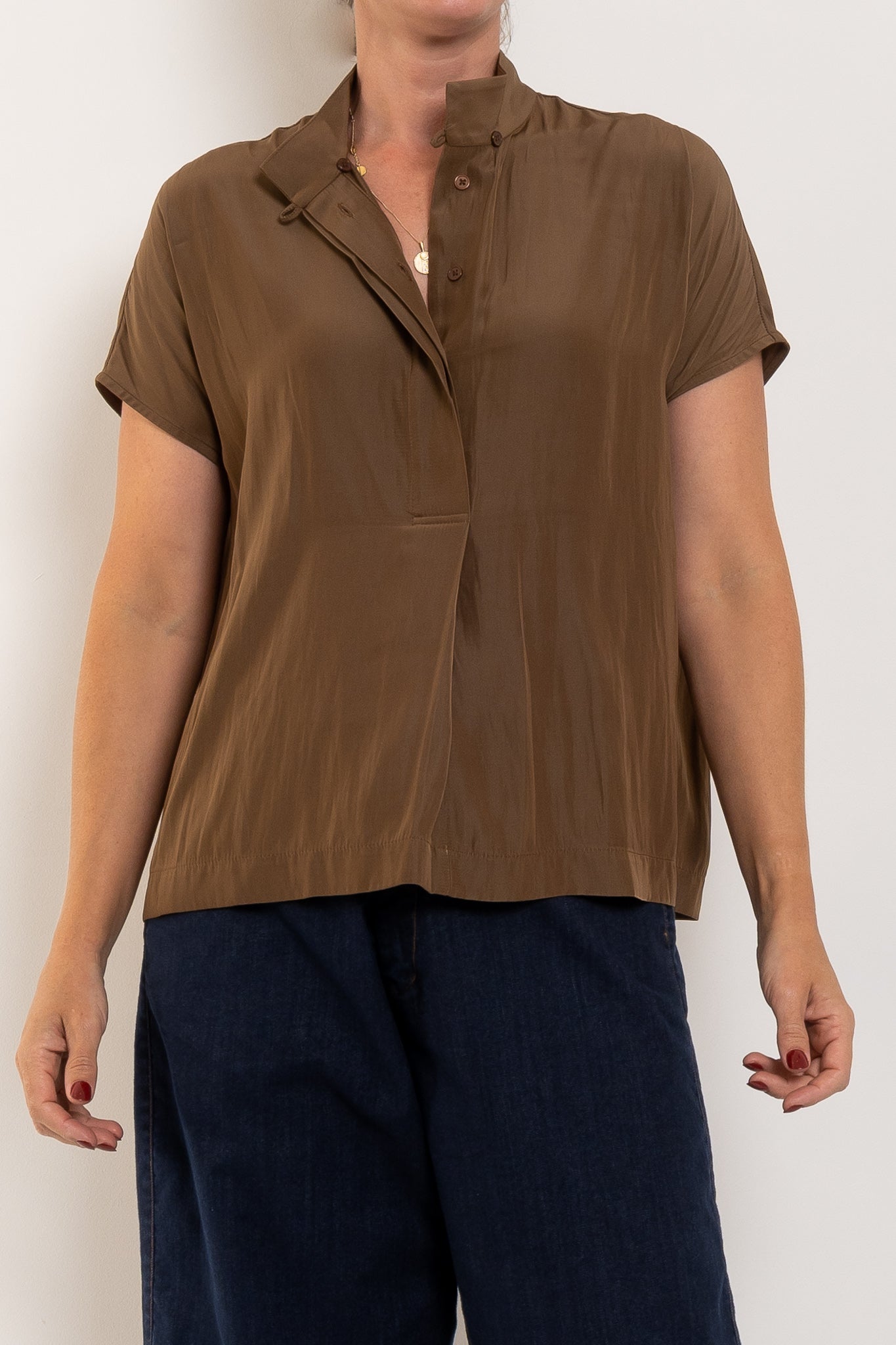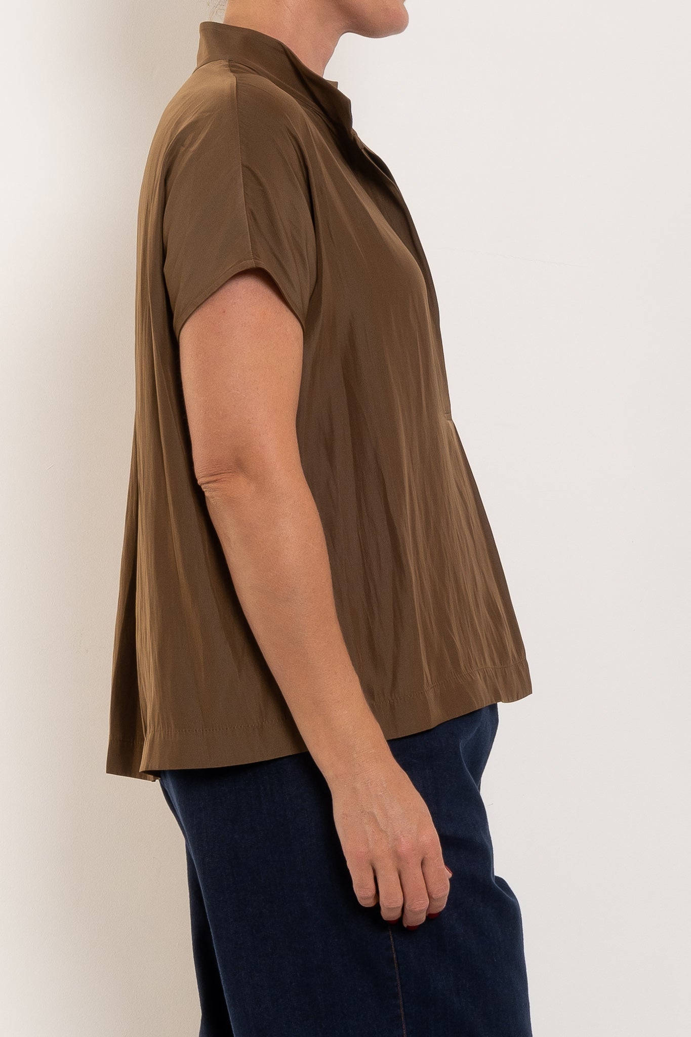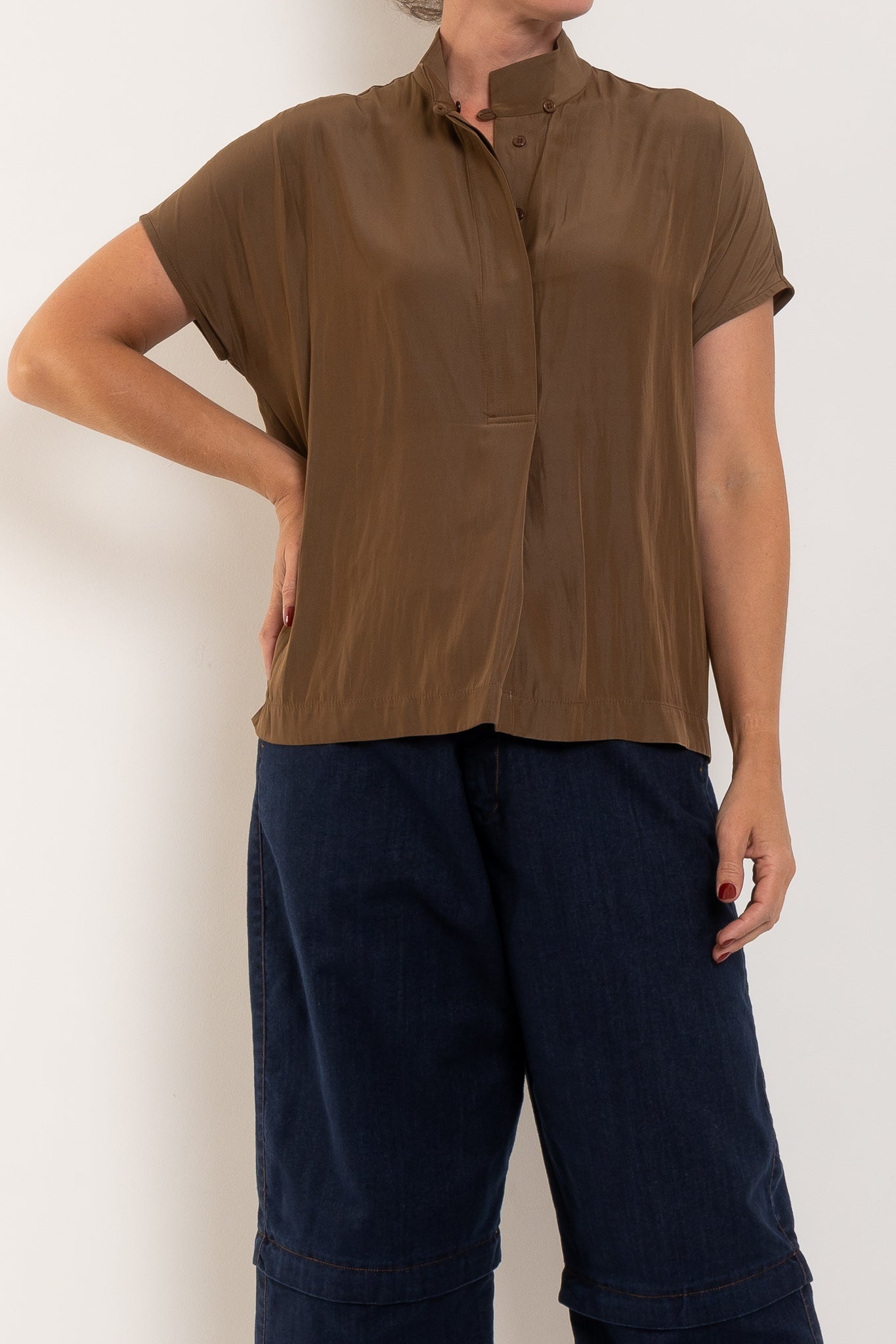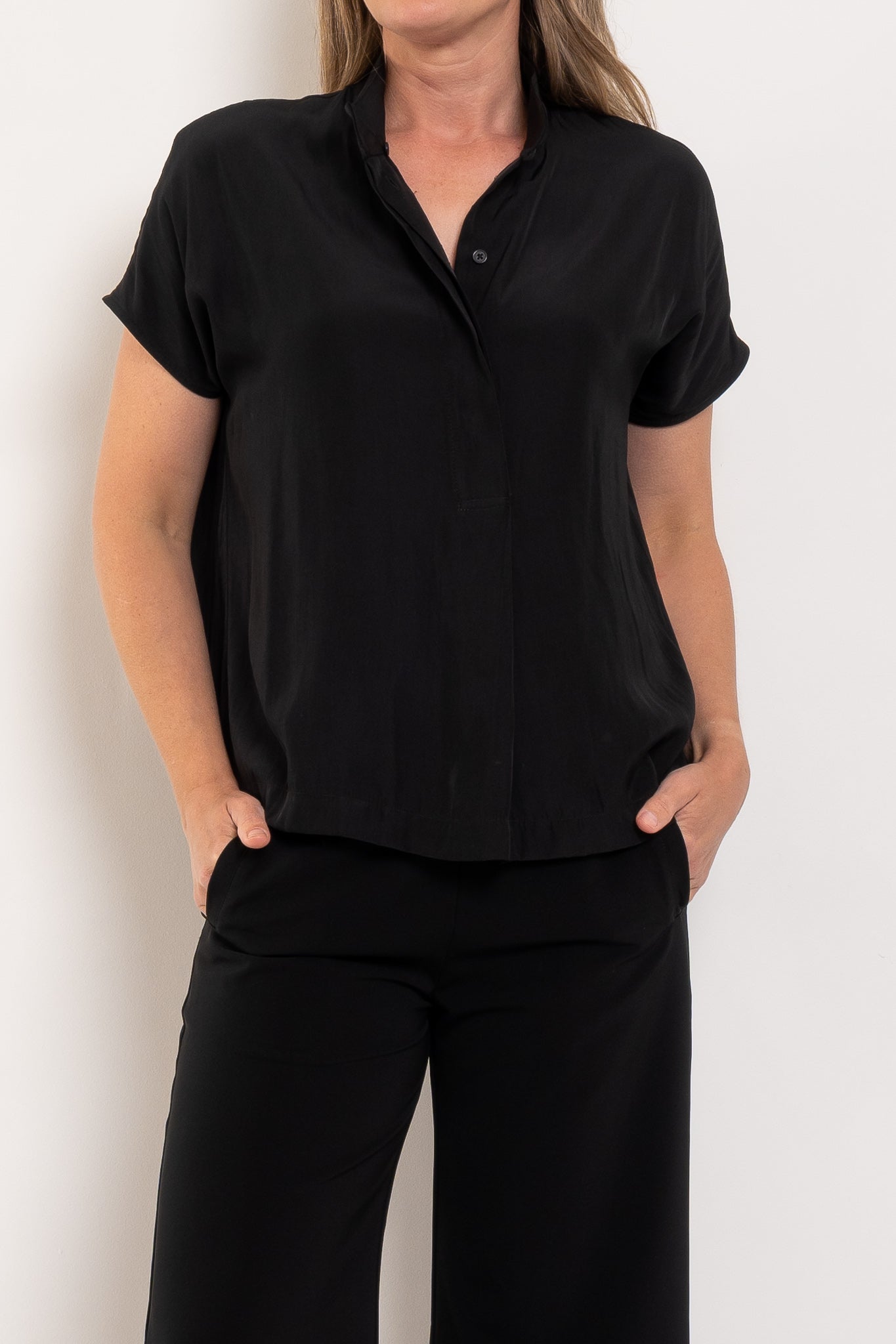 Crafted from Mela Purdie’s signature Mache fabric, this woven top has a smooth, lightly lustrous finish with a relaxed drape that skims the body without clinging. The funnel neckline and delicate button closure add a modern, elevated touch, while the capped sleeves make it ideal for wearing on its own now and layered under jackets and knits as cooler weather arrives. It’s one of those versatile pieces that instantly makes an outfit feel considered.