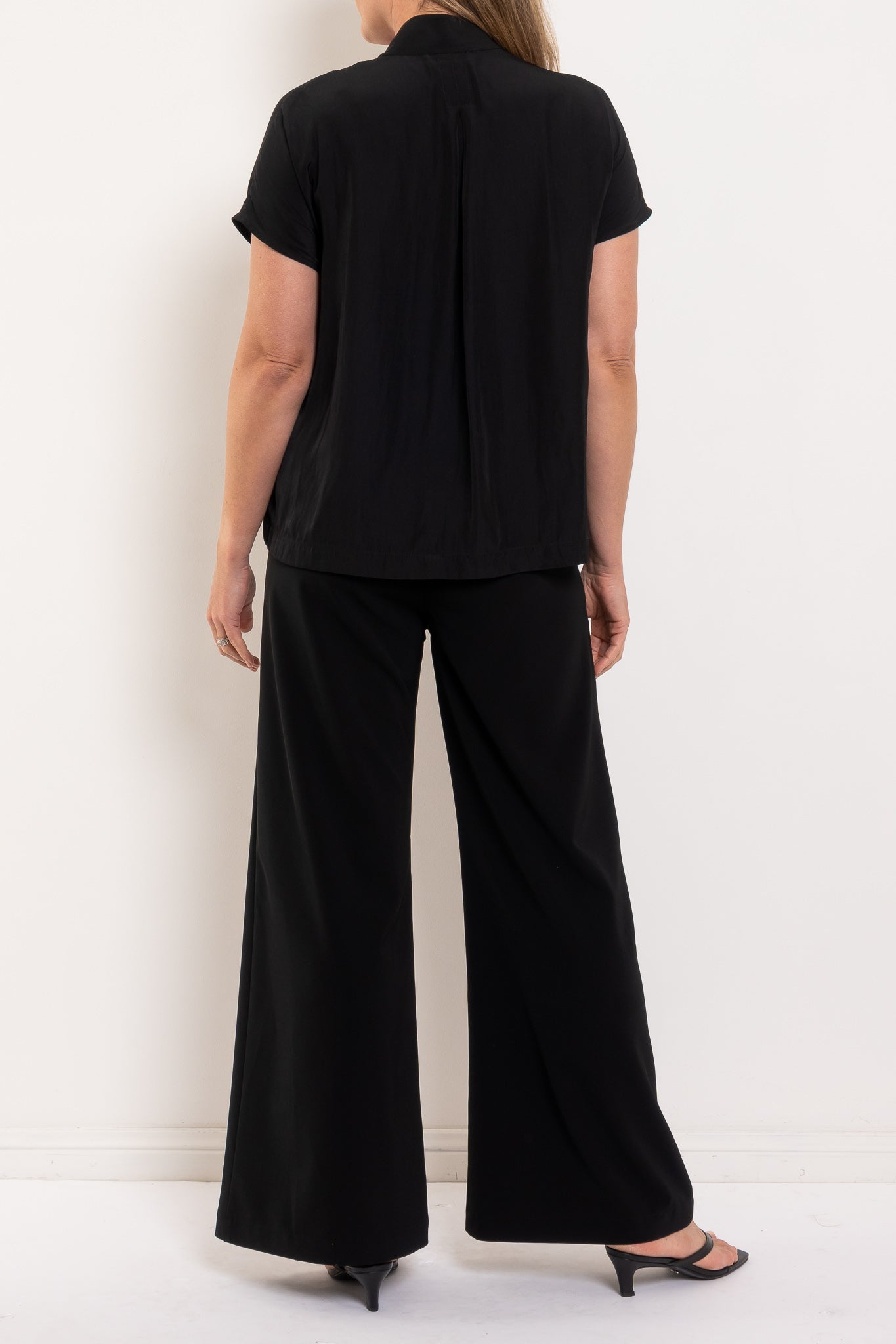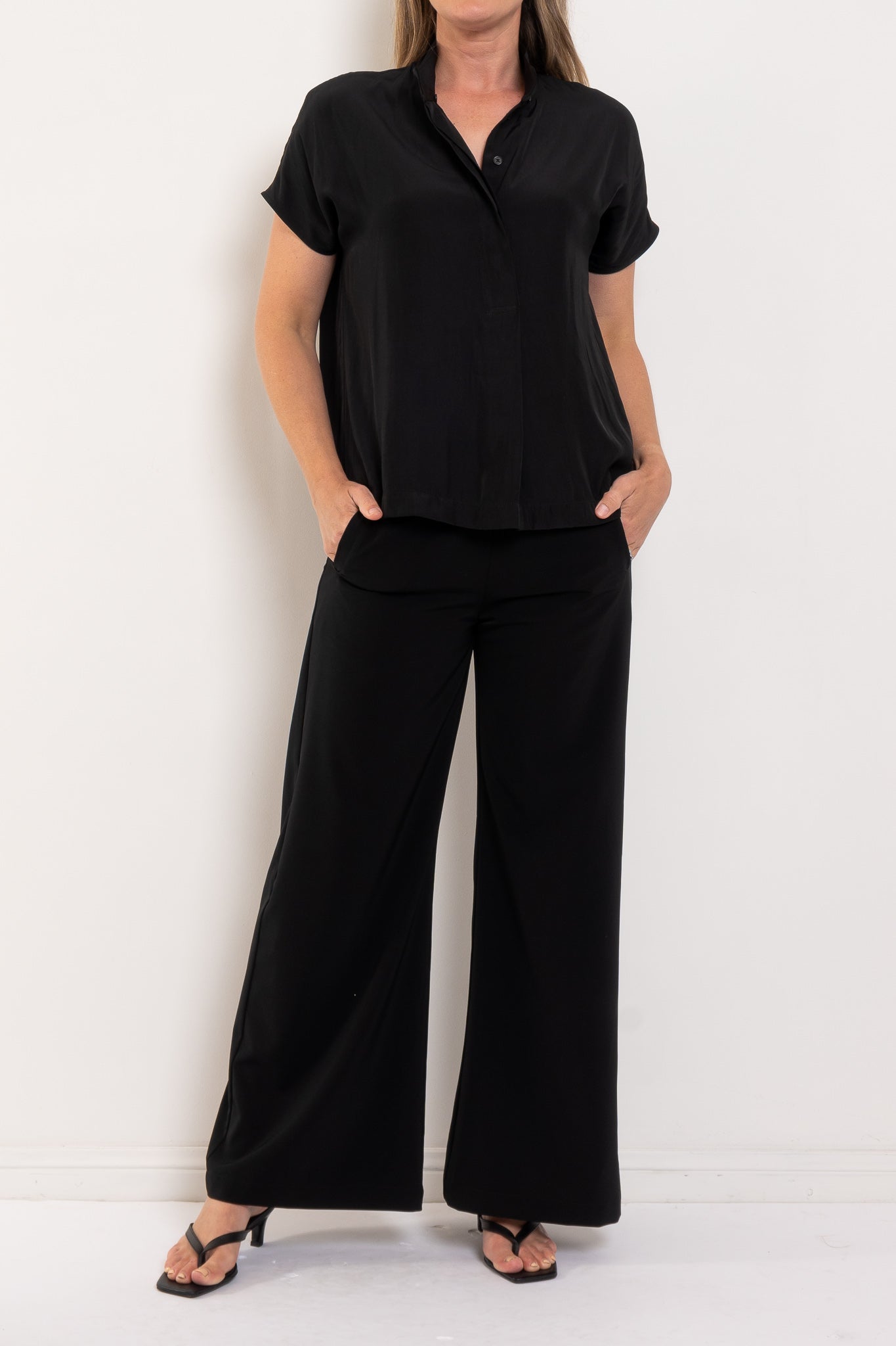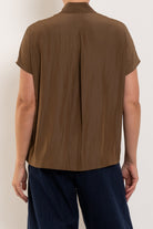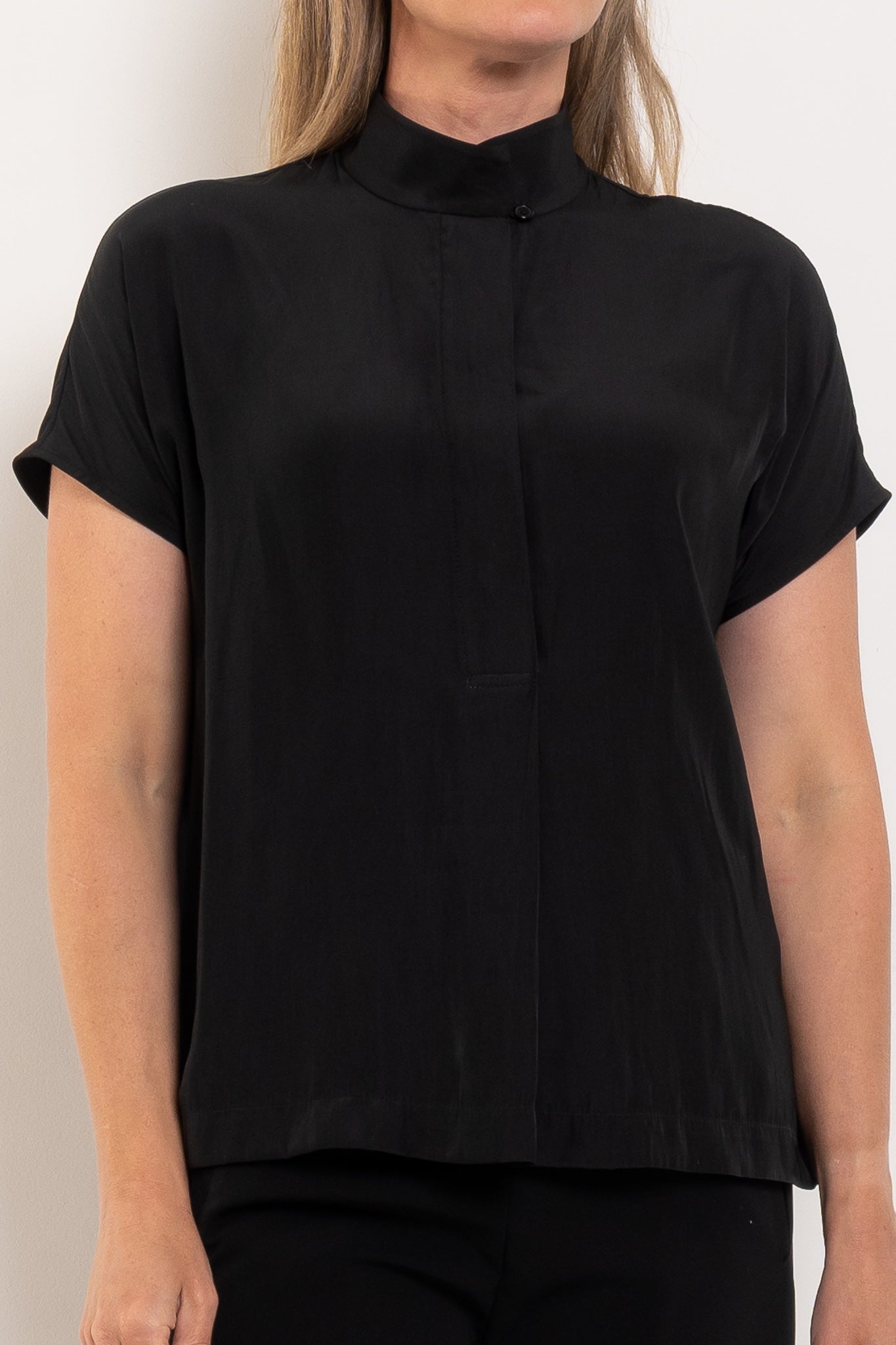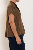 Crafted from Mela Purdie’s signature Mache fabric, this woven top has a smooth, lightly lustrous finish with a relaxed drape that skims the body without clinging. The funnel neckline and delicate button closure add a modern, elevated touch, while the capped sleeves make it ideal for wearing on its own now and layered under jackets and knits as cooler weather arrives. It’s one of those versatile pieces that instantly makes an outfit feel considered.