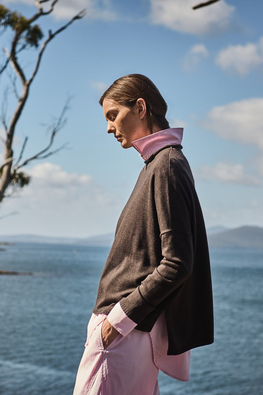 Crafted from Mela Purdie’s signature Double Fine Merino, the Panama Sweater offers lightweight warmth with a beautifully soft, fluid feel. The relaxed boxy fit and low–high hem create natural movement through the body, making it ideal for layering over shirts without feeling bulky or restrictive.
