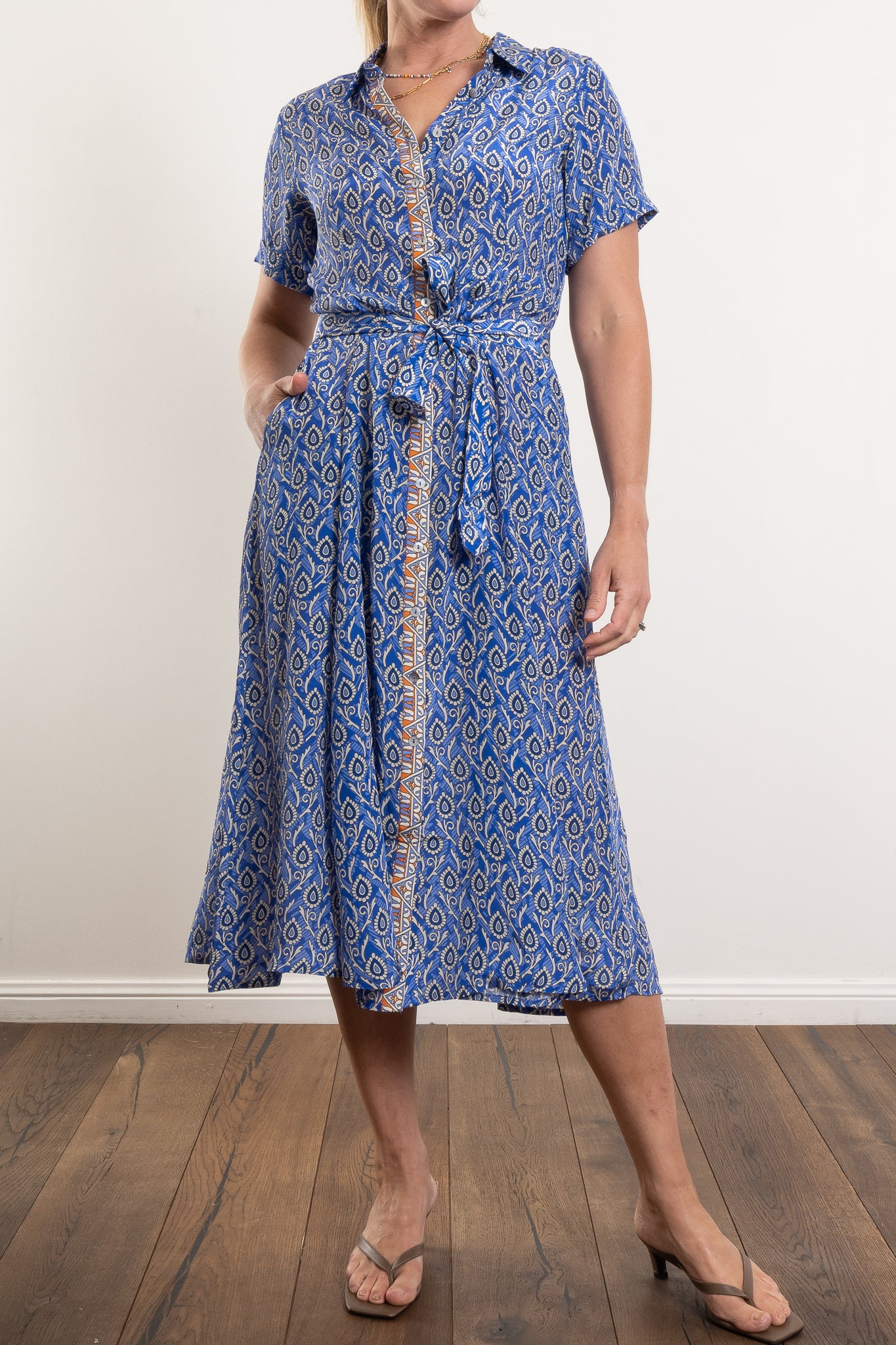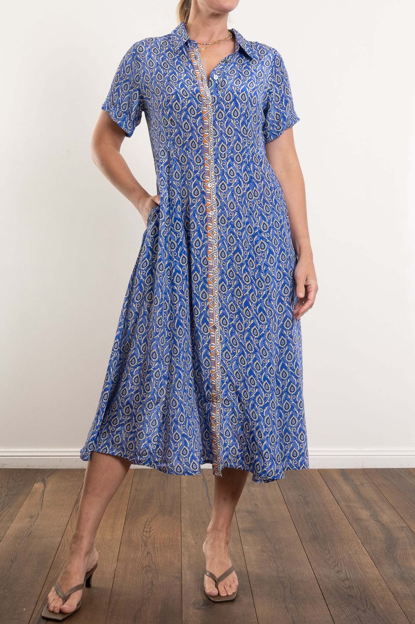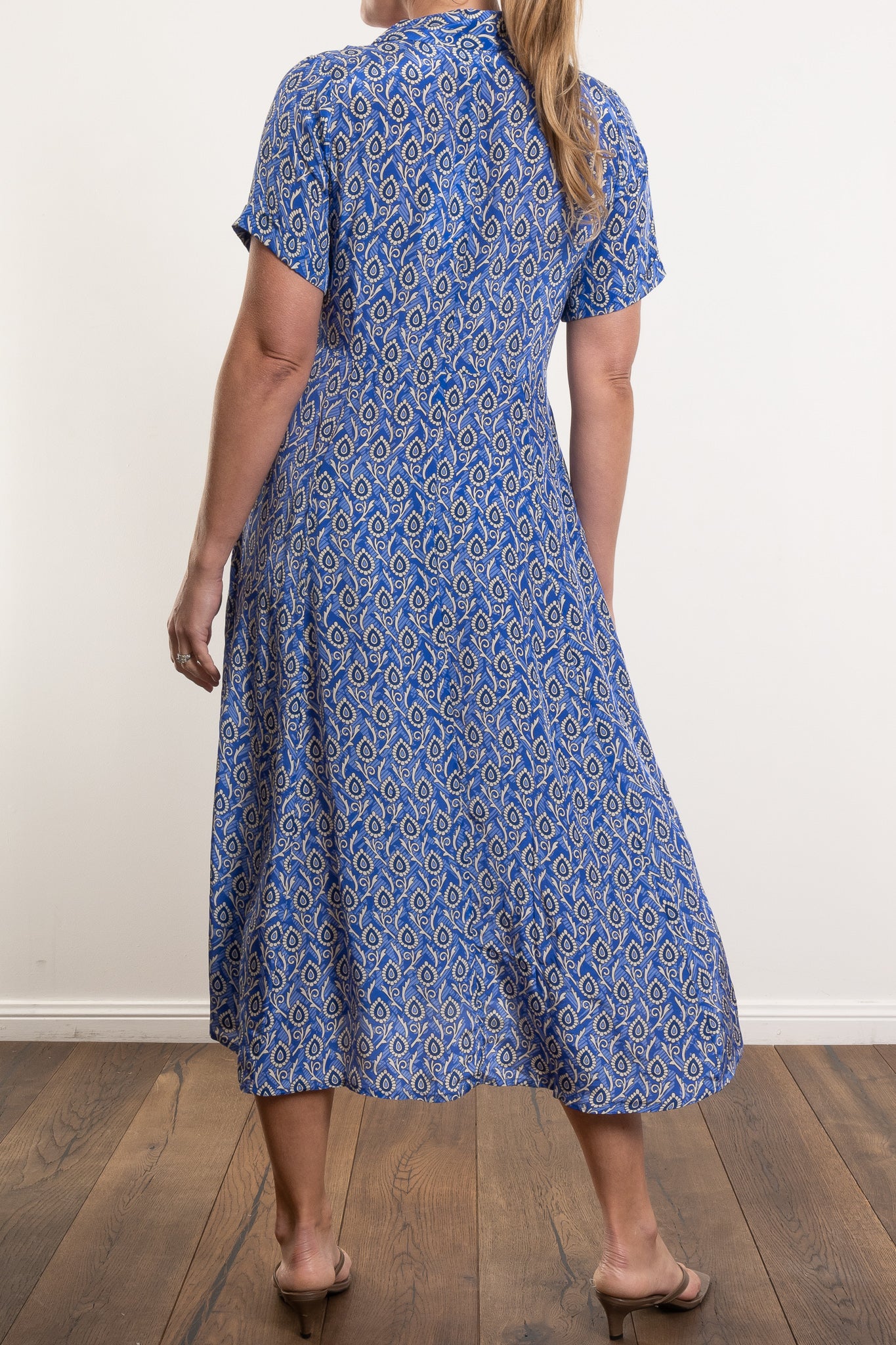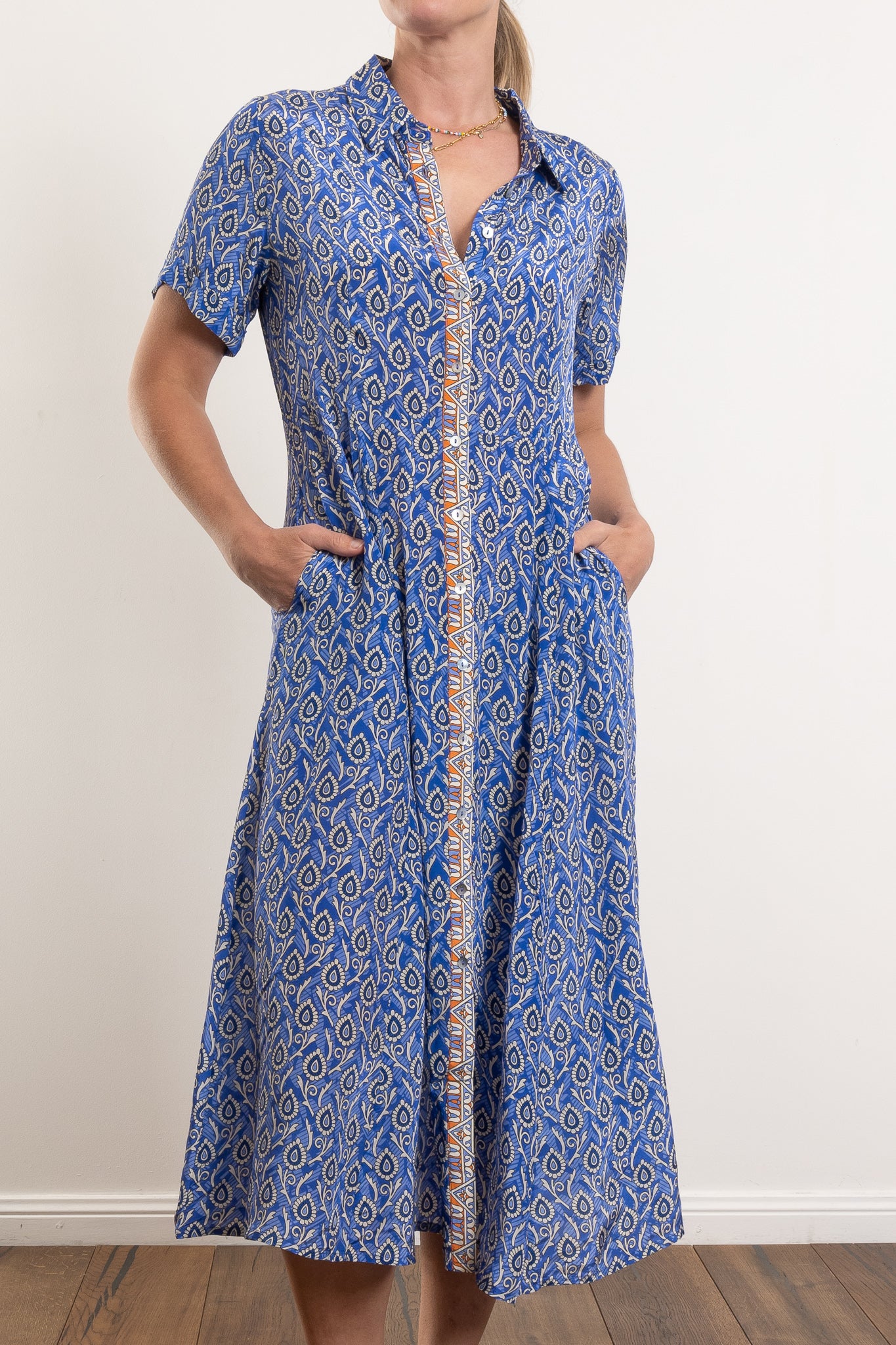 Floaty, fresh and full of personality, the Blake Dress is the ultimate no-fuss throw-on. Crafted from soft, breathable viscose with a relaxed A-line silhouette, it features a striking blue motif and contrast placket trim that adds an artisan touch. With short sleeves and a button-through front, it's equal parts practical and pretty—ready to dress up or pare back depending on the moment.