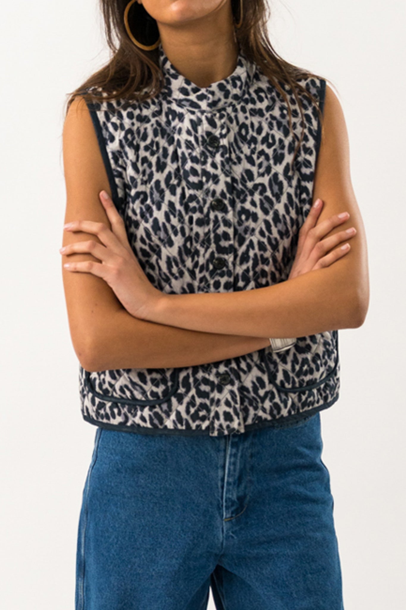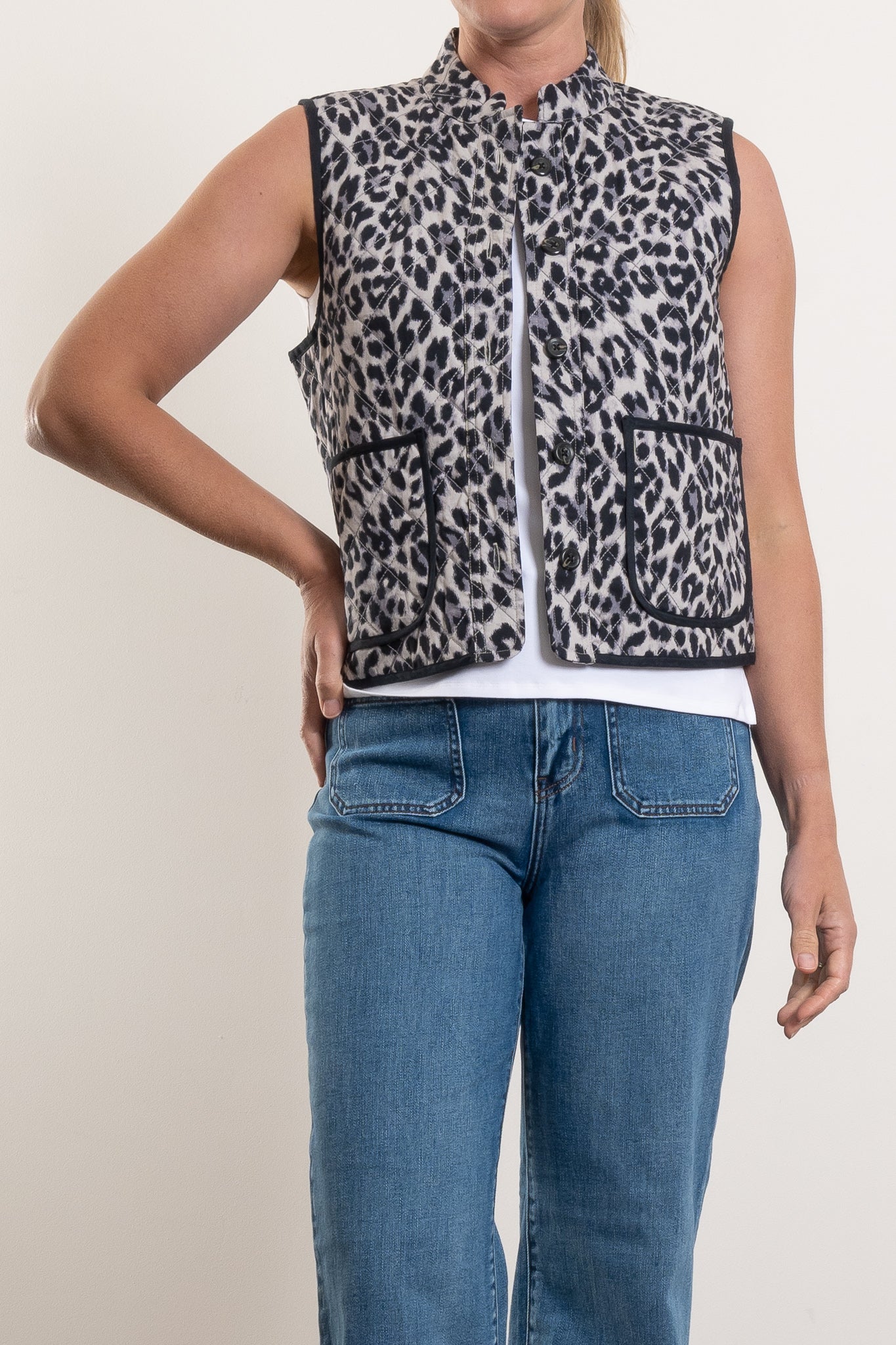 Wildly wearable and endlessly versatile, the Cairo Vest delivers a bold take on trans-seasonal layering. Featuring a sleeveless cut and diamond-quilted finish, this compact style is printed all over in a soft monochrome leopard and finished with neat contrast piping. Patch pockets and a button front give it just enough structure, making it easy to wear open or closed.