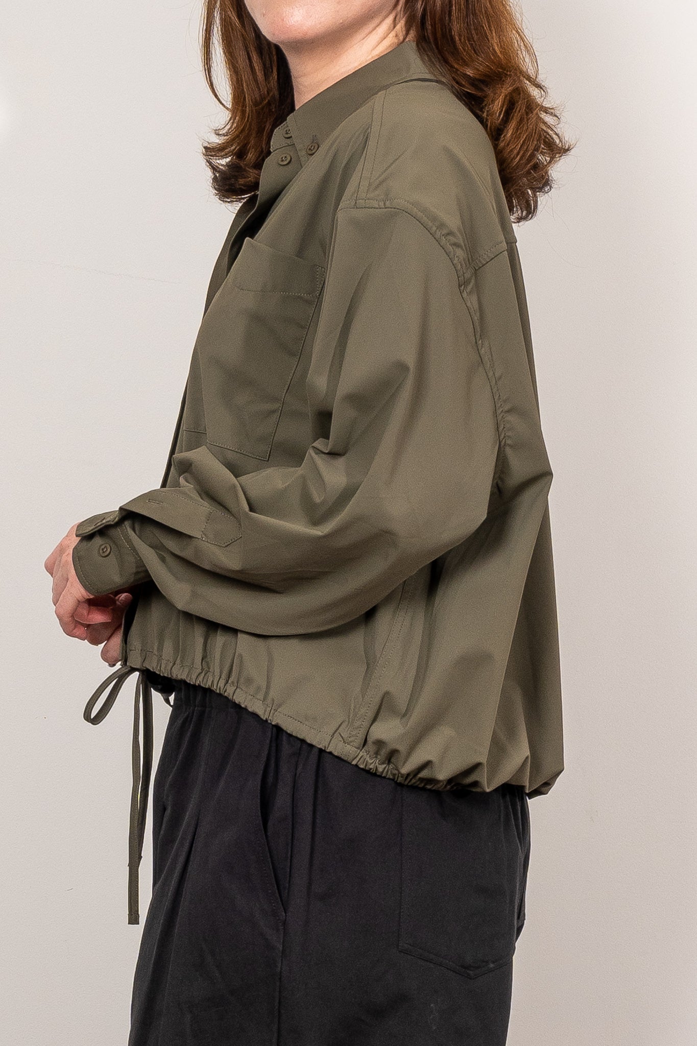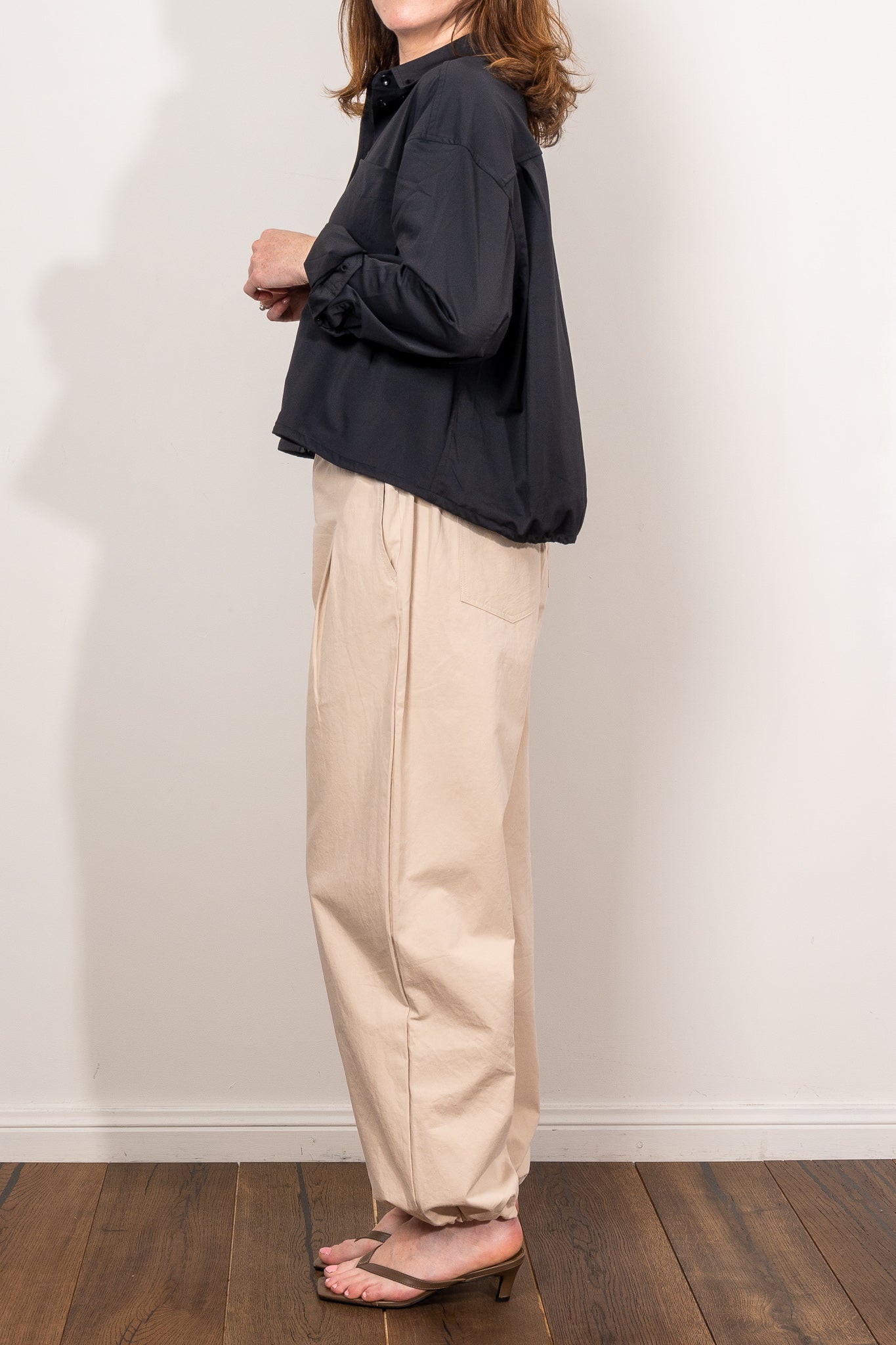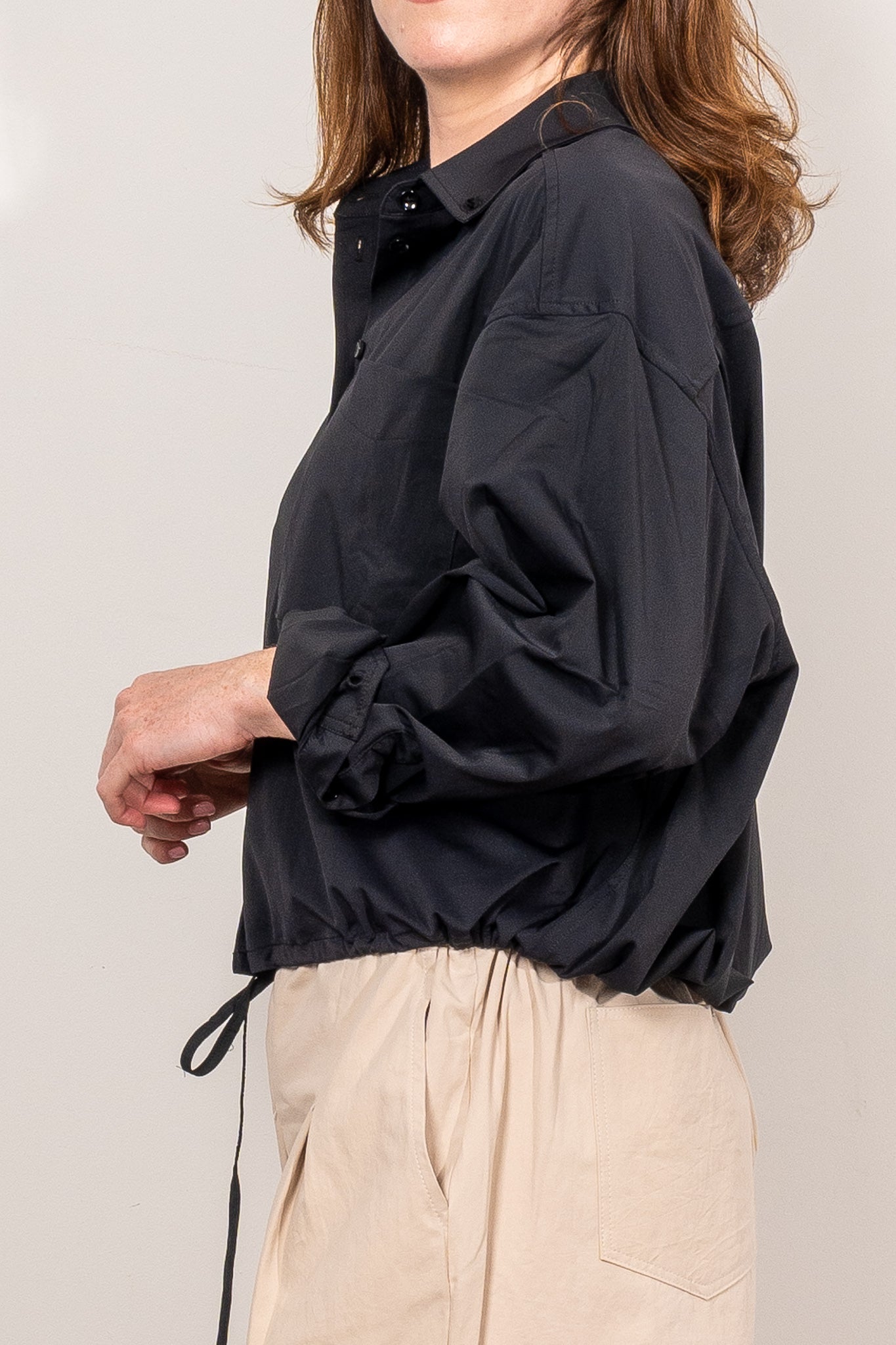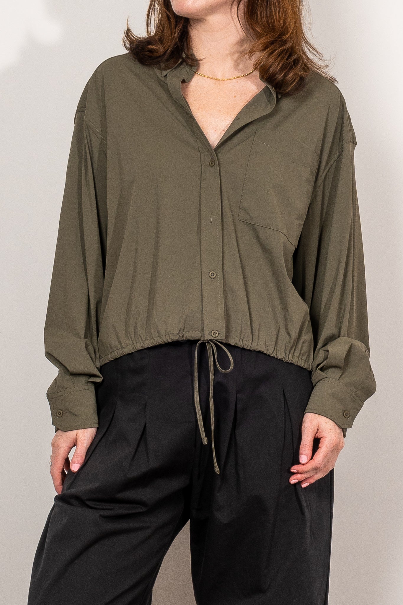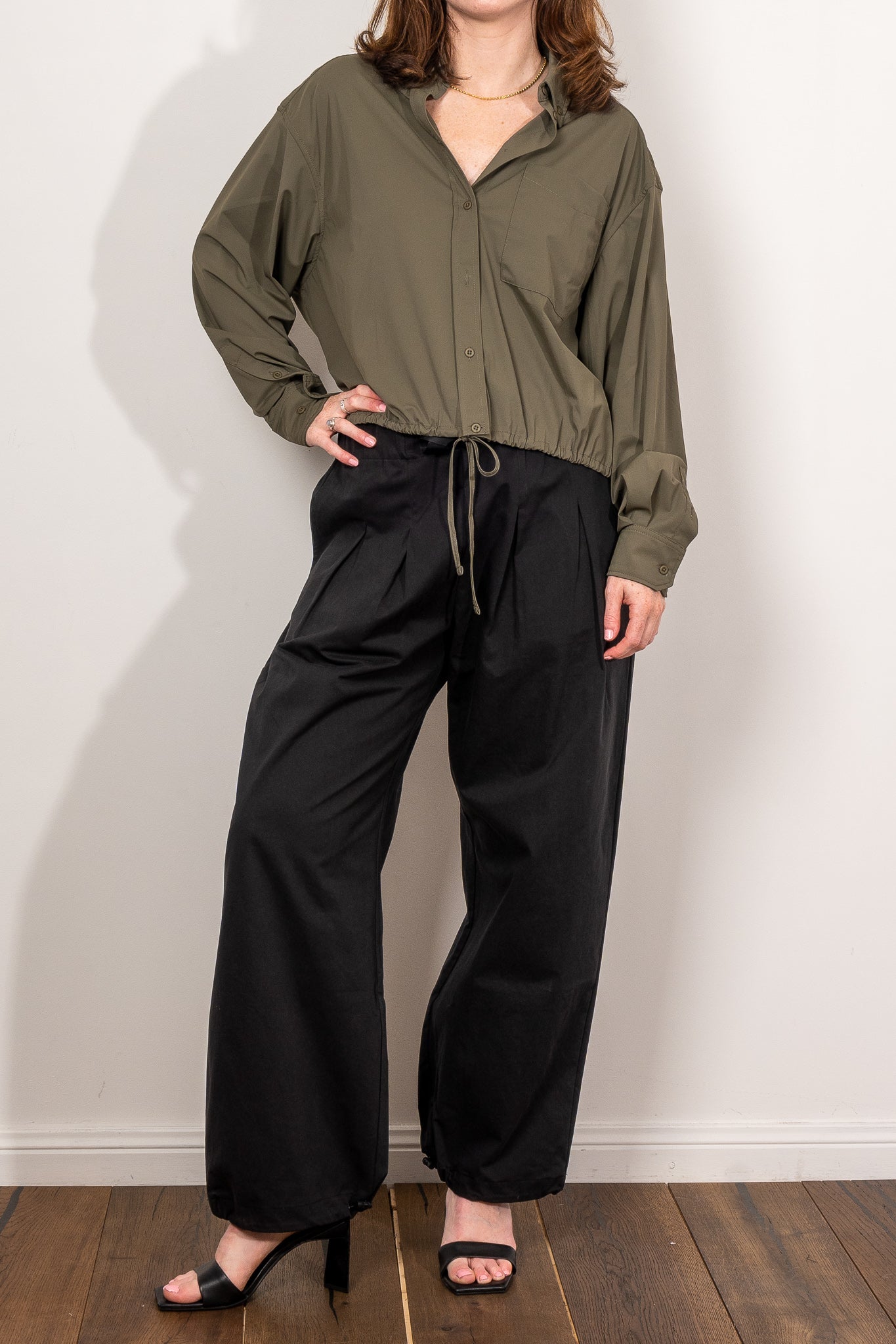 - Drawstring cord at waist that can be pulled in or left relaxed