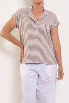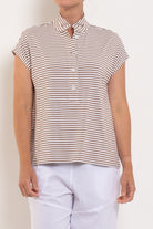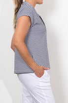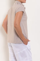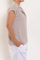 This flattering and versatile tank is cut in Mela Purdie’s signature Yacht Stripe Jersey, offering stretch comfort with a polished finish. Featuring a tab and button closure at the neckline, cap sleeves, and side splits for ease of movement, it’s the perfect trans-seasonal piece to layer or wear solo. A reliable staple with timeless appeal.