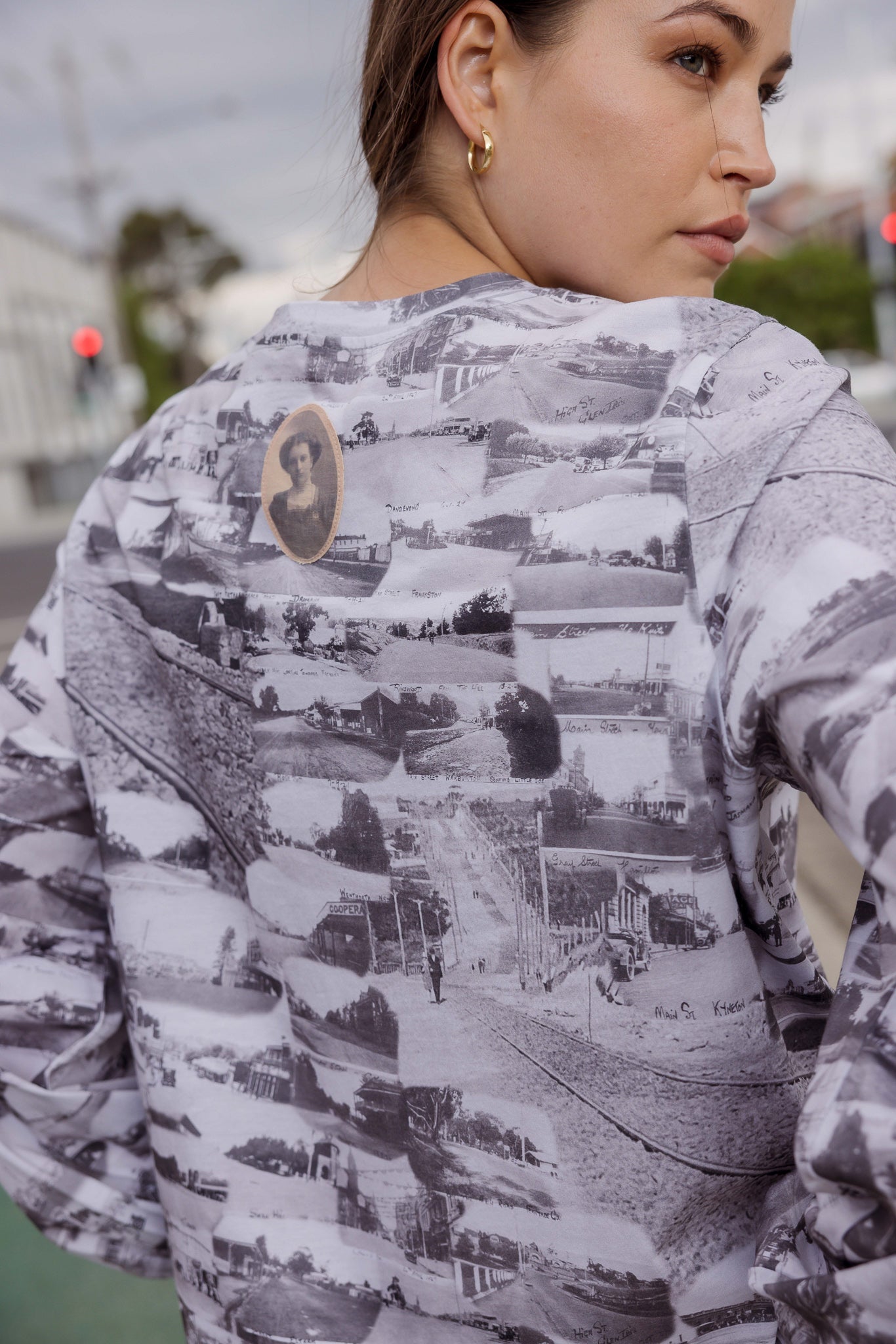 Take a ride on the wild side with the Tram Lines top by Maud Alice Dainty! Made from soft, comfortable Cotton, it showcases a black and white photo collage of historic tram lines around Australia. The cuffed sleeves with delicate gathering add a touch of elegance to this unique and artistic piece.