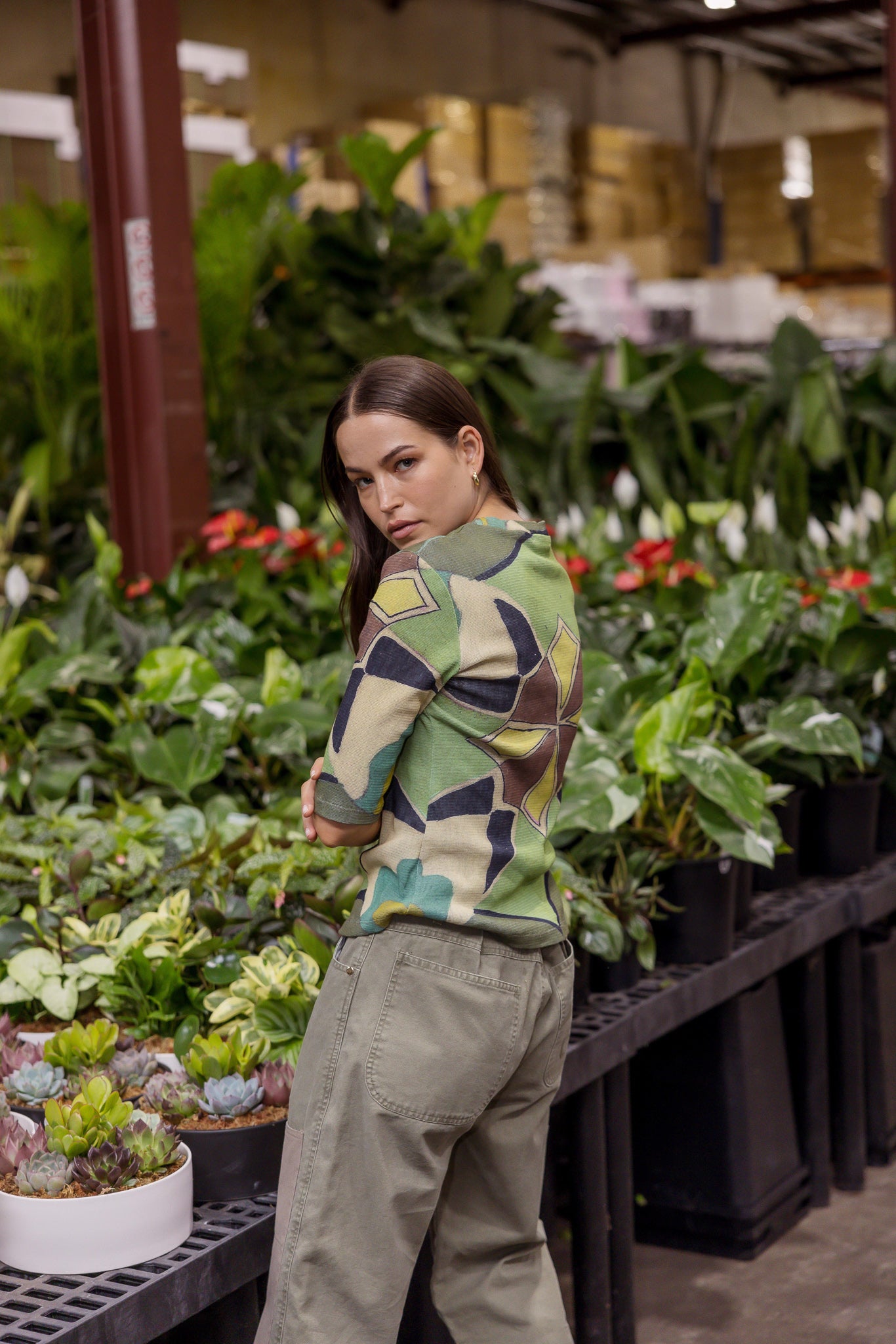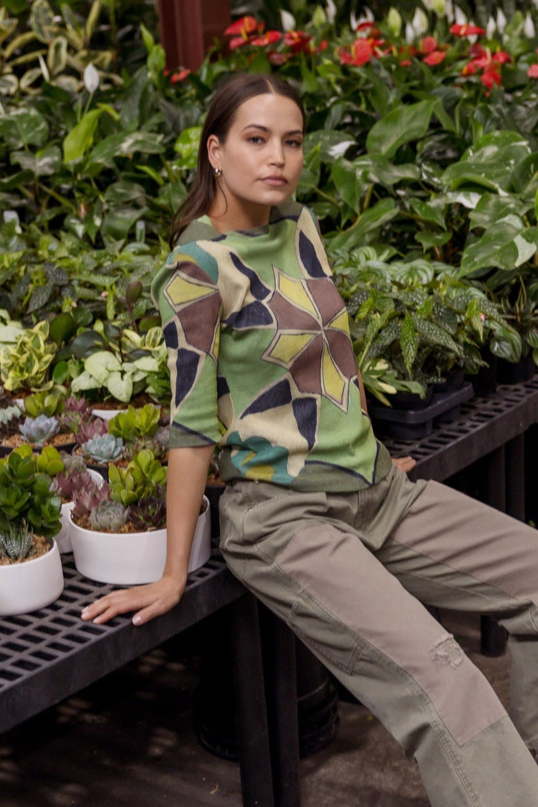 Experience the beauty of nature with the M.A. Dainty Meadow Top. Made from 100% cotton and featuring artworks by the designer's mother, this stretchy double layer top boasts unique earthy tones and geometric patterns. Stand out with this statement piece that combines art and fashion.