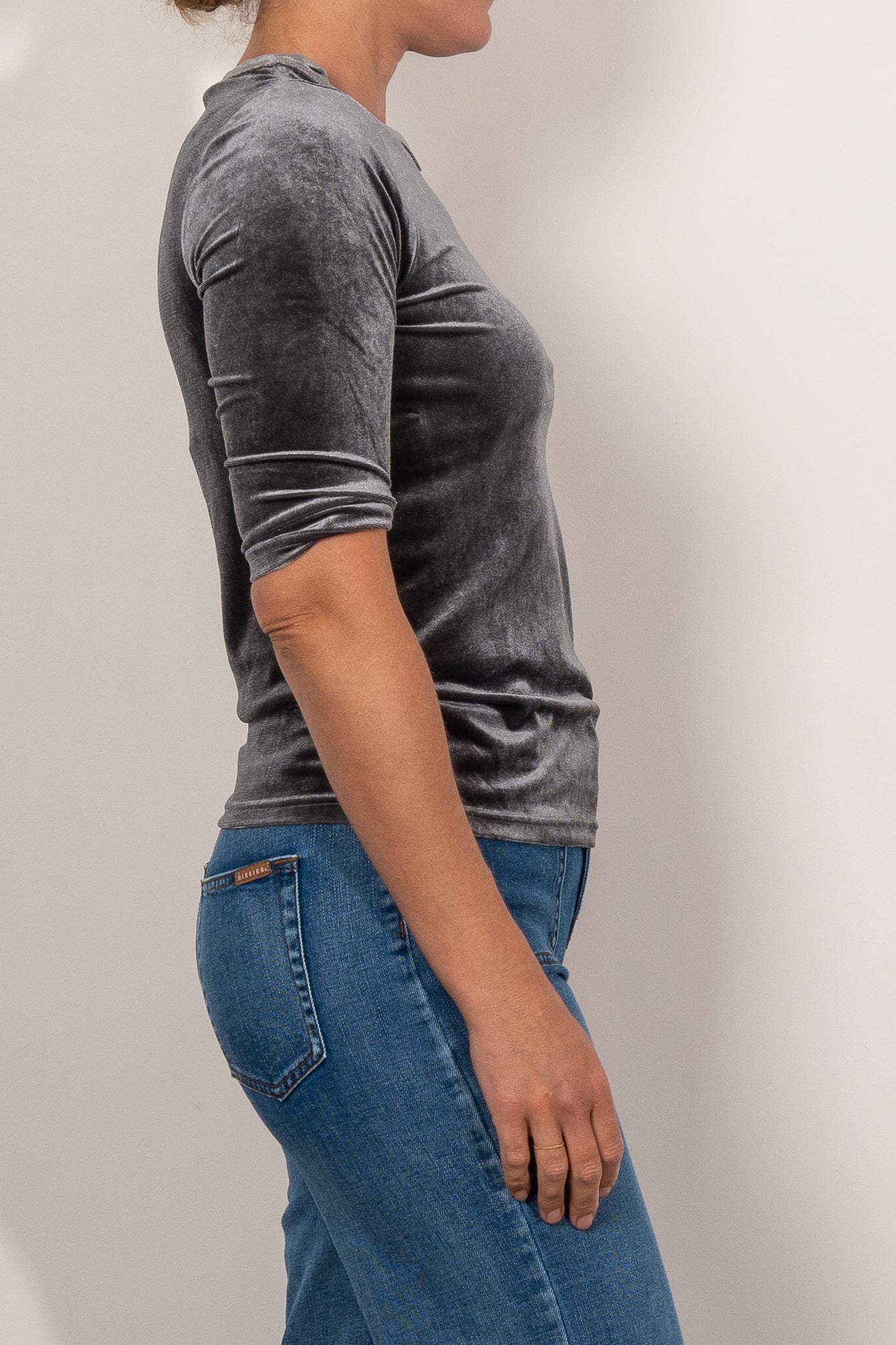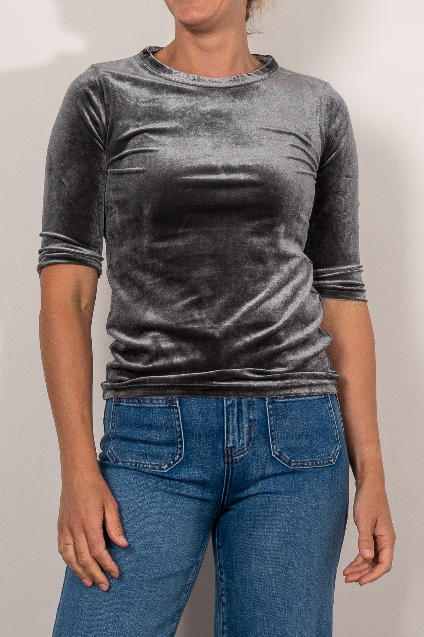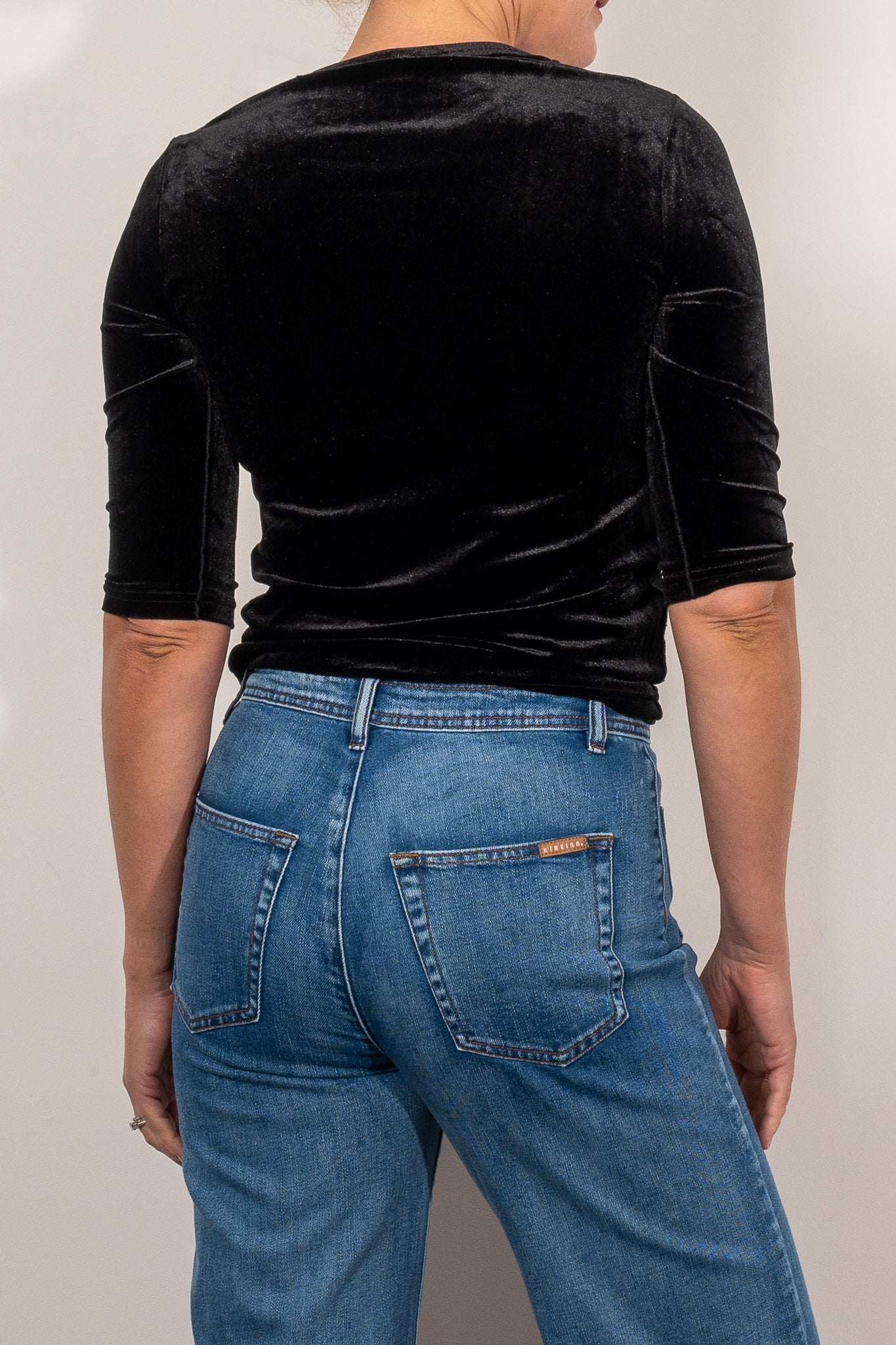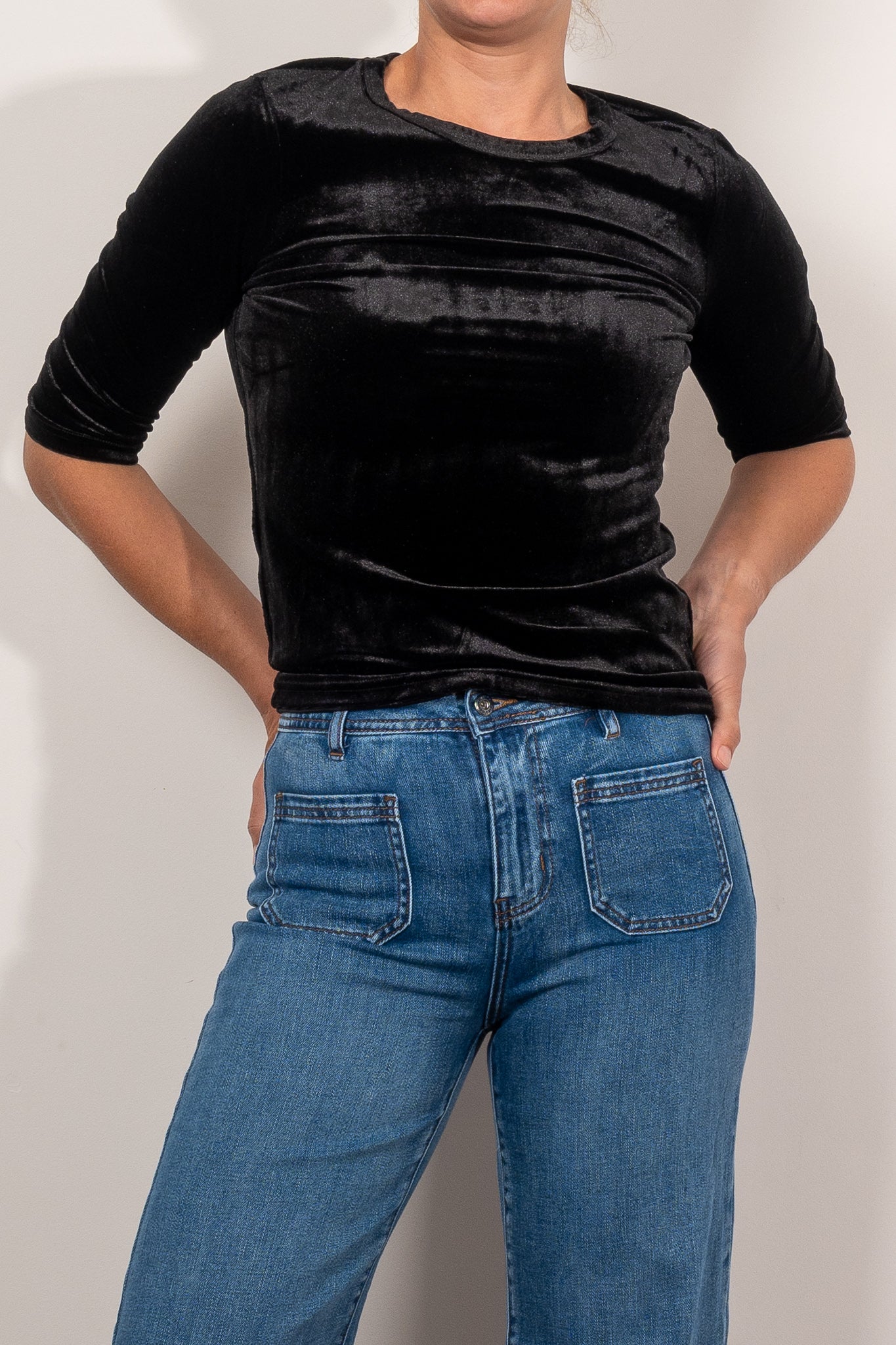Discover the timeless elegance of the M.A. Dainty Patti Top! Made from luxurious velvet, this top features a flattering fitted style with 3/4 sleeves and a high rounded neckline. Its soft, stretchy fabric makes it both comfortable and easy to style, making it a must-have for any wardrobe.