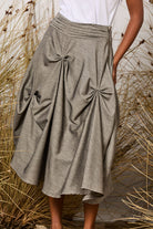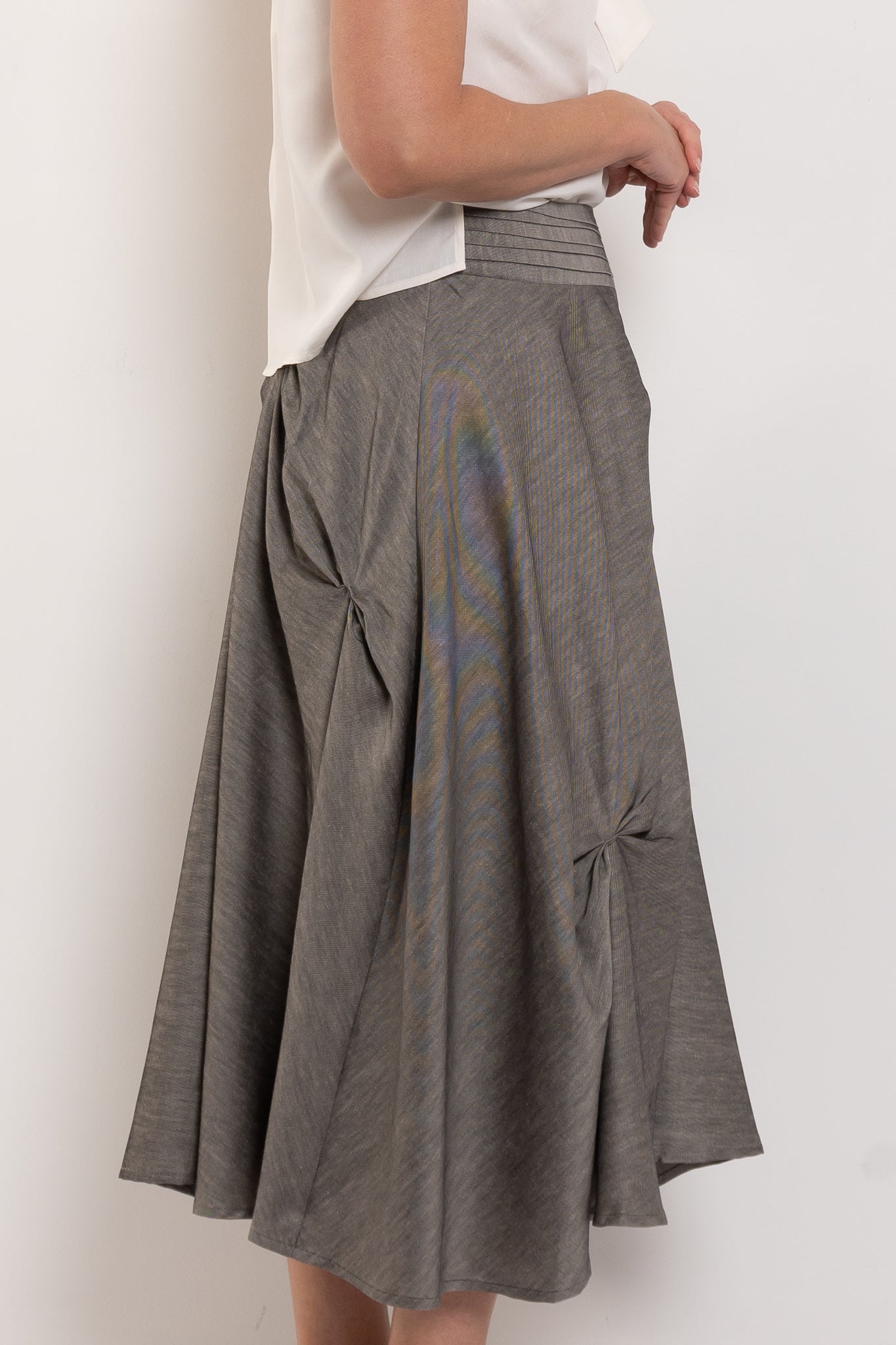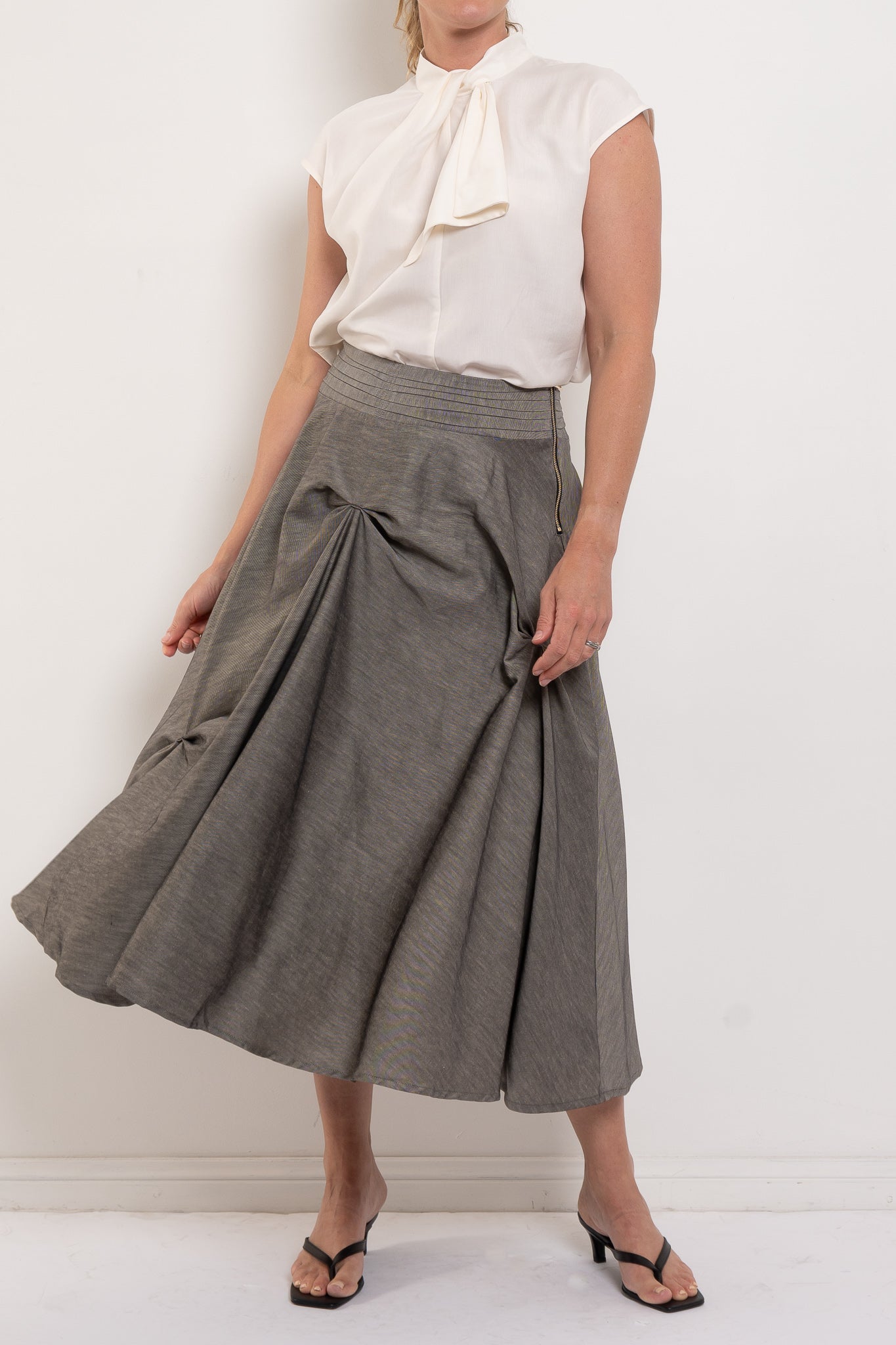 Designed with a high, pleated waistband that flatters the waist, the Chute Skirt falls into soft folds that gather into playful knots through the skirt. The result? A draped silhouette that’s equal parts quirky and elegant. Style it with a crisp tee for off-duty days, or pair it with the matching Chica Jacket when you’re in the mood to turn heads as a set.