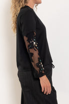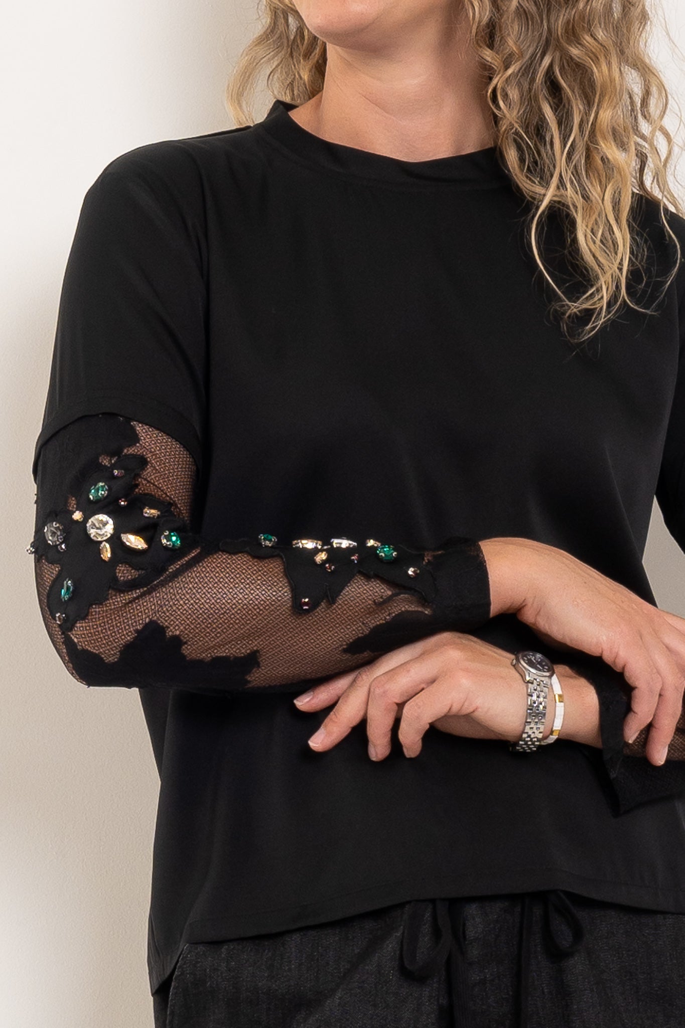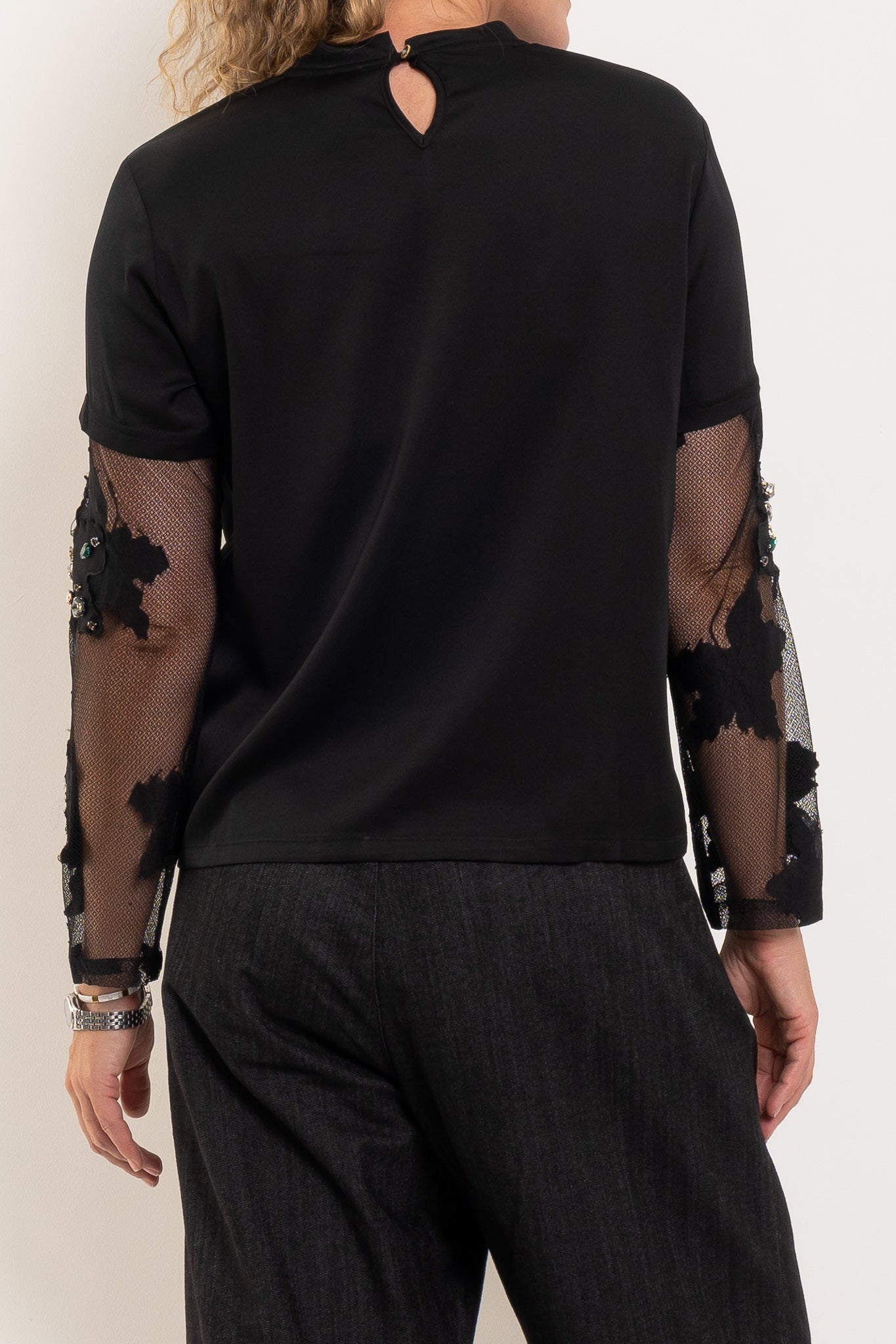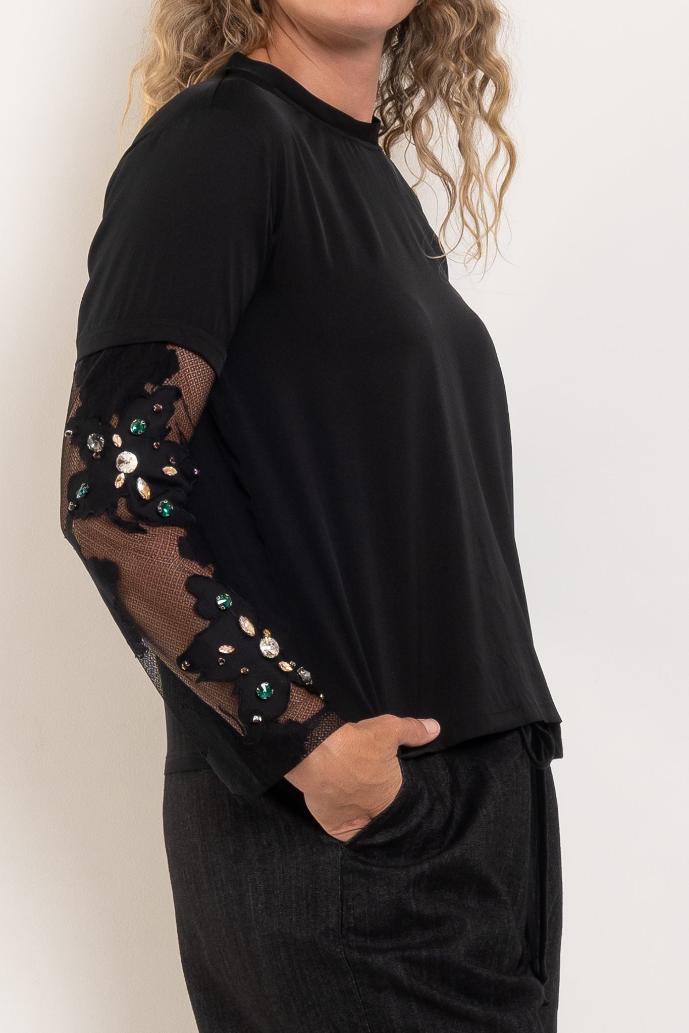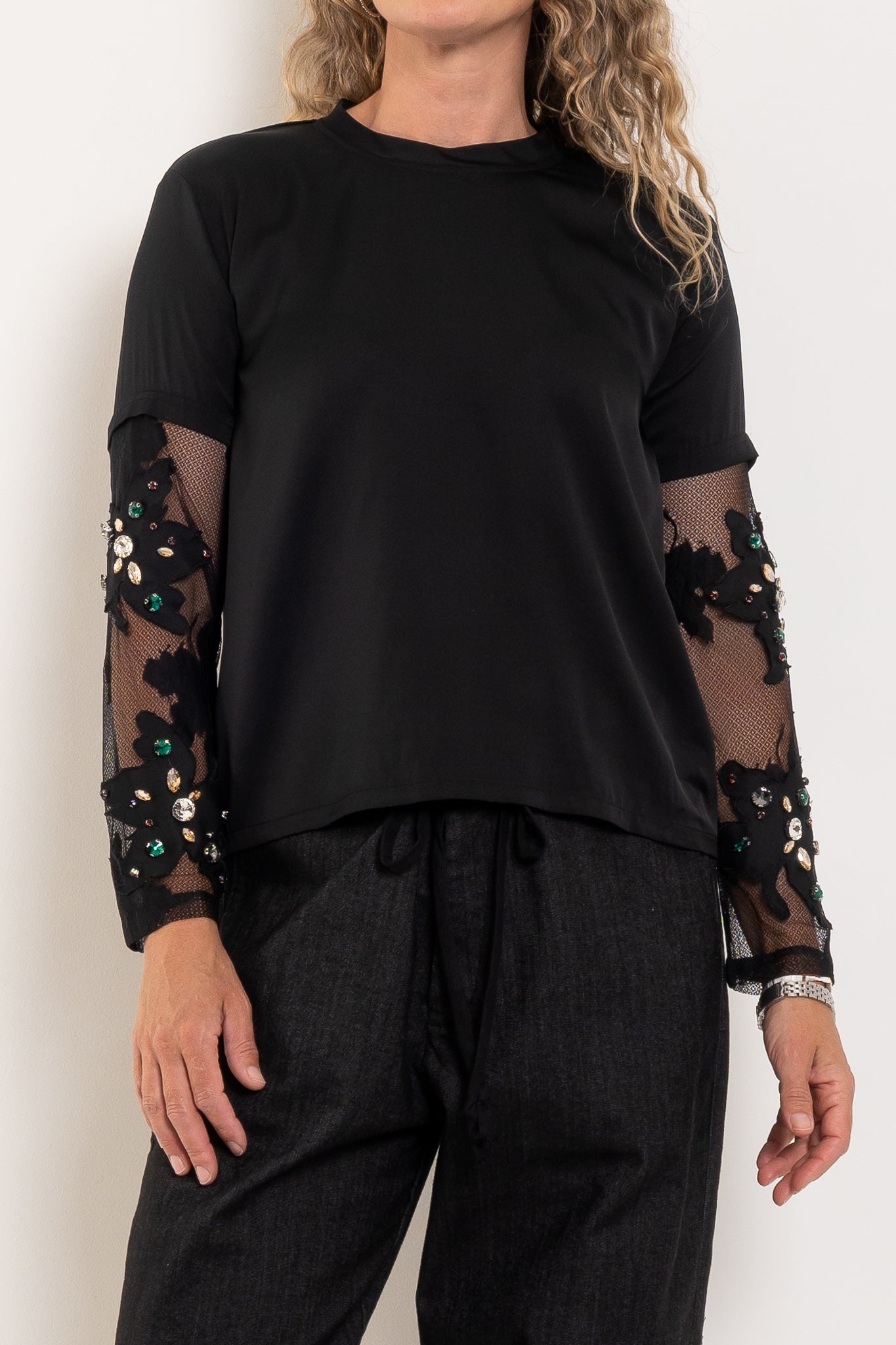 Cut from a silky black fabric with a fluid drape, this elevated tee is anything but basic. The mesh sleeves are delicately embellished with jewel detailing, adding texture, shine and a touch of glamour while keeping the silhouette modern and wearable. It’s the perfect blend of relaxed cool and after-dark edge.