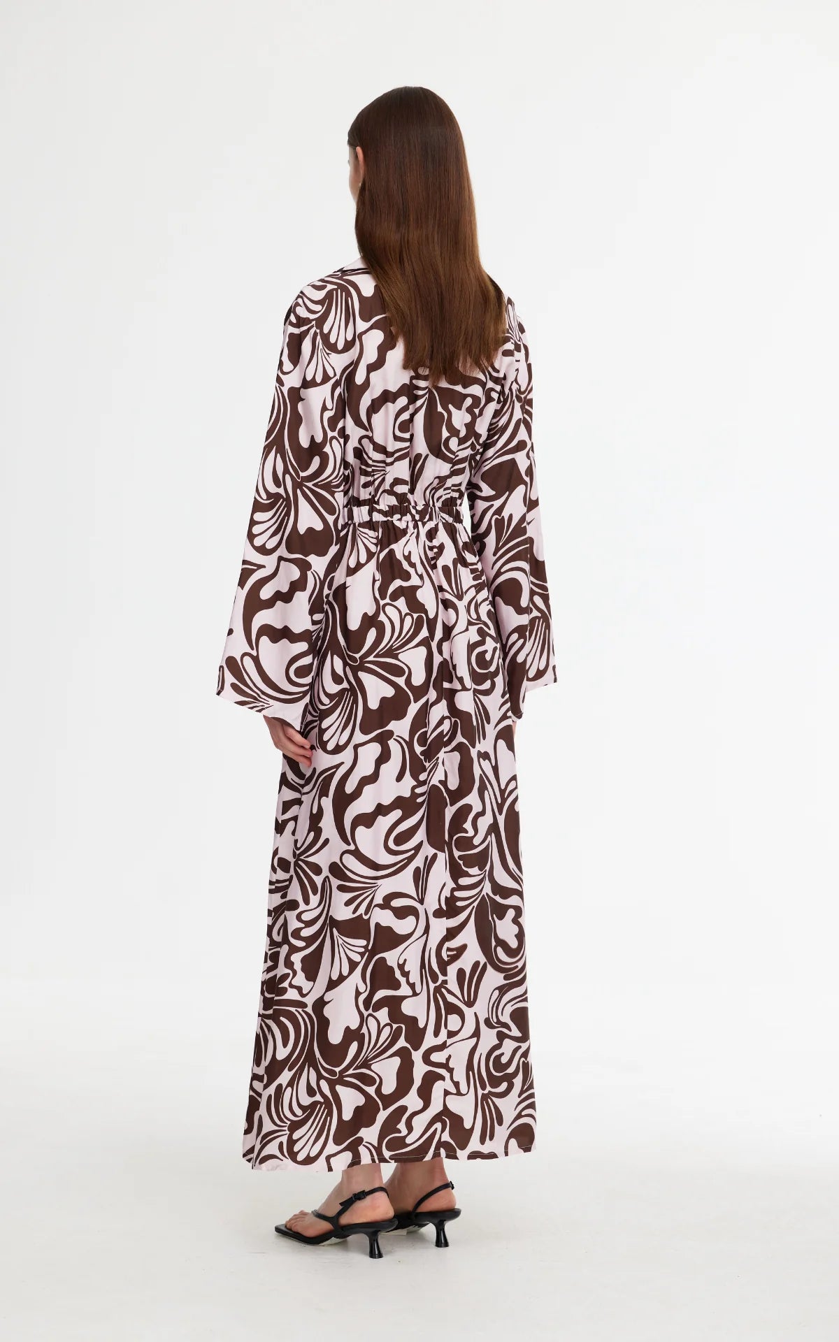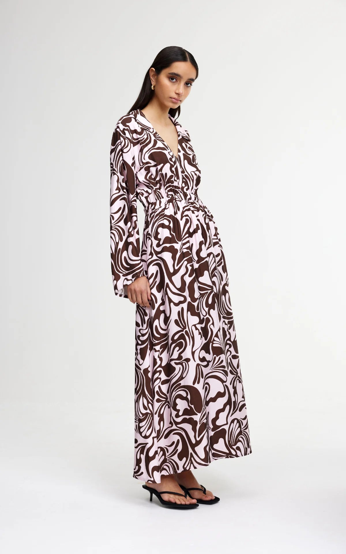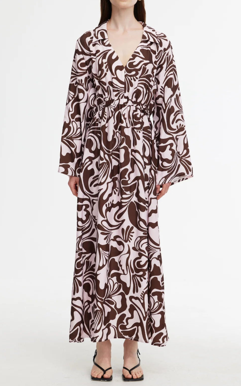 The Stevie dress is a 70’s inspired maxi dress with wide sleeves, a v-neckline and a one-piece collar. The waist elastic has been designed to give this piece shape and ease-of-wear.