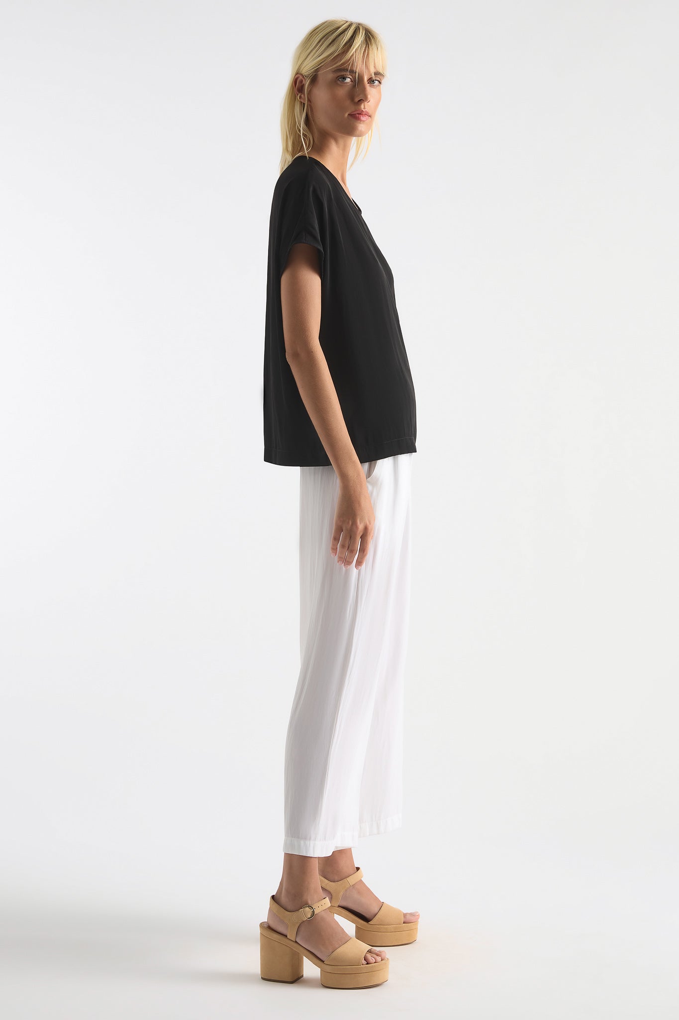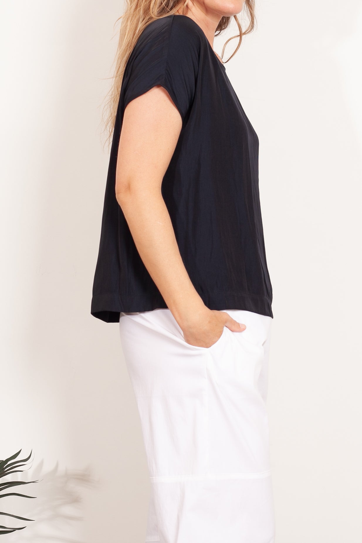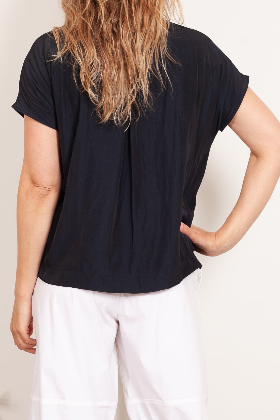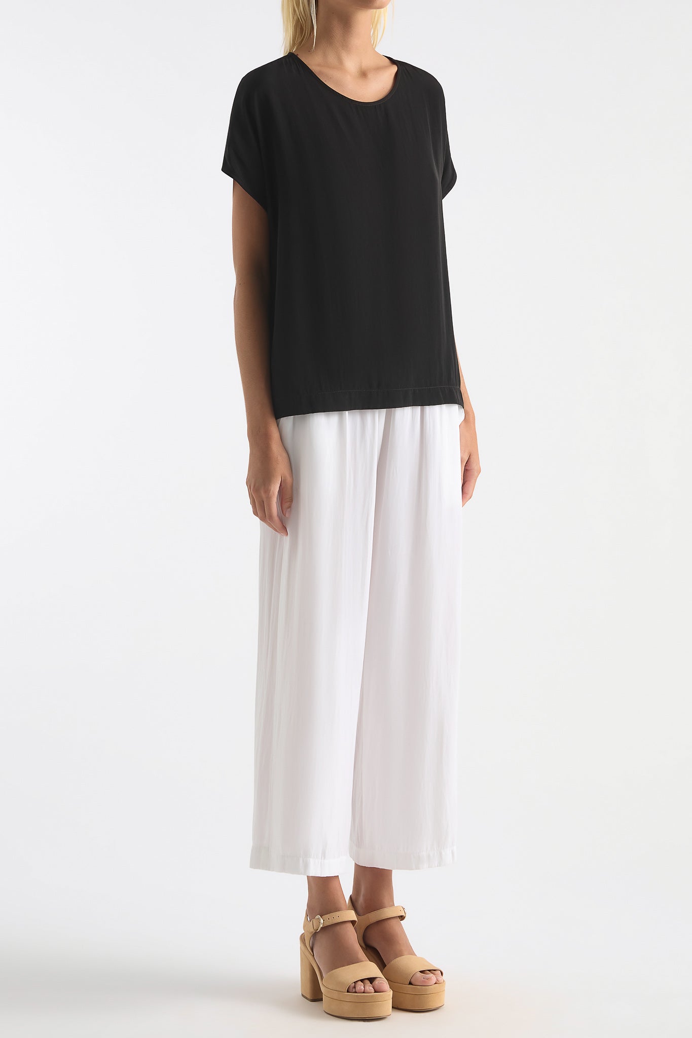 The Mela Purdie Cap Shell top is made from Mela Purdie's signature Mache fabric. This blouse is a versatile staple. Cut relaxed through the body with a flattering cap sleeve, detailing is elegant and kept to a minimum with discreet inside bind at the scoop neckline, and a simple pleat at the nape of the neck to encourage movement and drape.