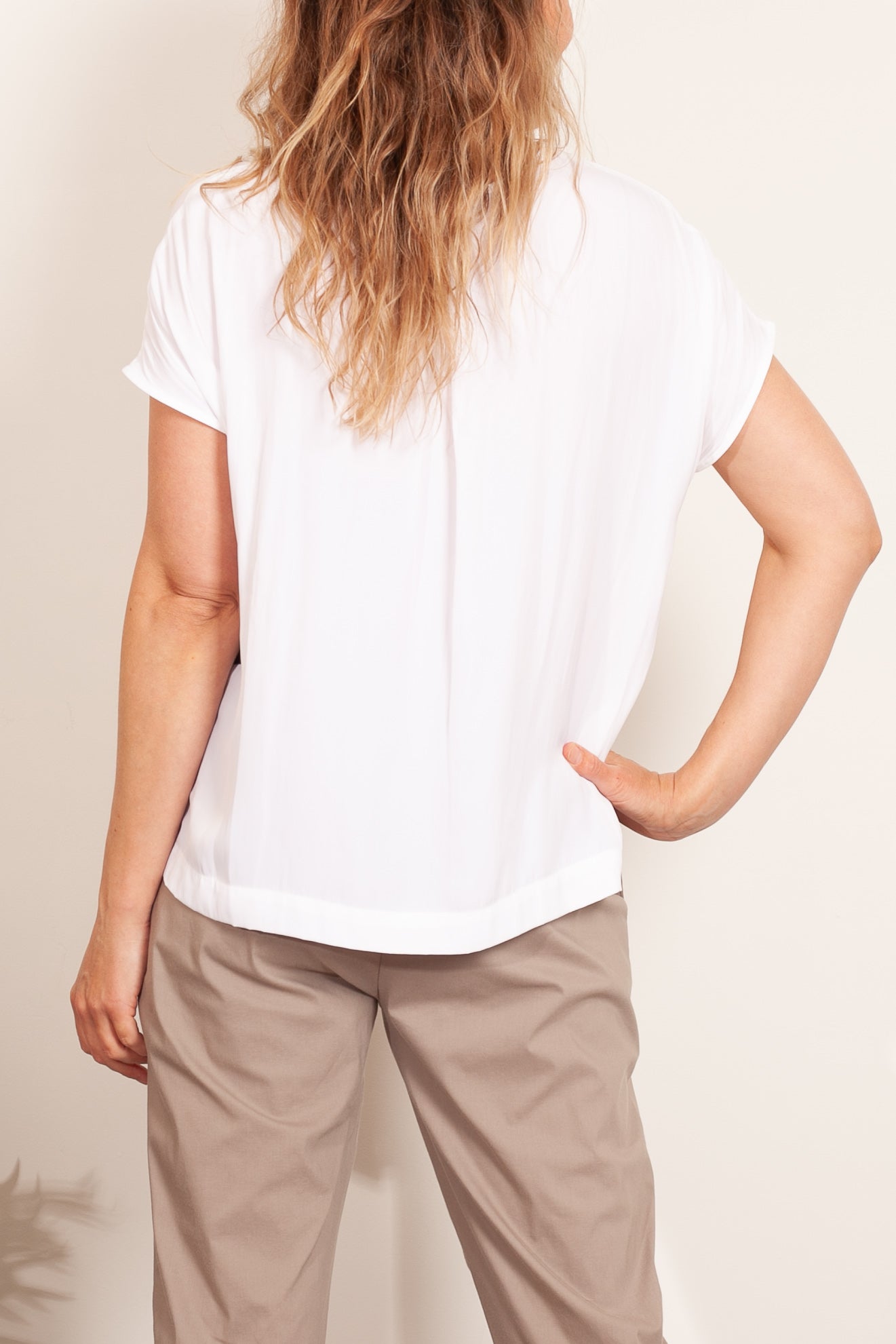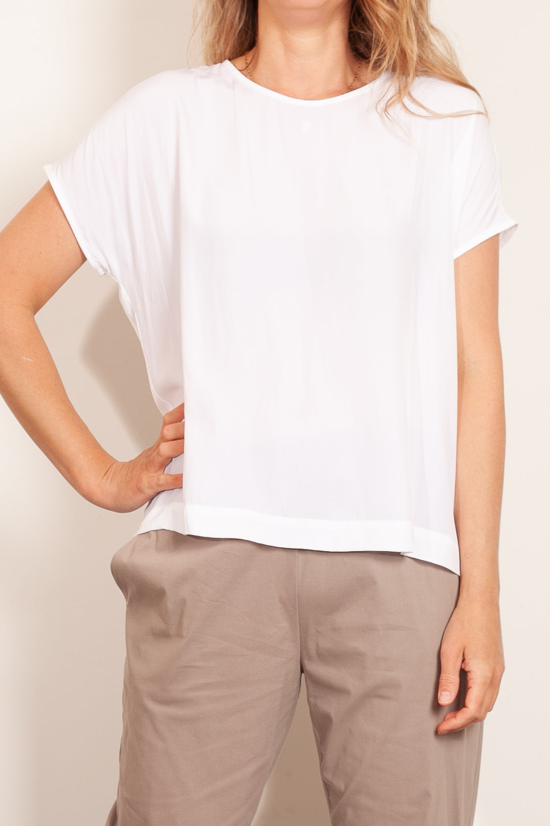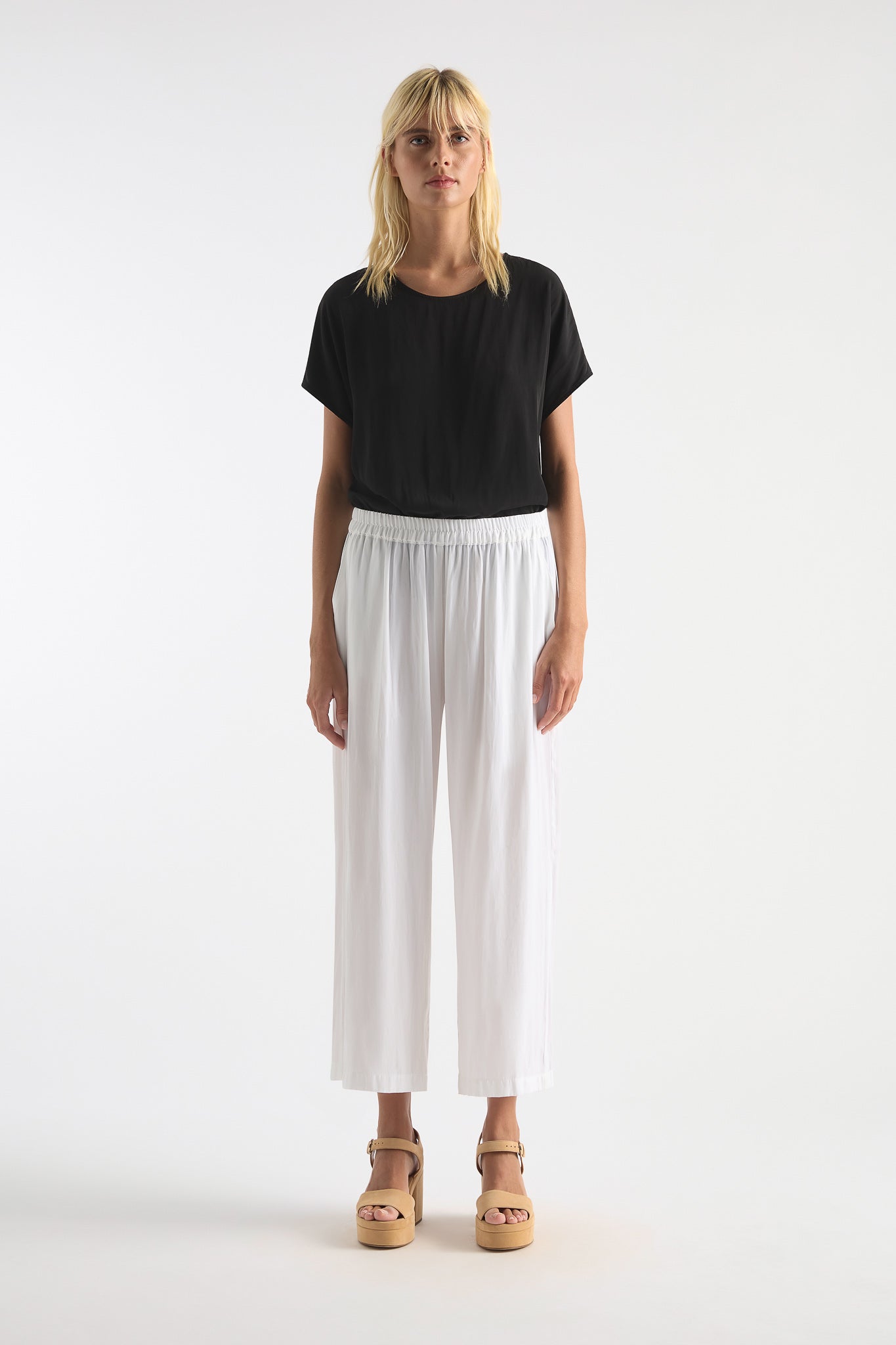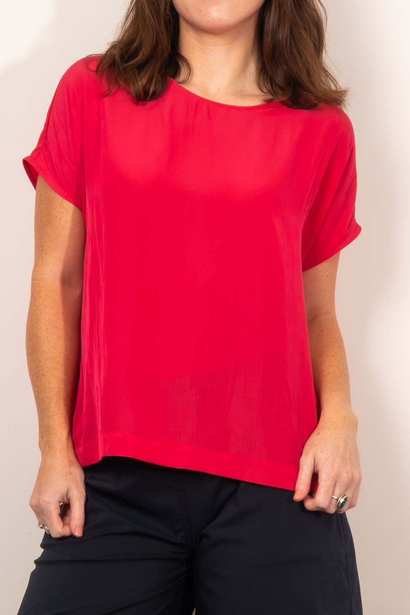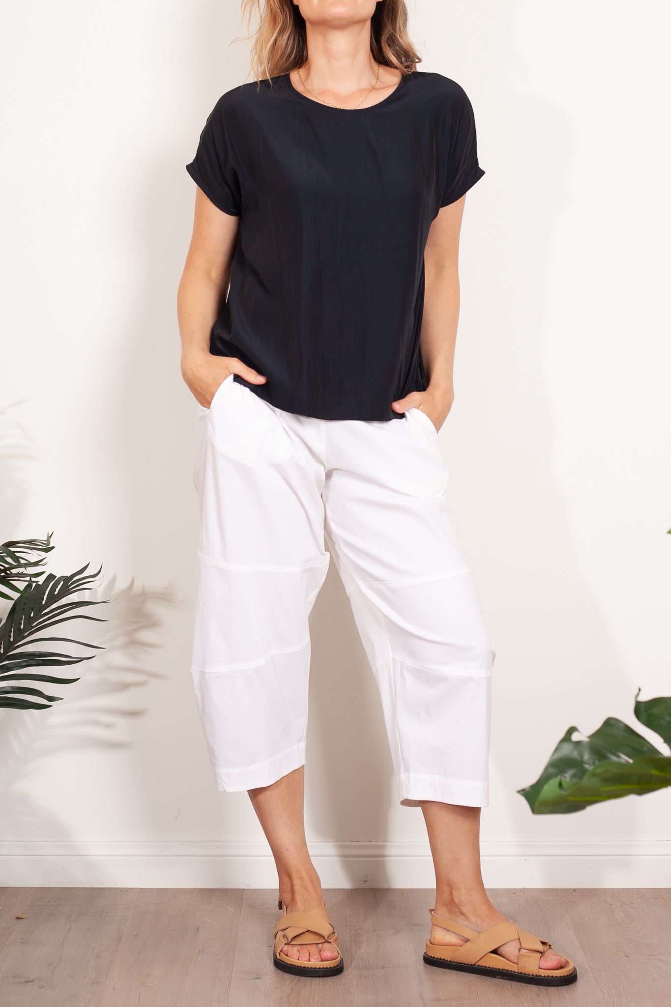 The Mela Purdie Cap Shell top is made from Mela Purdie's signature Mache fabric. This blouse is a versatile staple. Cut relaxed through the body with a flattering cap sleeve, detailing is elegant and kept to a minimum with discreet inside bind at the scoop neckline, and a simple pleat at the nape of the neck to encourage movement and drape.