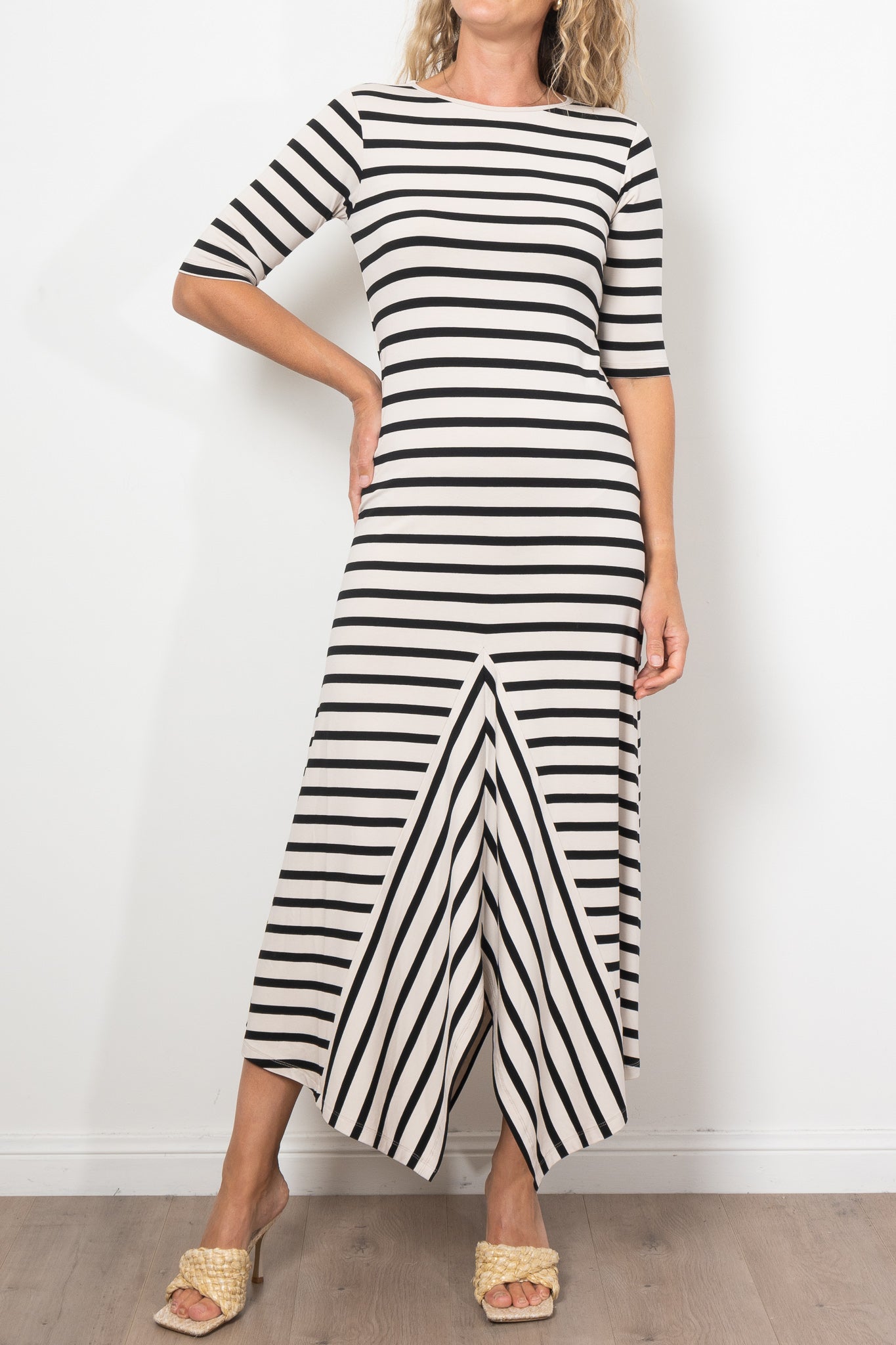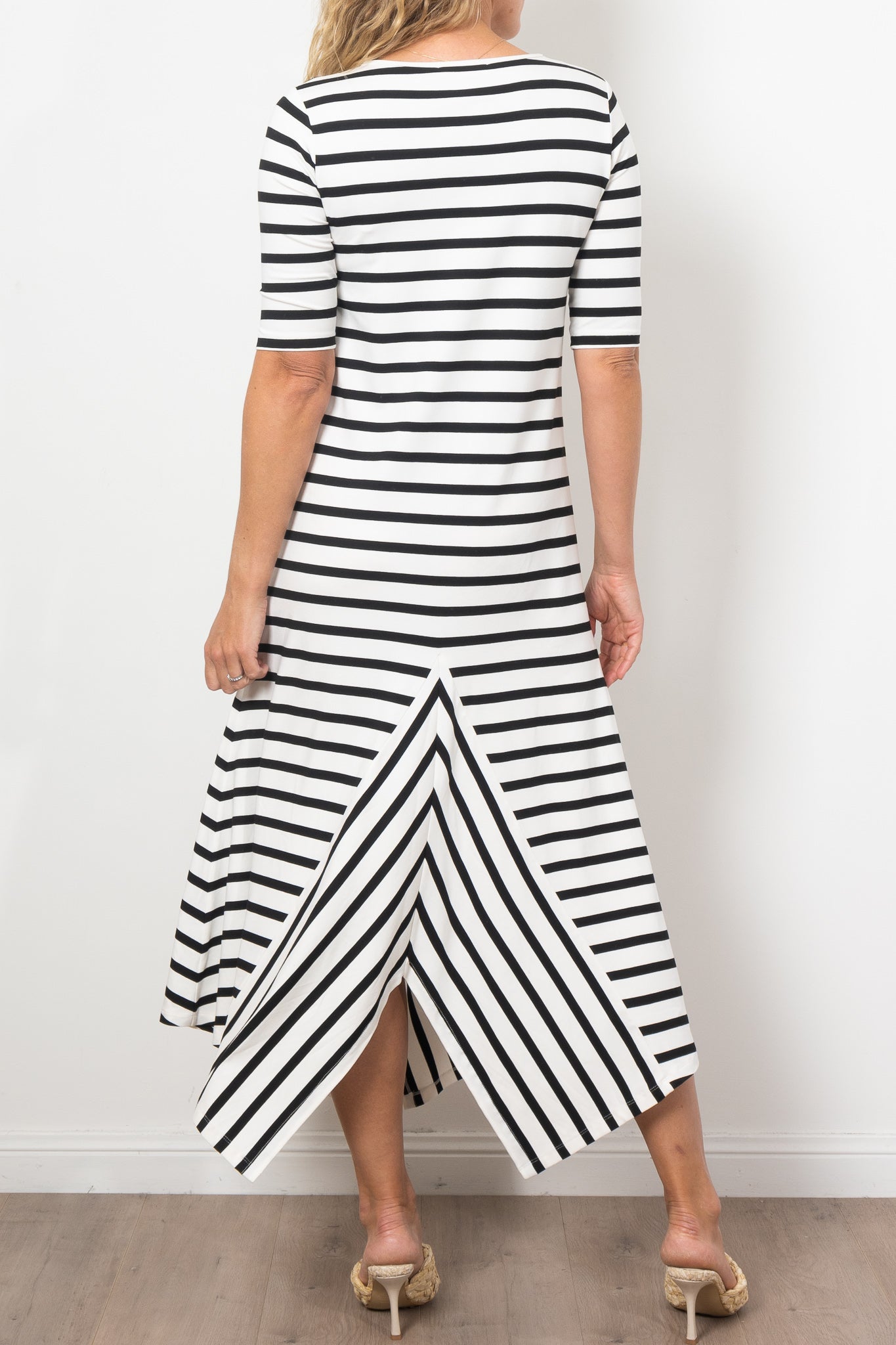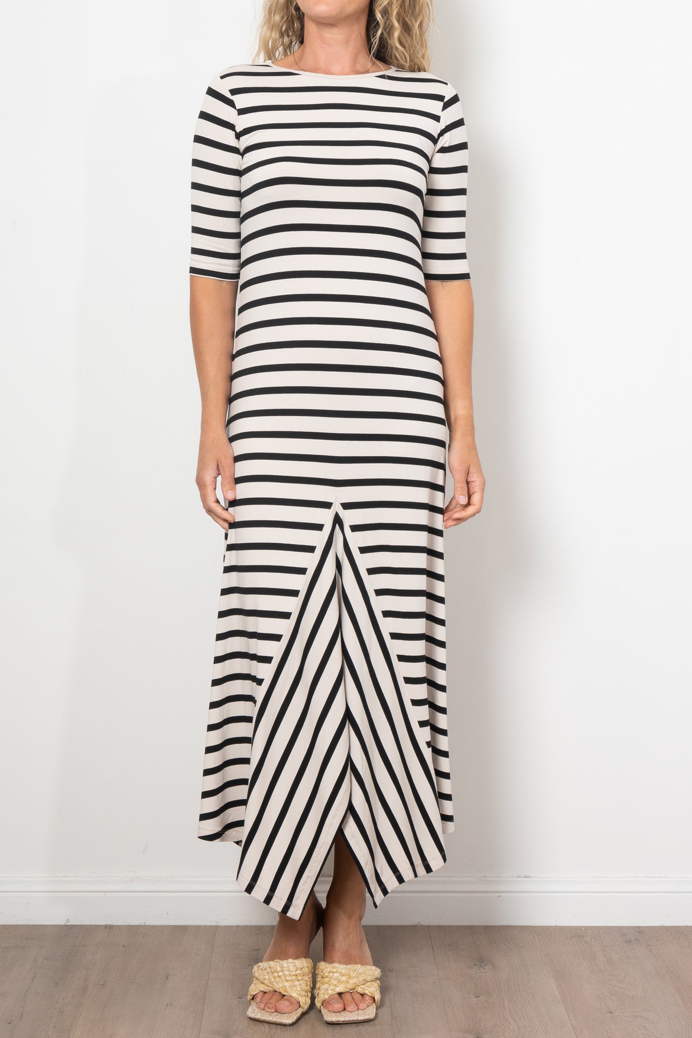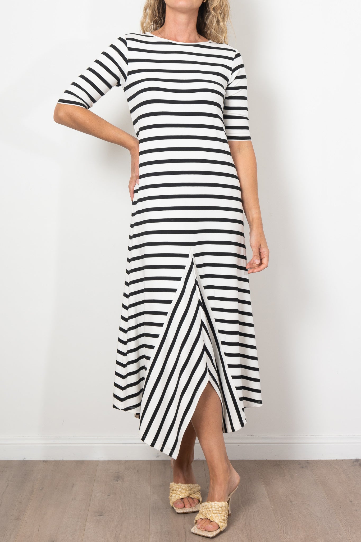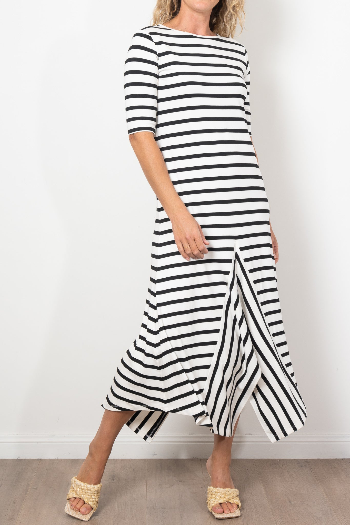 Indulge in Mela Purdie's Trunk Stripe Knit Trapeze Dress, featuring bespoke striped jersey for a bold yet neutral look. The fitted bodice and graceful release from the waist create a stunning silhouette, complemented by an elegant boat neckline and elbow-length sleeves. Made with stretch fabric for ultimate comfort.