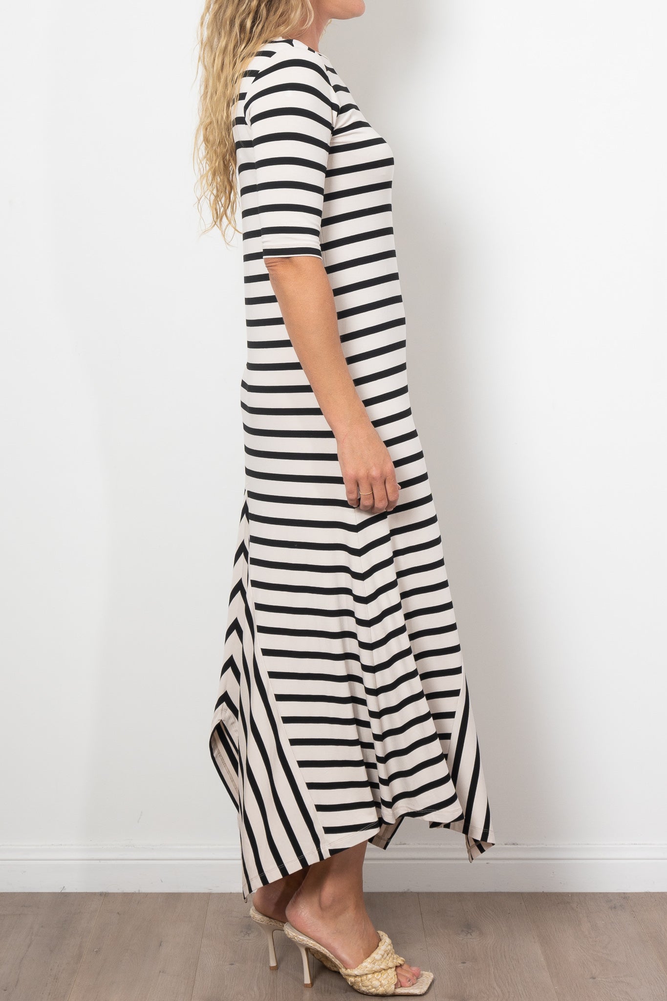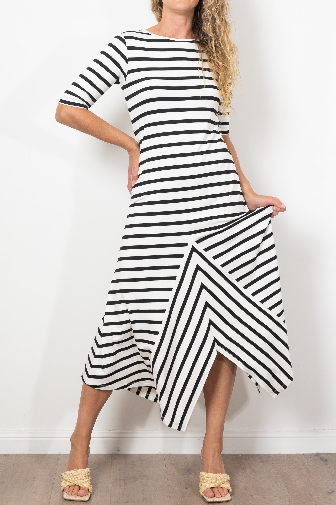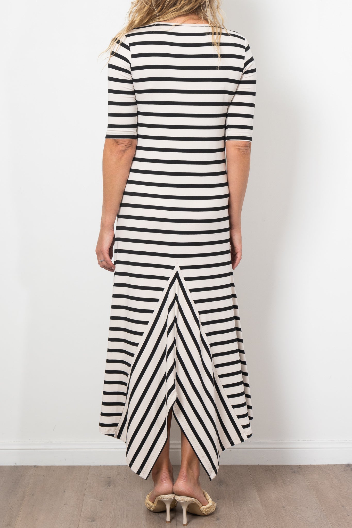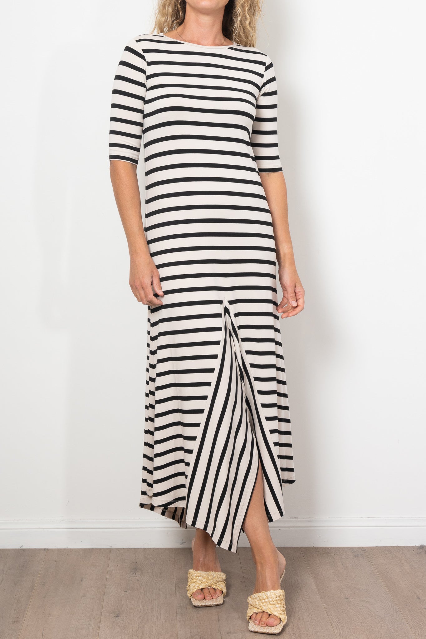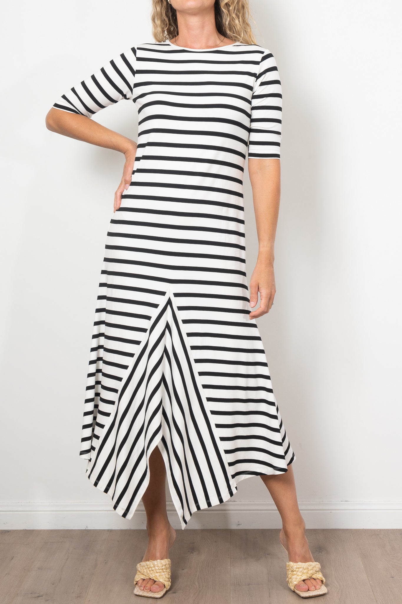 Indulge in Mela Purdie's Trunk Stripe Knit Trapeze Dress, featuring bespoke striped jersey for a bold yet neutral look. The fitted bodice and graceful release from the waist create a stunning silhouette, complemented by an elegant boat neckline and elbow-length sleeves. Made with stretch fabric for ultimate comfort.