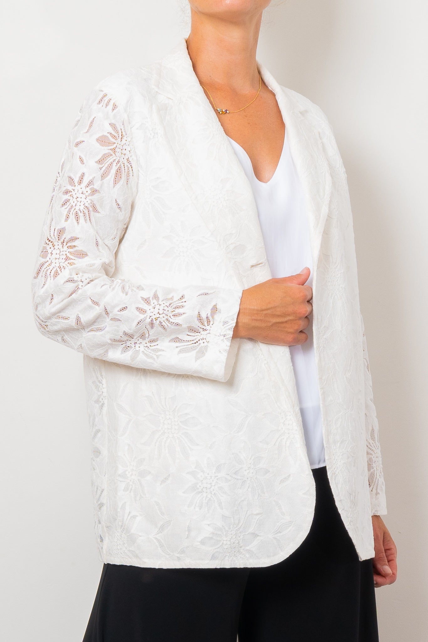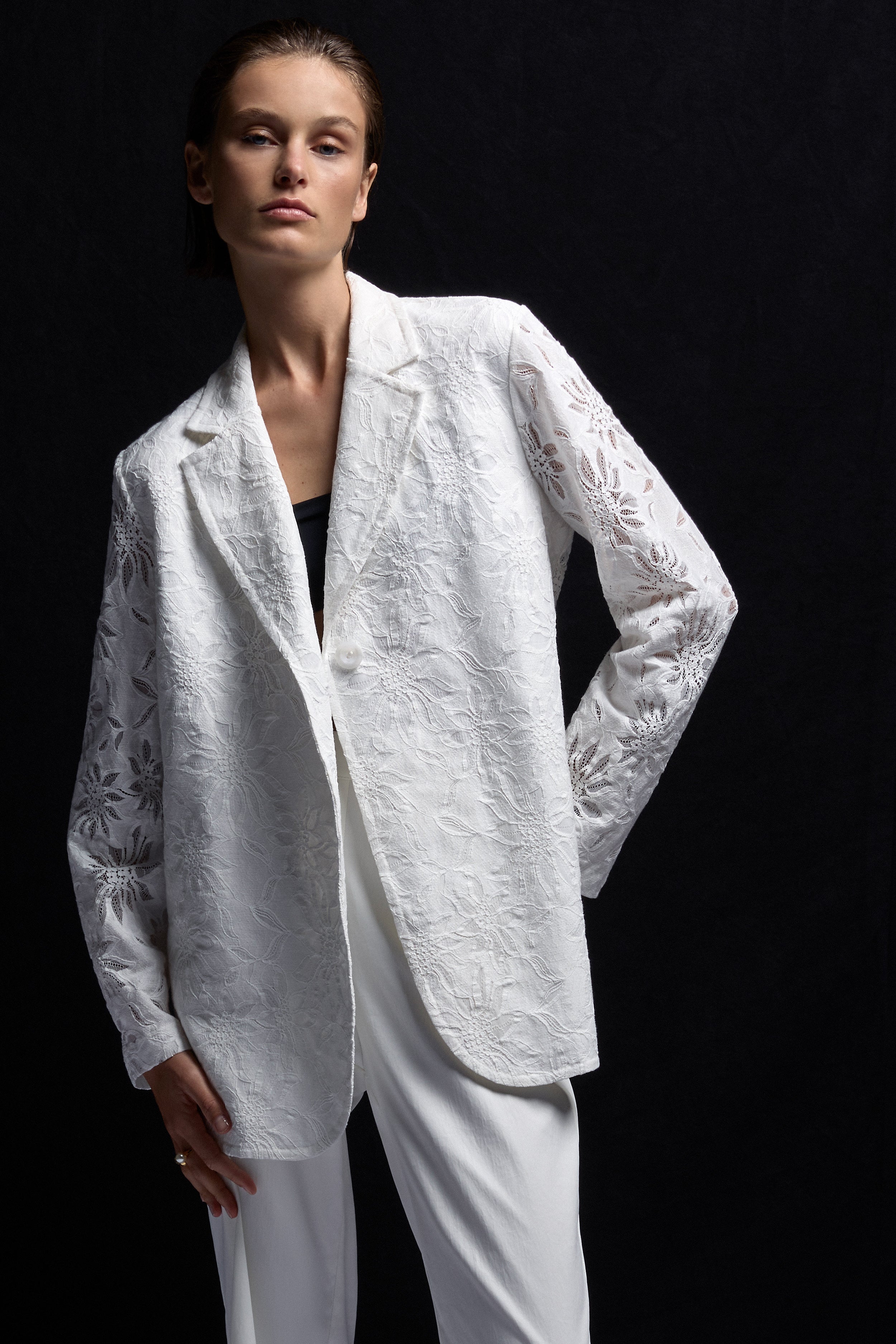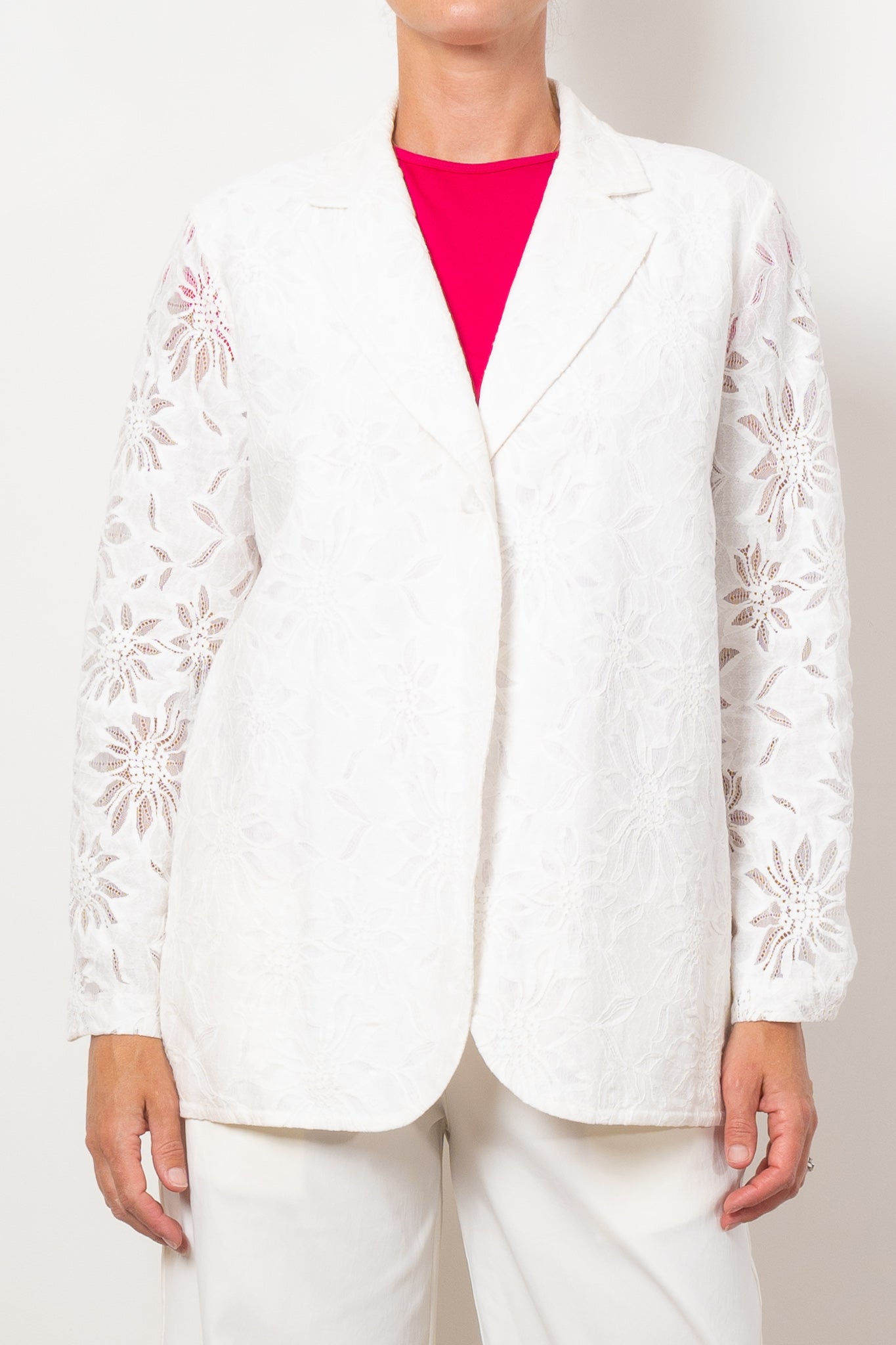 Update your Spring wardrobe with the Mela Purdie Button Blazer in Flora Lace. Made in Australia from the luxurious and detailed Flora Lace fabric, this blazer boasts a timeless, tailored fit that exudes sophistication. The knit, stretch fabric and double layer fronts provide a comfortable and flattering silhouette, while the one button closure and full length sleeves add elegance. Designed and made in Australia.