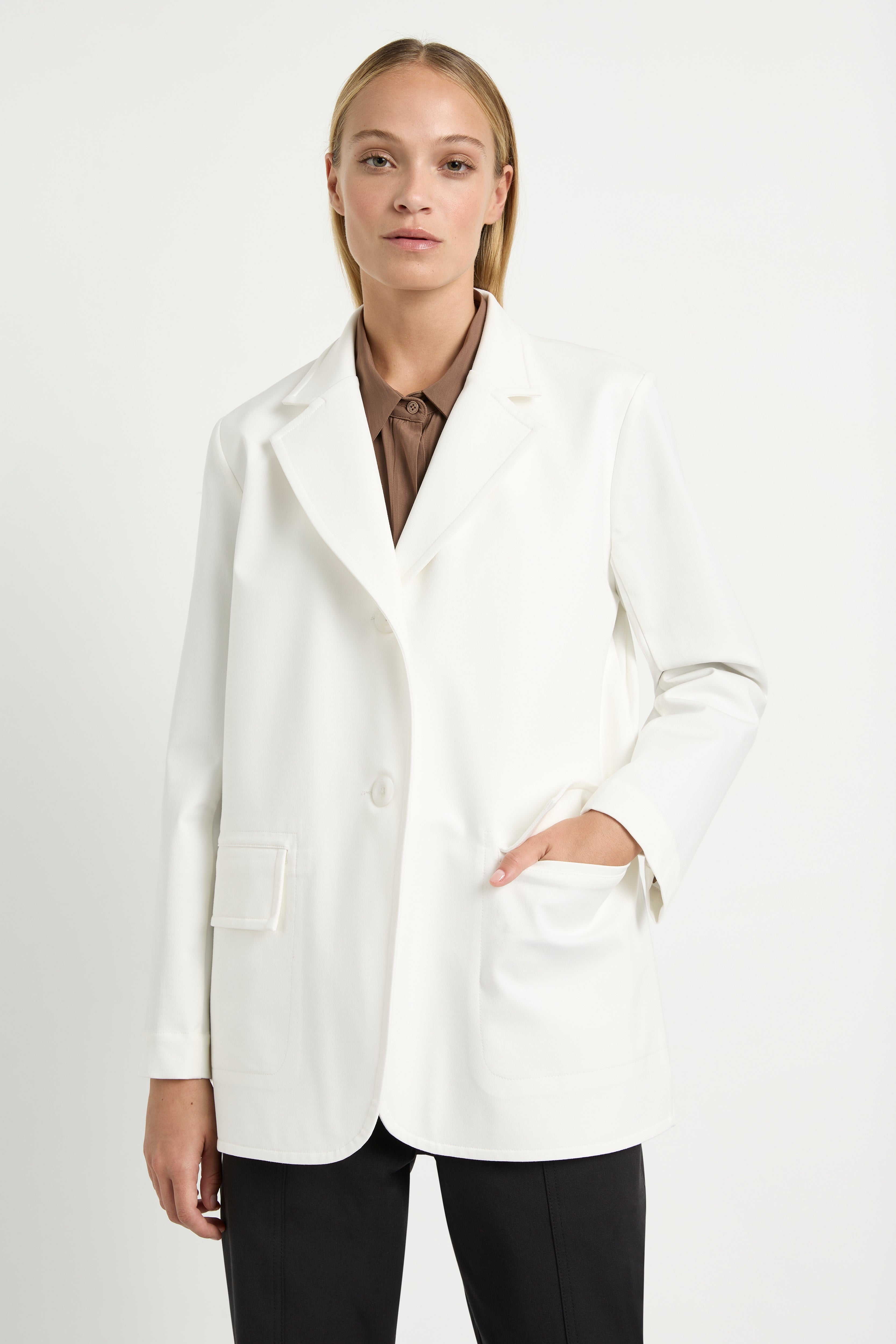 Introducing the Mela Purdie Stretch Blazer in brand new Two Way Stretch. Crafted from a high-stretch, European cotton blend fabric that offers both comfort and style. The crisp collar and polished finish give a modern yet tailored fit, while the longline length and full length sleeves make it a versatile addition to any wardrobe.