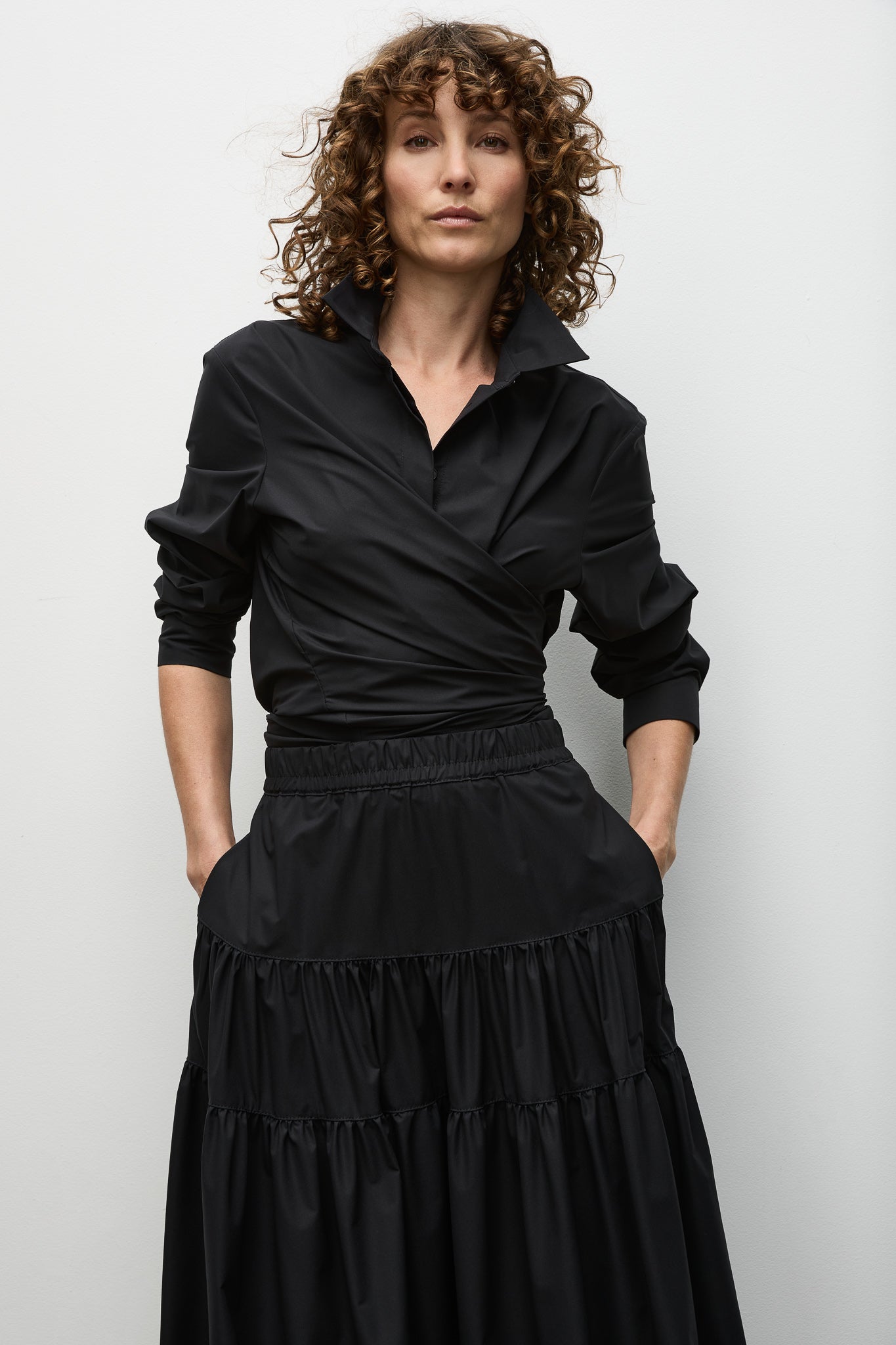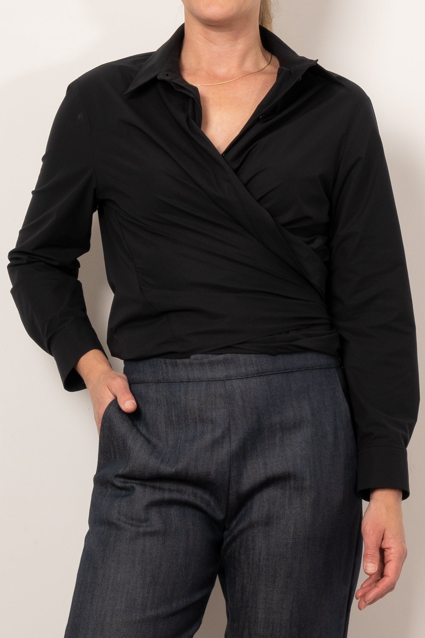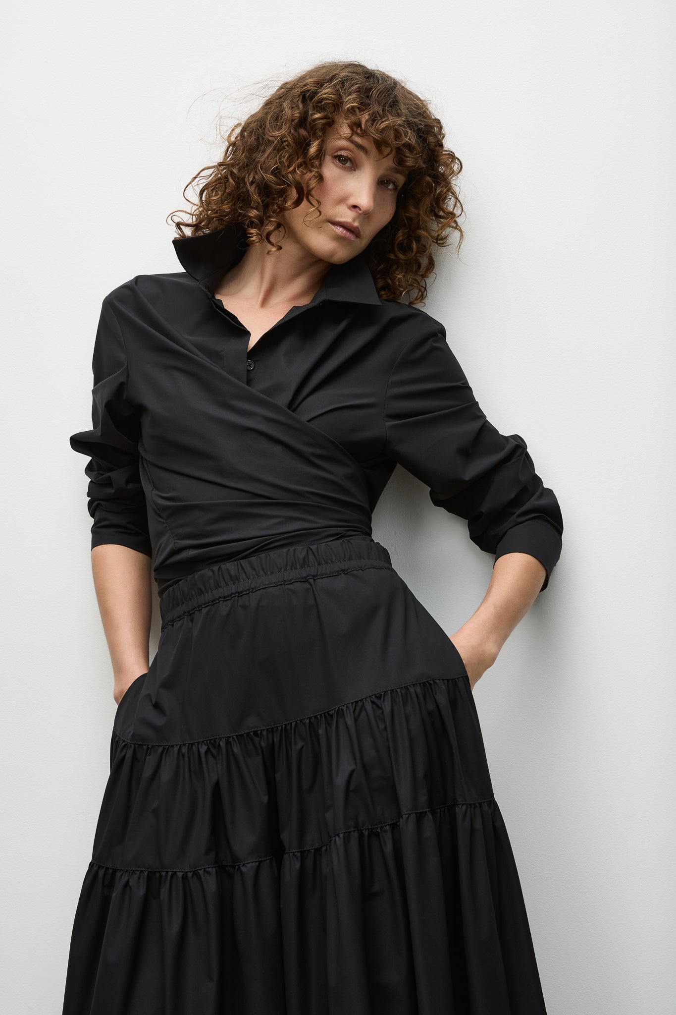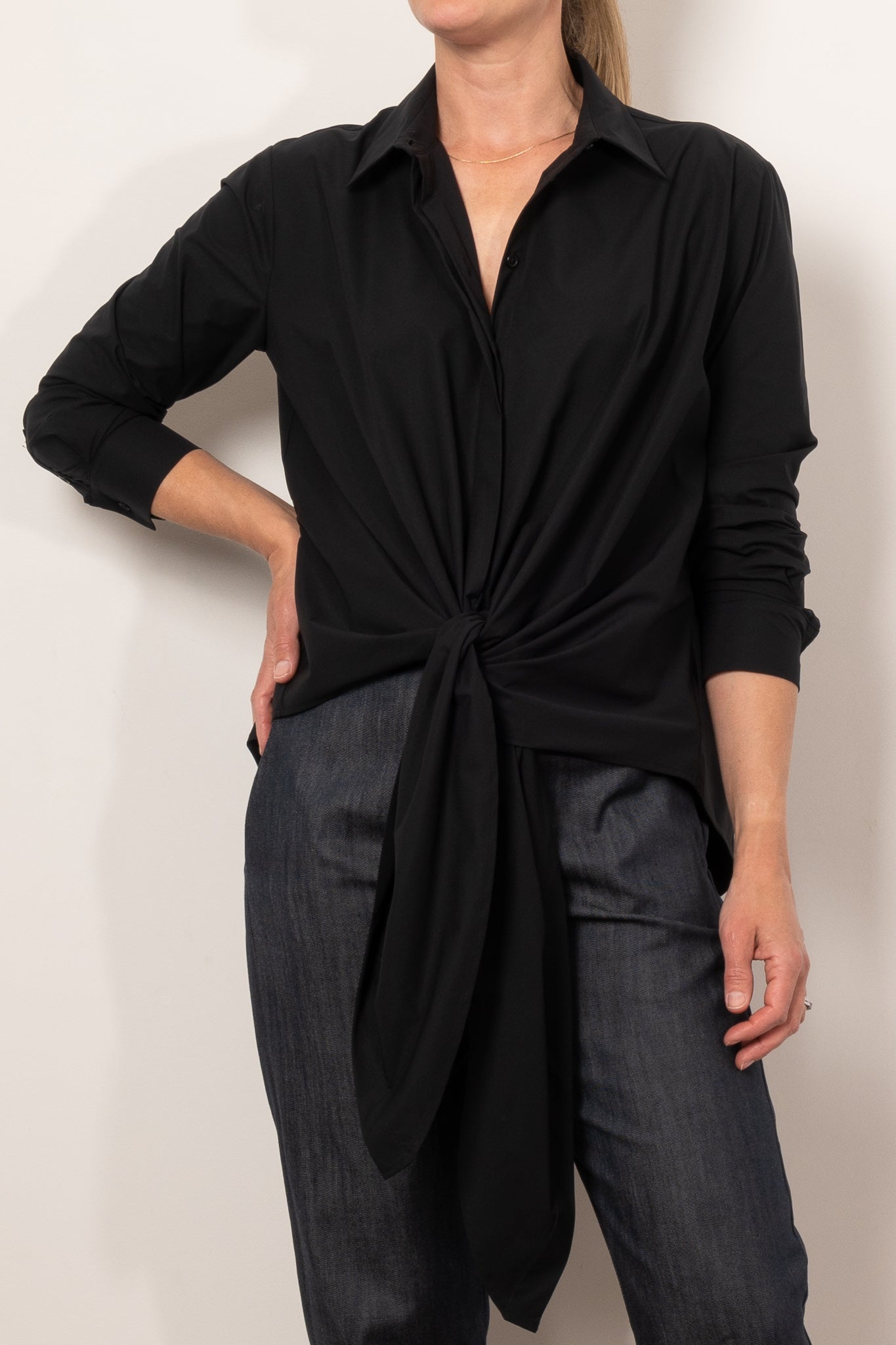 Indulge in the luxurious craftsmanship of the Mela Purdie Tie Jacket. Made with high tech 4-way stretch European Powder weave fabric, this jacket features a pearlised surface and crisp feel. Classic shirt details, a longline hem, and a multipurpose tie-up styling add an elegant touch. Made in Australia.