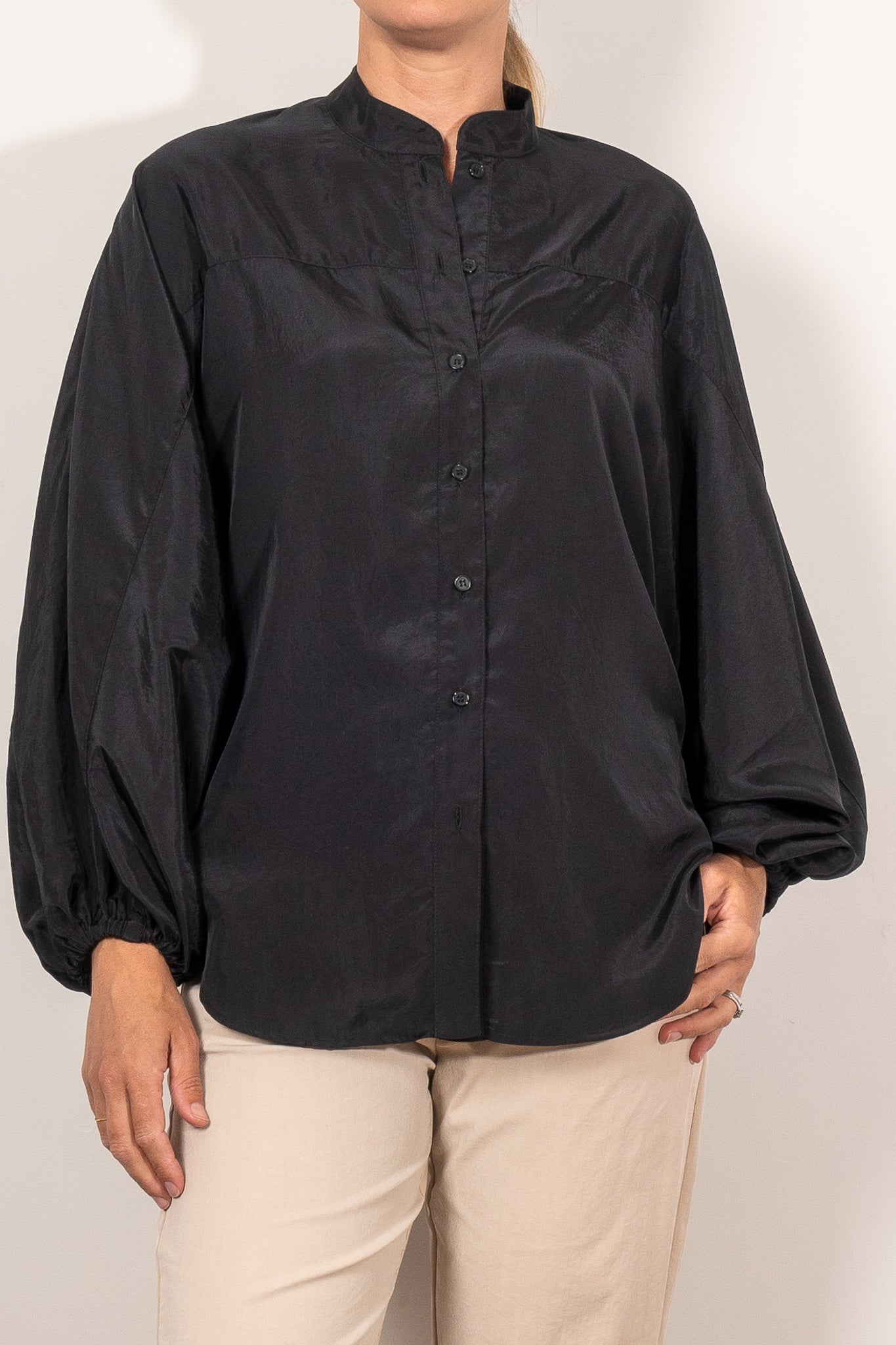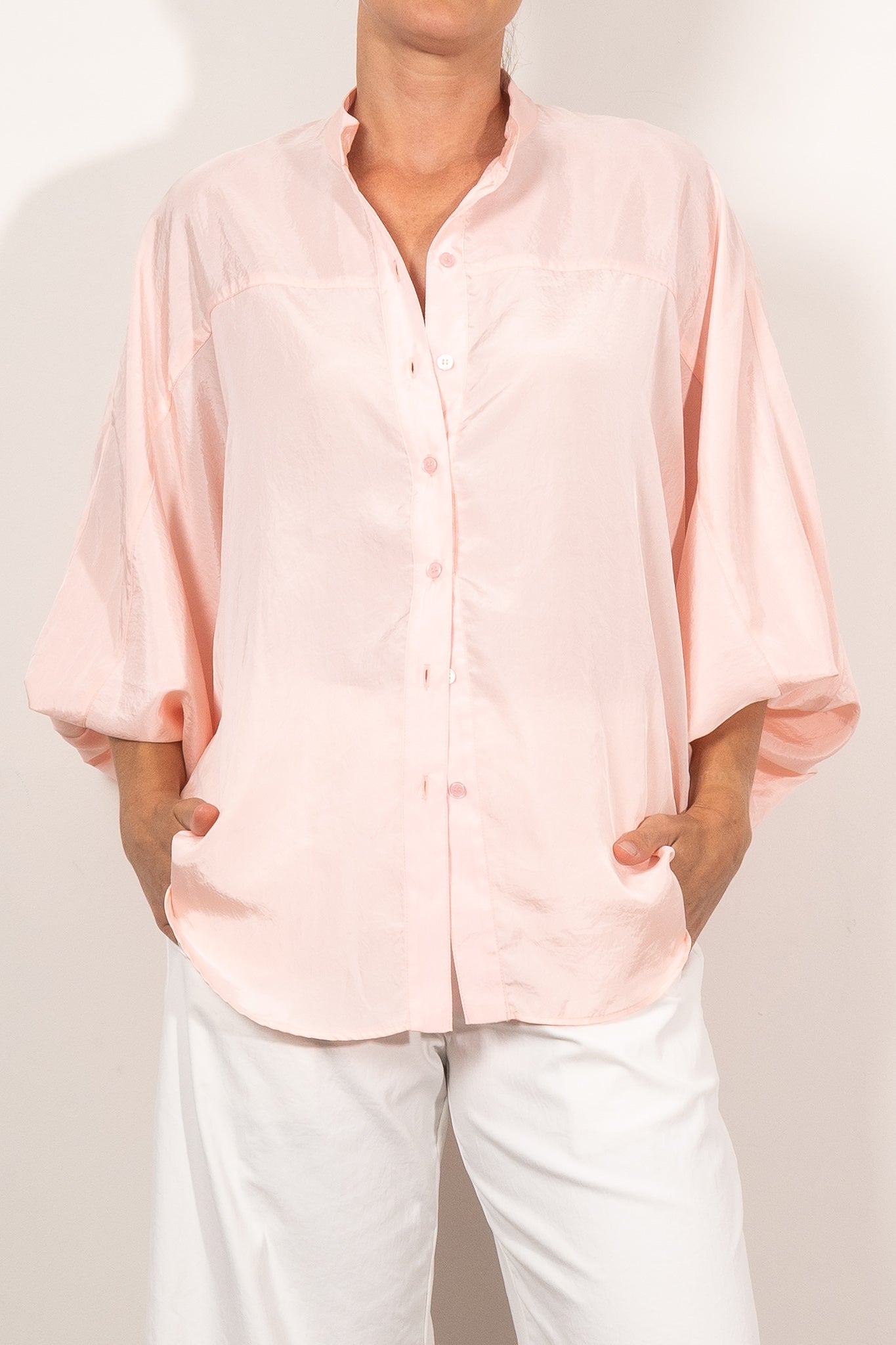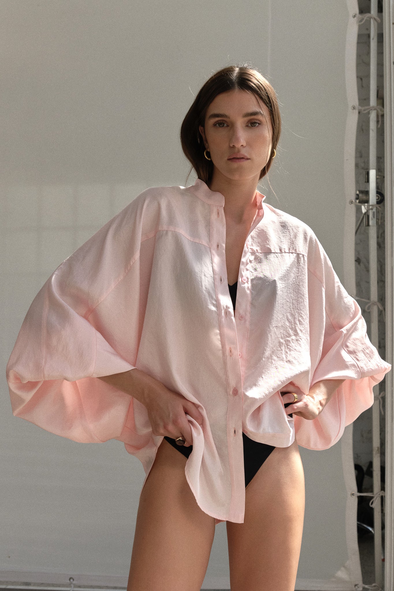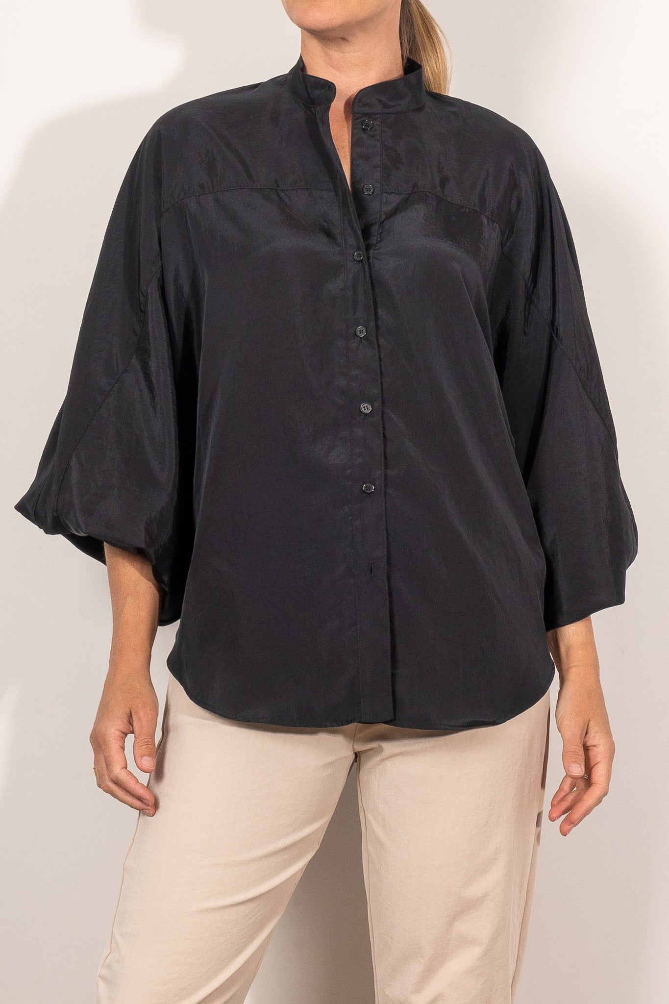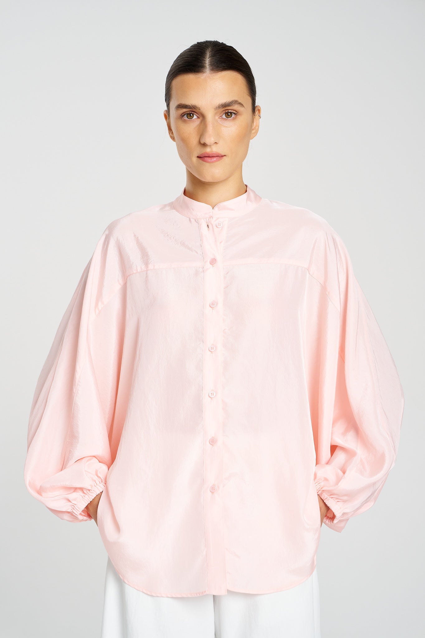 Striking yet effortless, the Billow Blouse is cut from Mela Purdie’s lightweight Technical Tumbled Taffeta — a Japanese-woven fabric with a softly structured, parchment-like feel. Designed for modern ease, this silhouette pairs the drama of voluminous sleeves with the functionality of a classic shirt. Its generous cut and elasticated cuffs make it equally suited to weekday polish or relaxed weekend styling.