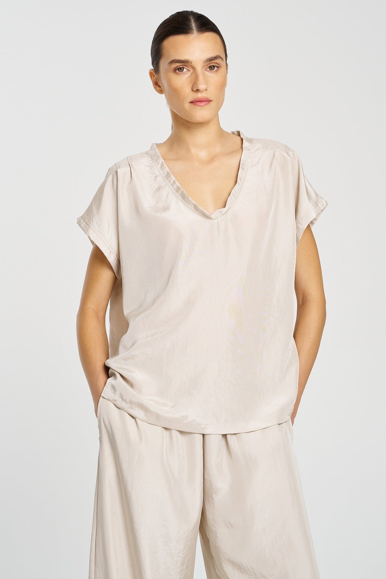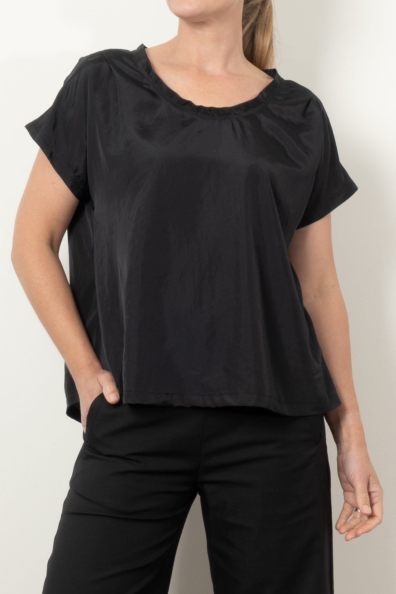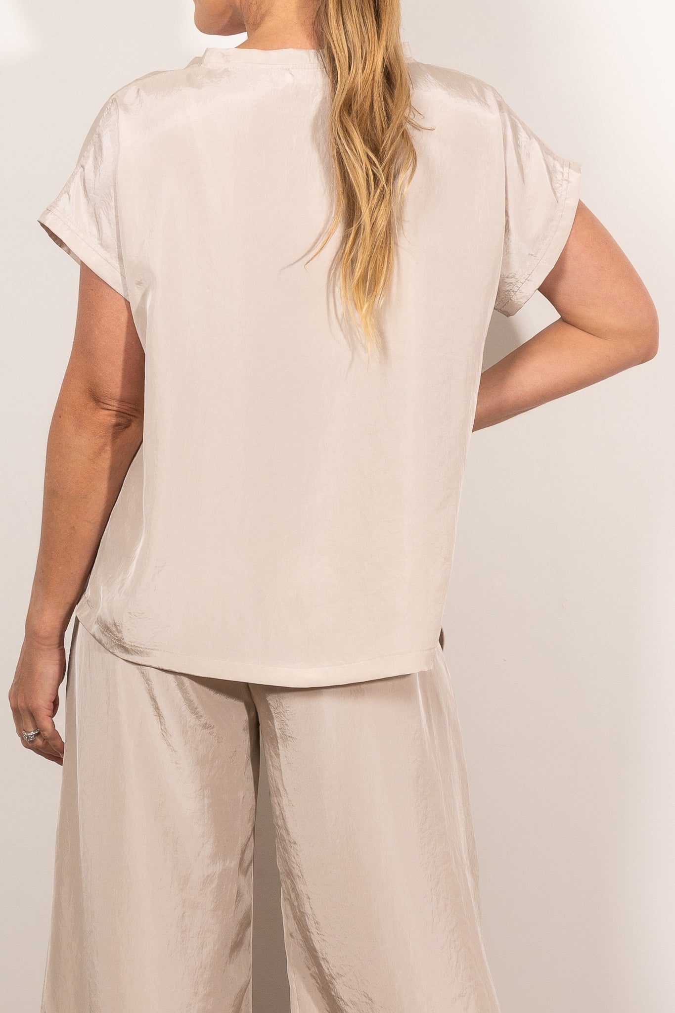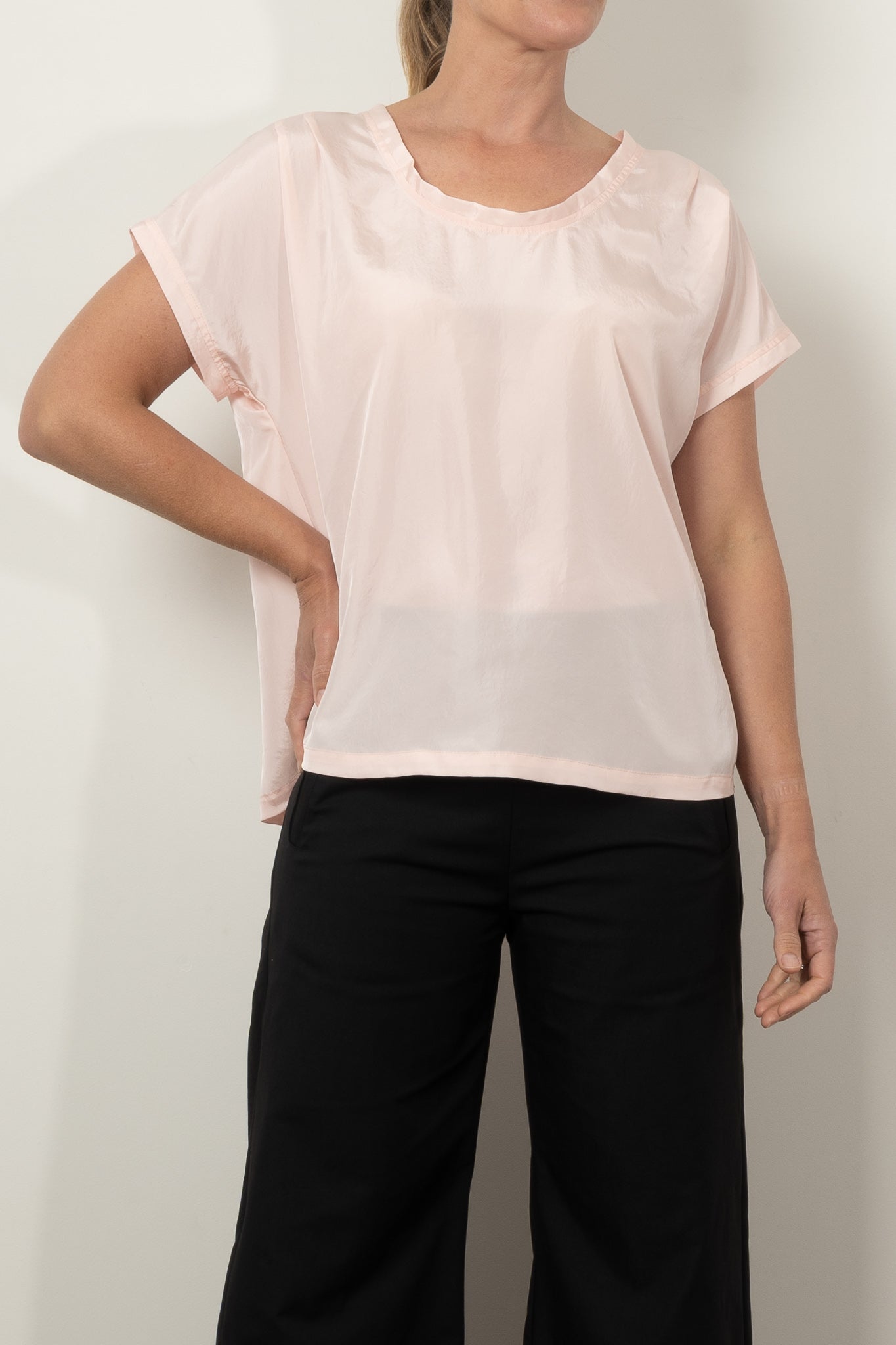 Lightweight yet structured, the Cruise Shell in Technical Tumbled Taffeta brings a crisp, modern edge to your everyday wardrobe. Made from a Japanese-woven taffeta with a subtle texture and soft sheen, this piece offers architectural shape without sacrificing comfort. Featuring a cap sleeve, relaxed fit, and softly curved hemline, it’s an ideal staple for refined, capsule dressing.