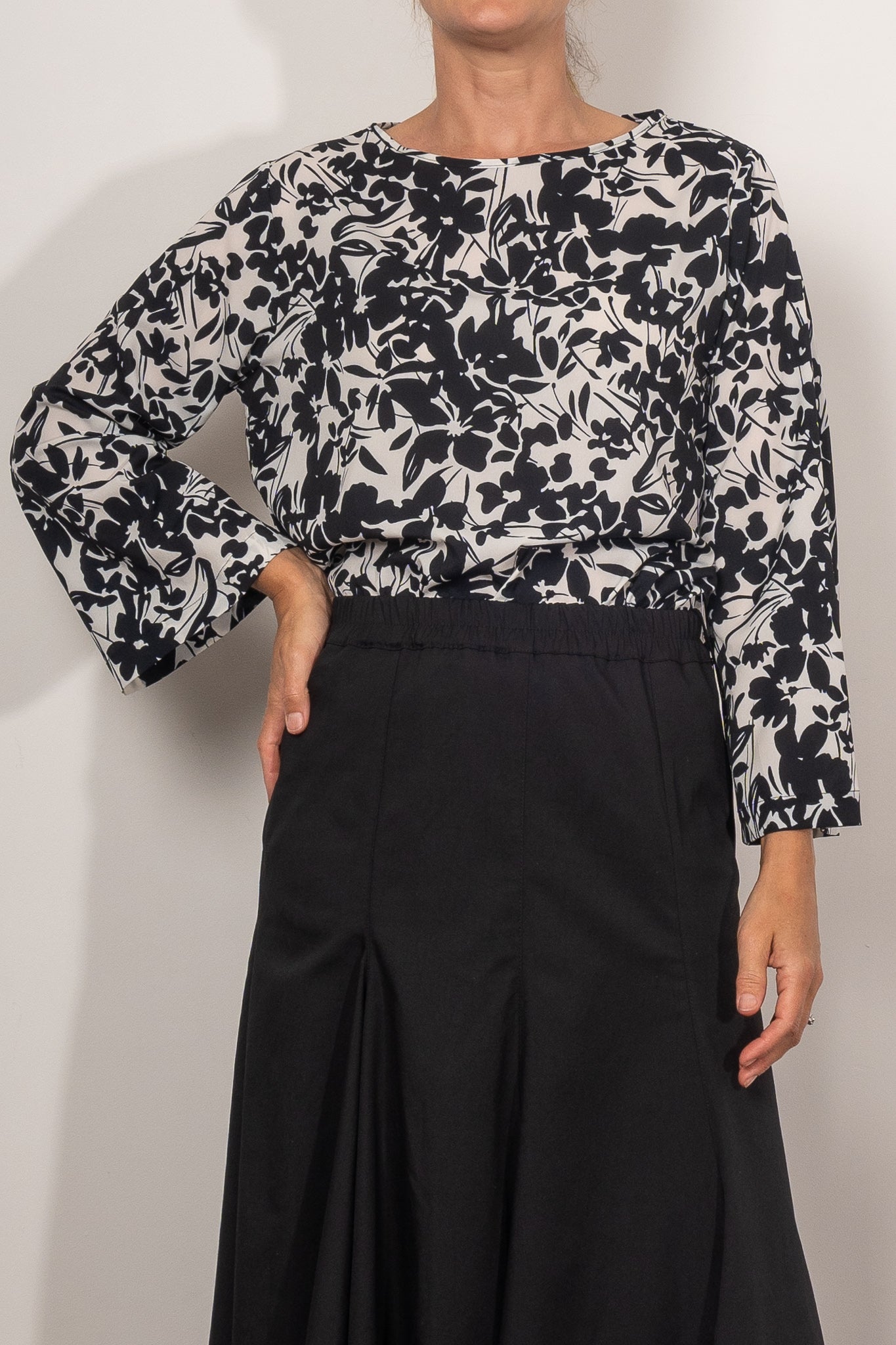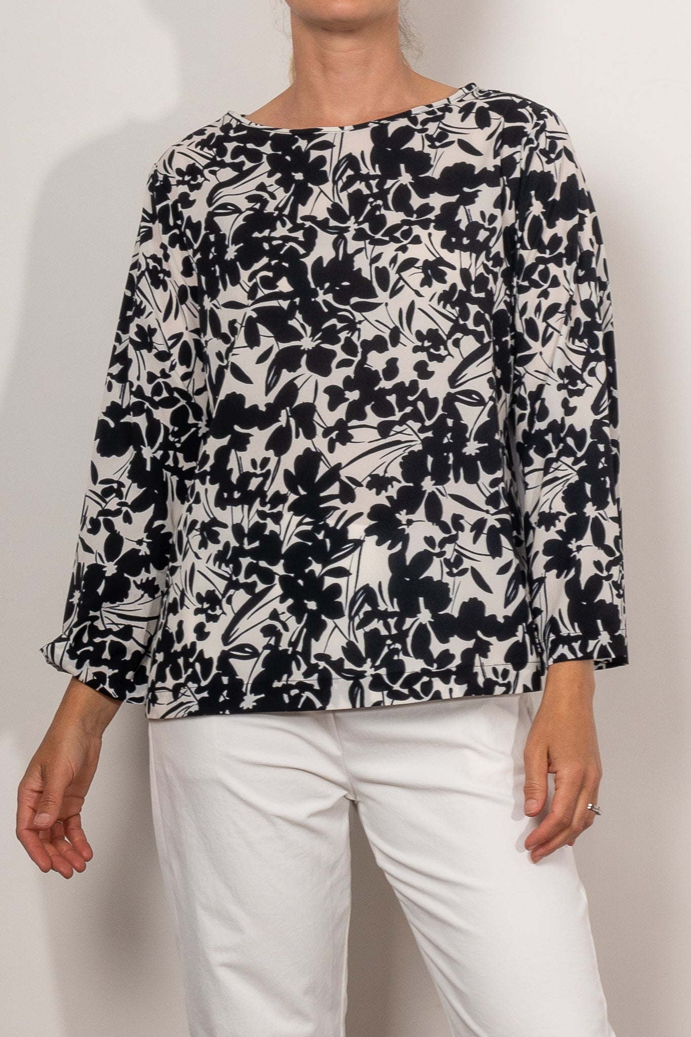 Indulge in luxury with the Mela Purdie LS Slice Neck Plaza. Crafted from Japanese Tuberose Charmeuse, this fluid stretch Satin top boasts a bold floral print and a relaxed fit that skims the body. See full product description below for fabric and fit info.