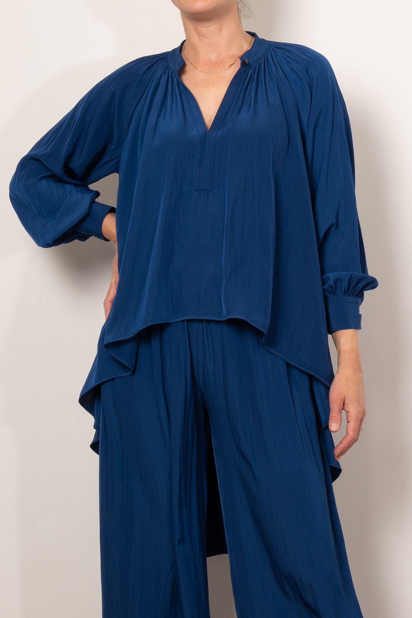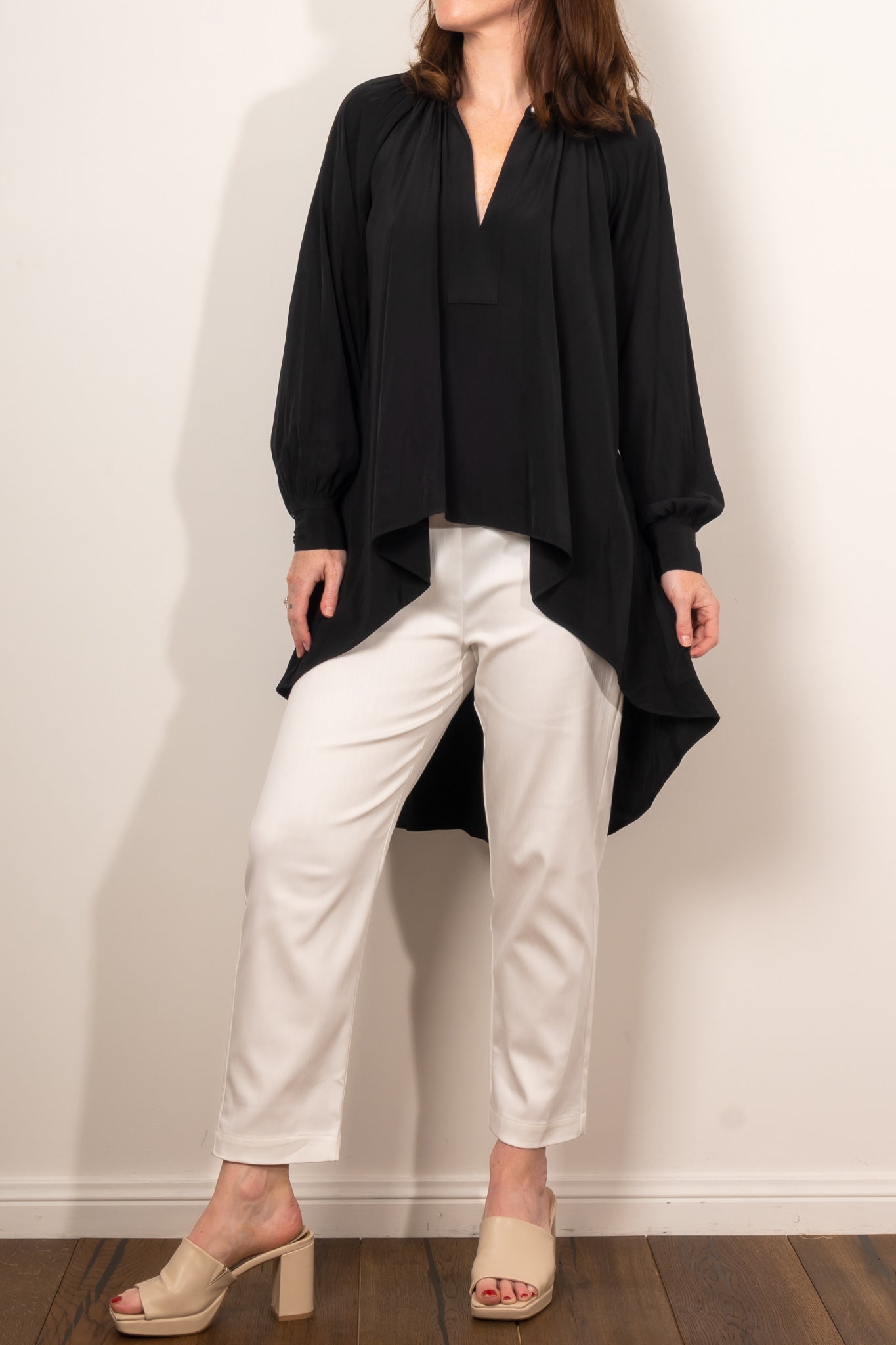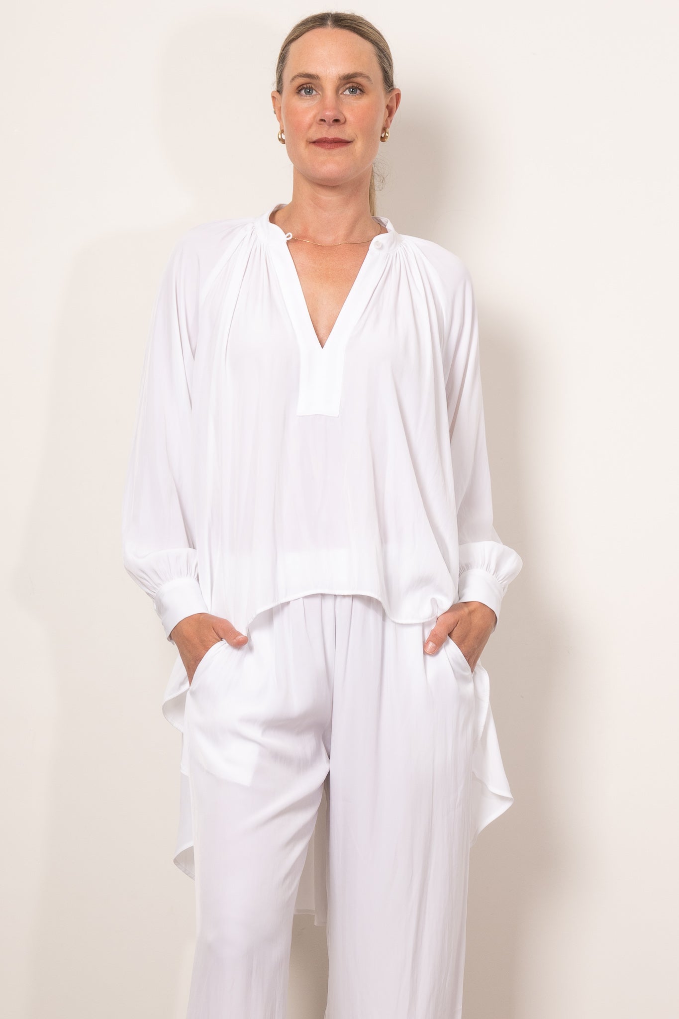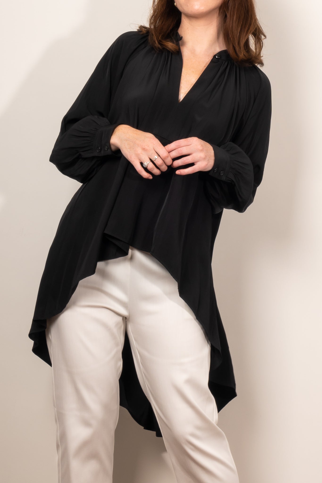 Elevate your wardrobe with the Mela Purdie Arc Blouse, crafted from luxurious Mache fabric for a smooth and fluid drape. Featuring intricate front gathering, a hi-low hem and a relaxed fit, this blouse exudes elegance and sophistication. Designed and made in Australia.