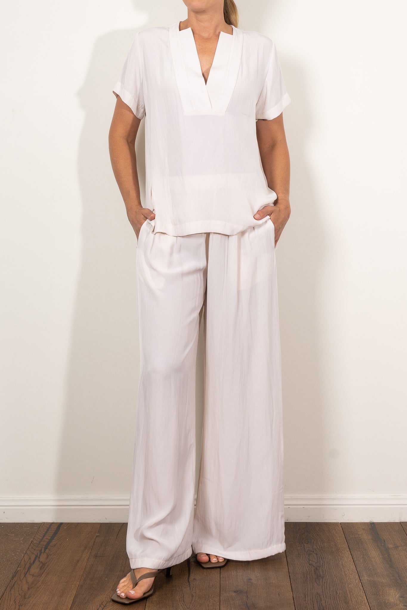 Made from Mela Purdie’s signature Mache, the Double Vent Top elevates everyday dressing with its layered V-neck detail and softly draped silhouette. Available in classic Black or creamy Meringue.