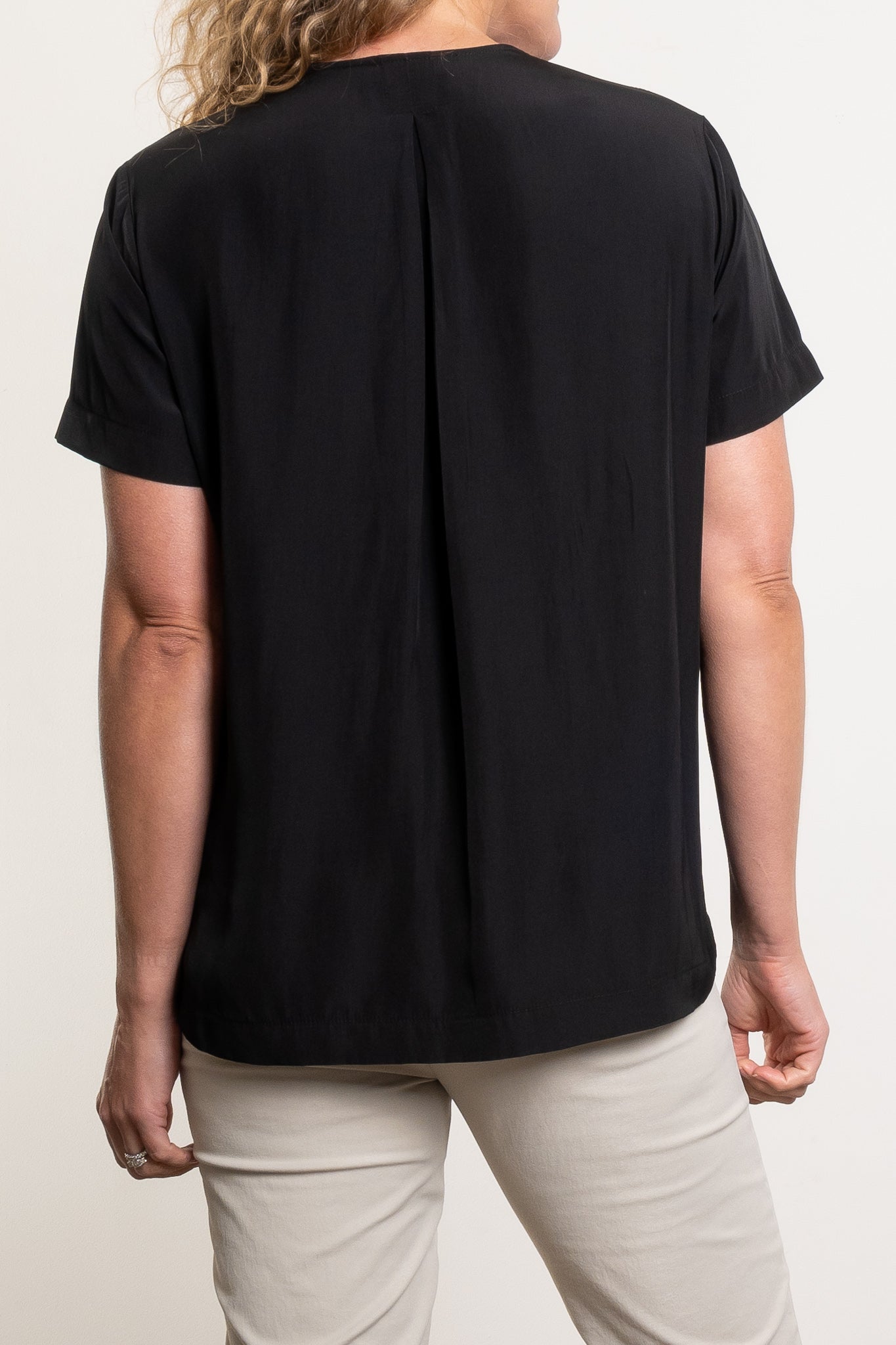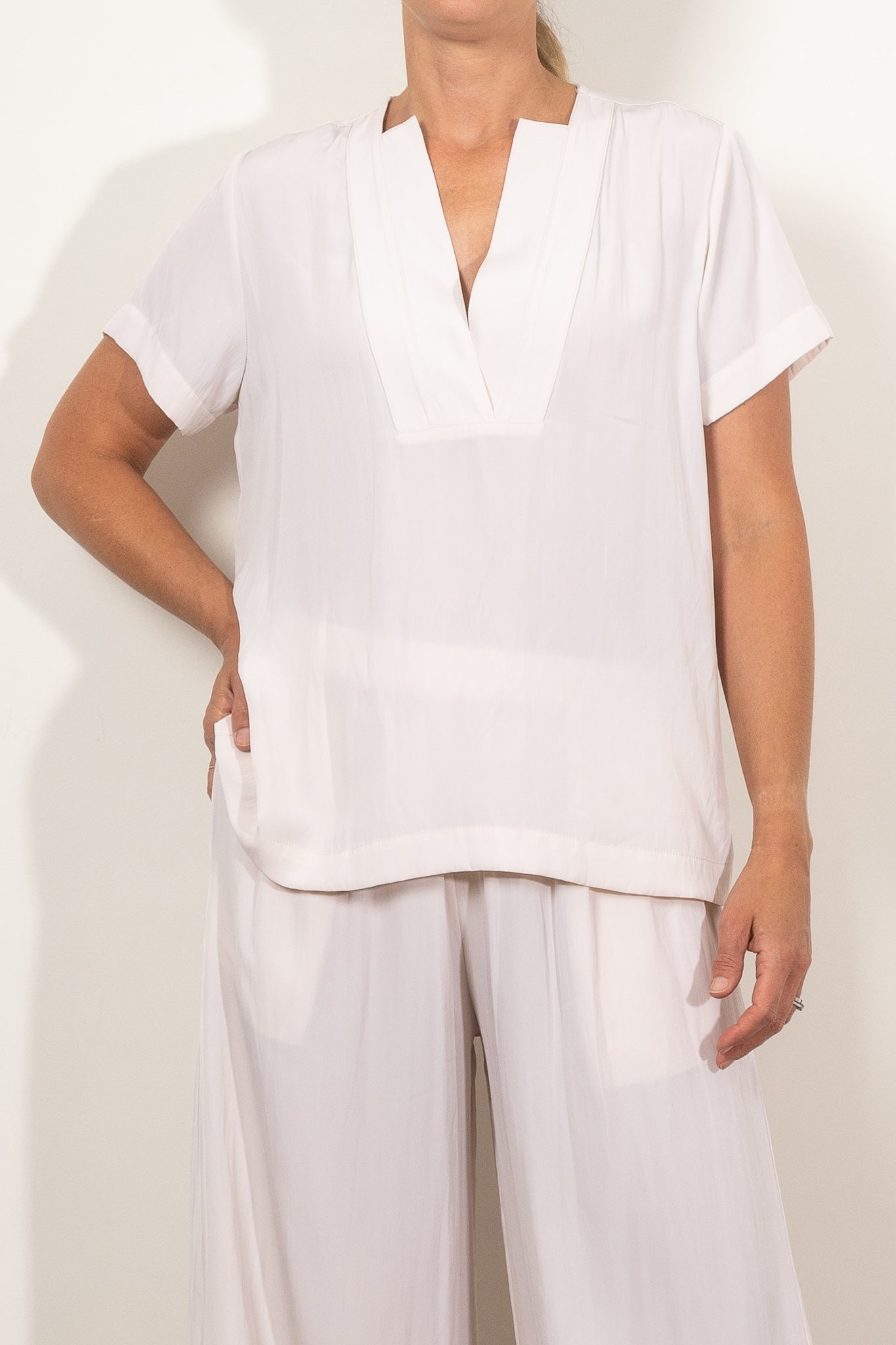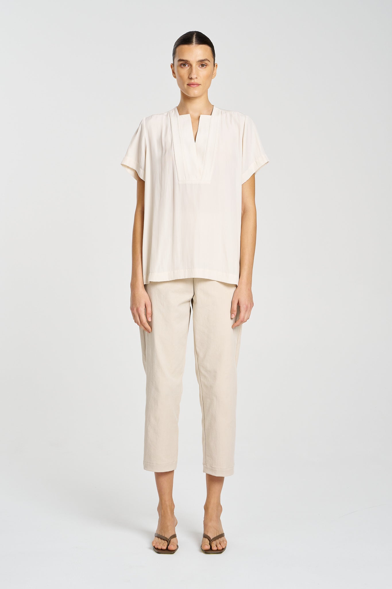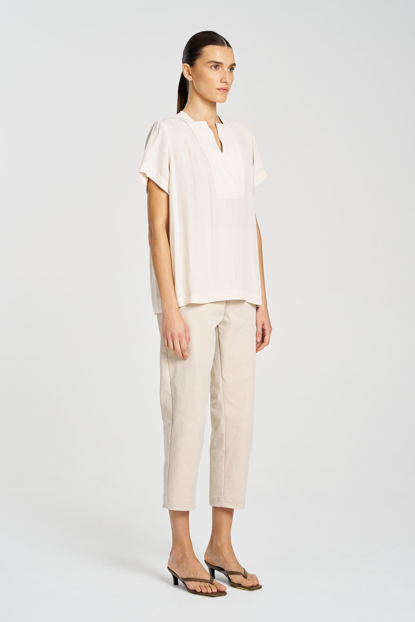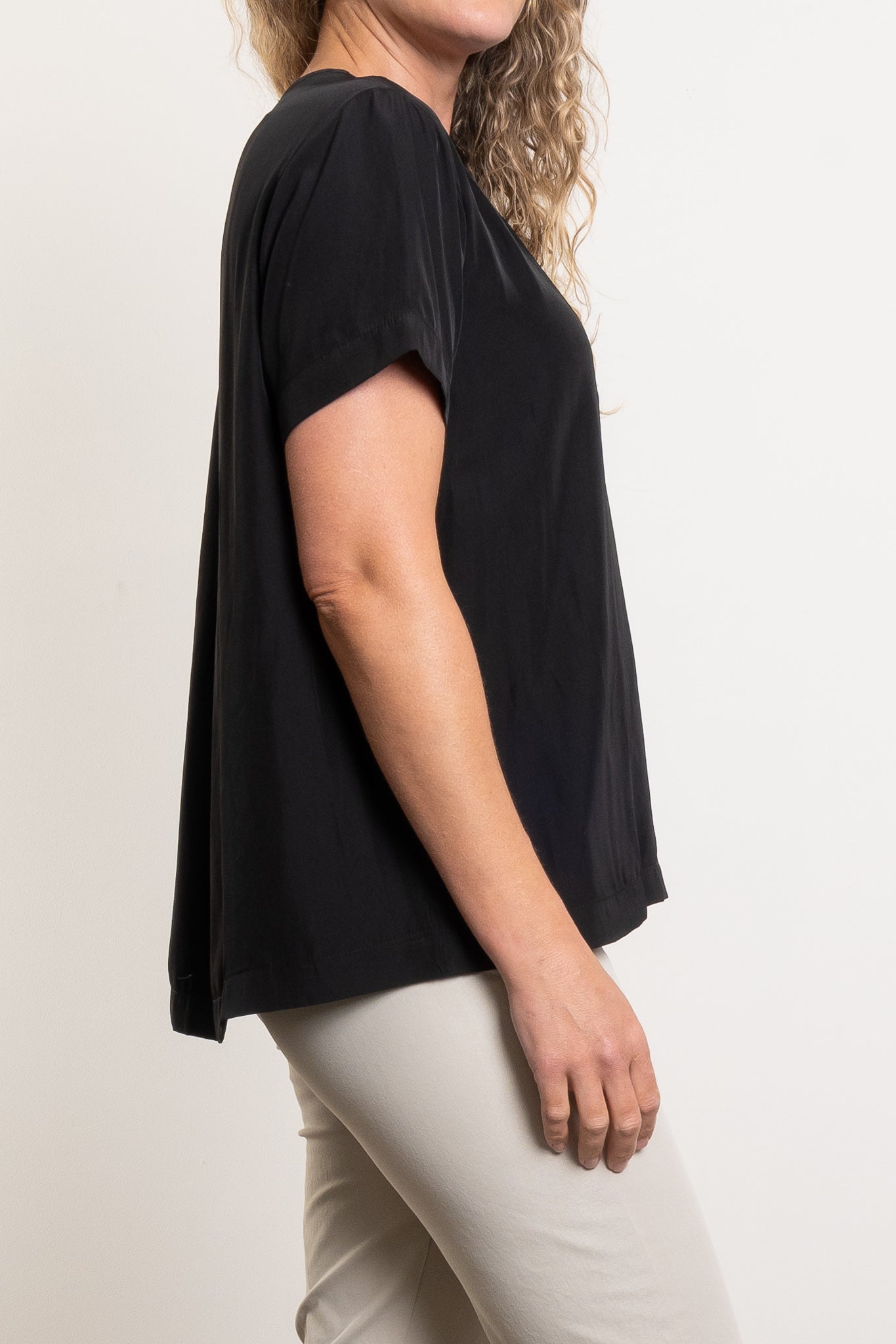 The Double Vent Top is crafted from Mela Purdie’s signature Mache—loved for its softly structured drape and subtle sheen. Designed and made in Australia, this elevated essential features layered V-neck detailing for a sophisticated twist on a classic silhouette. The relaxed shape and short sleeves make it ideal for workdays, weekends, or travel days alike. Pair it with tailored pants or relaxed trousers for easy polish. Available in classic Black and Meringue, a soft neutral that flatters all skin tones.