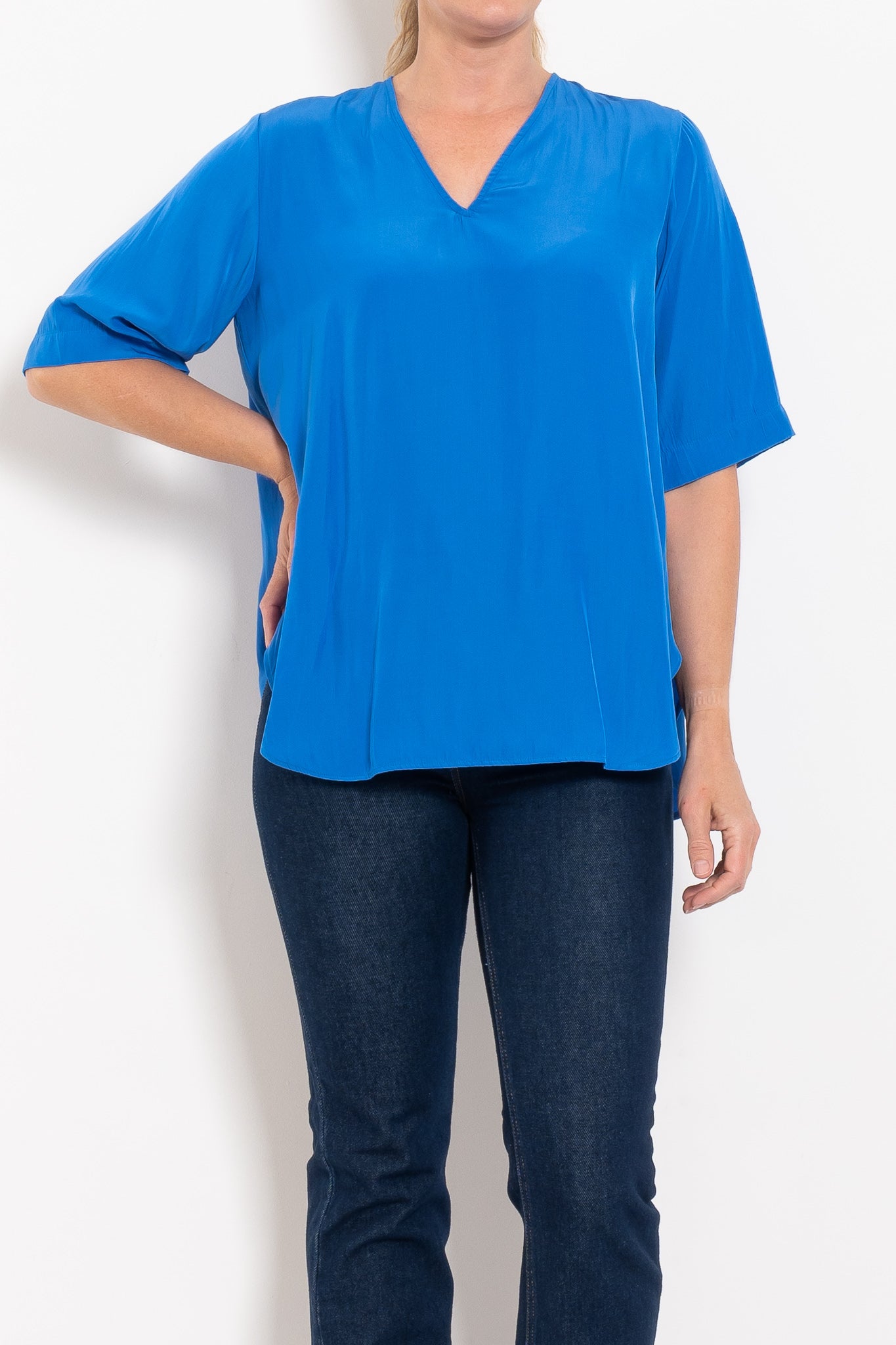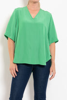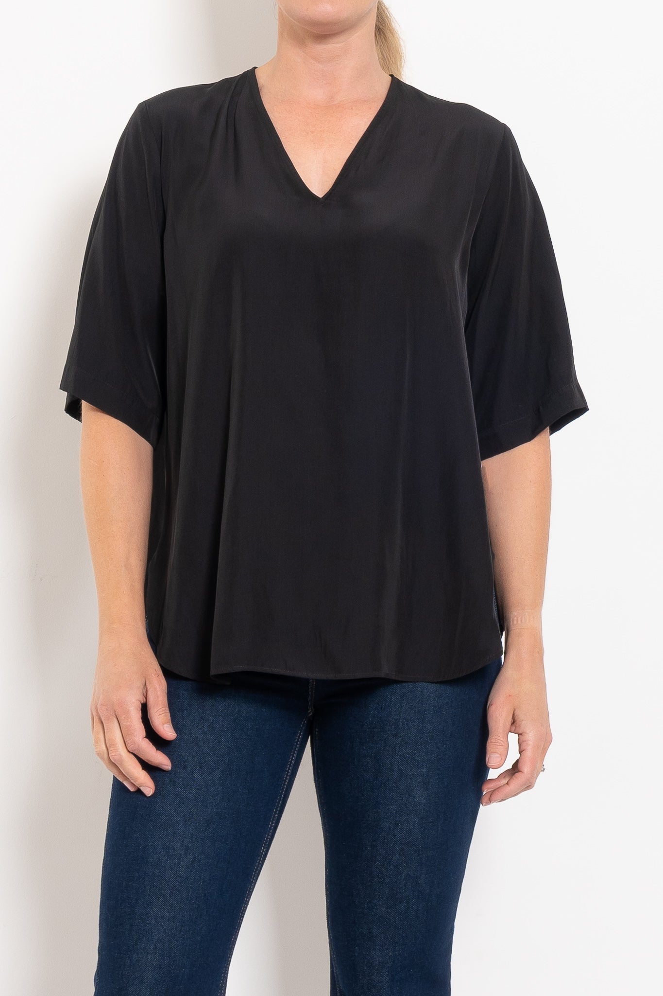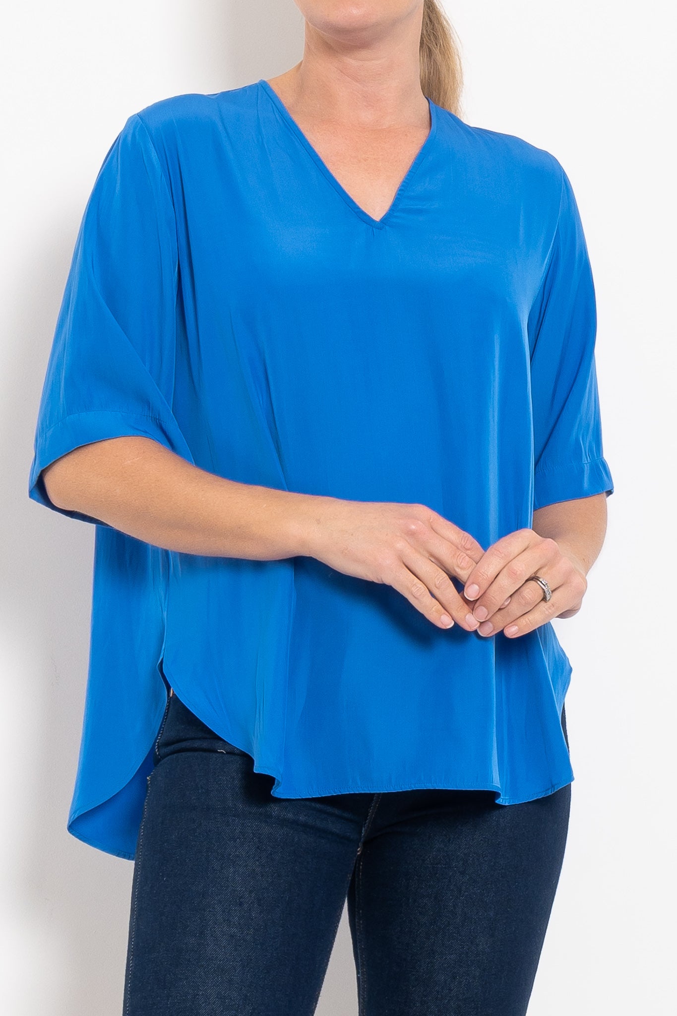 The clean V neckline frames the face and elongates the silhouette, while the curved hem creates a soft, flattering line over the hips. Relaxed 3/4 sleeves keep you cool and comfortable, whether you’re powering through a busy workday or packing it into your carry-on for a weekend away.