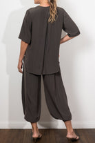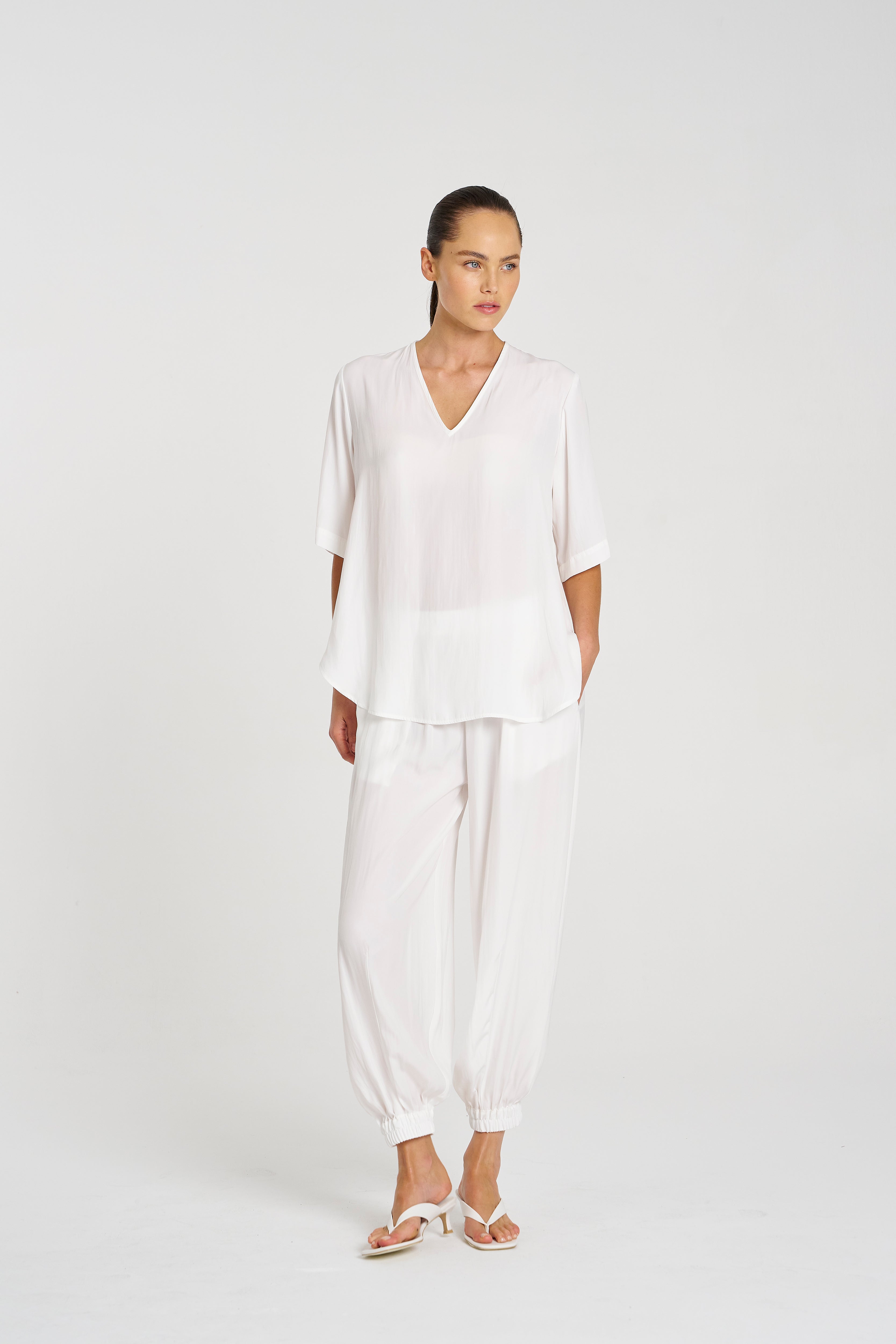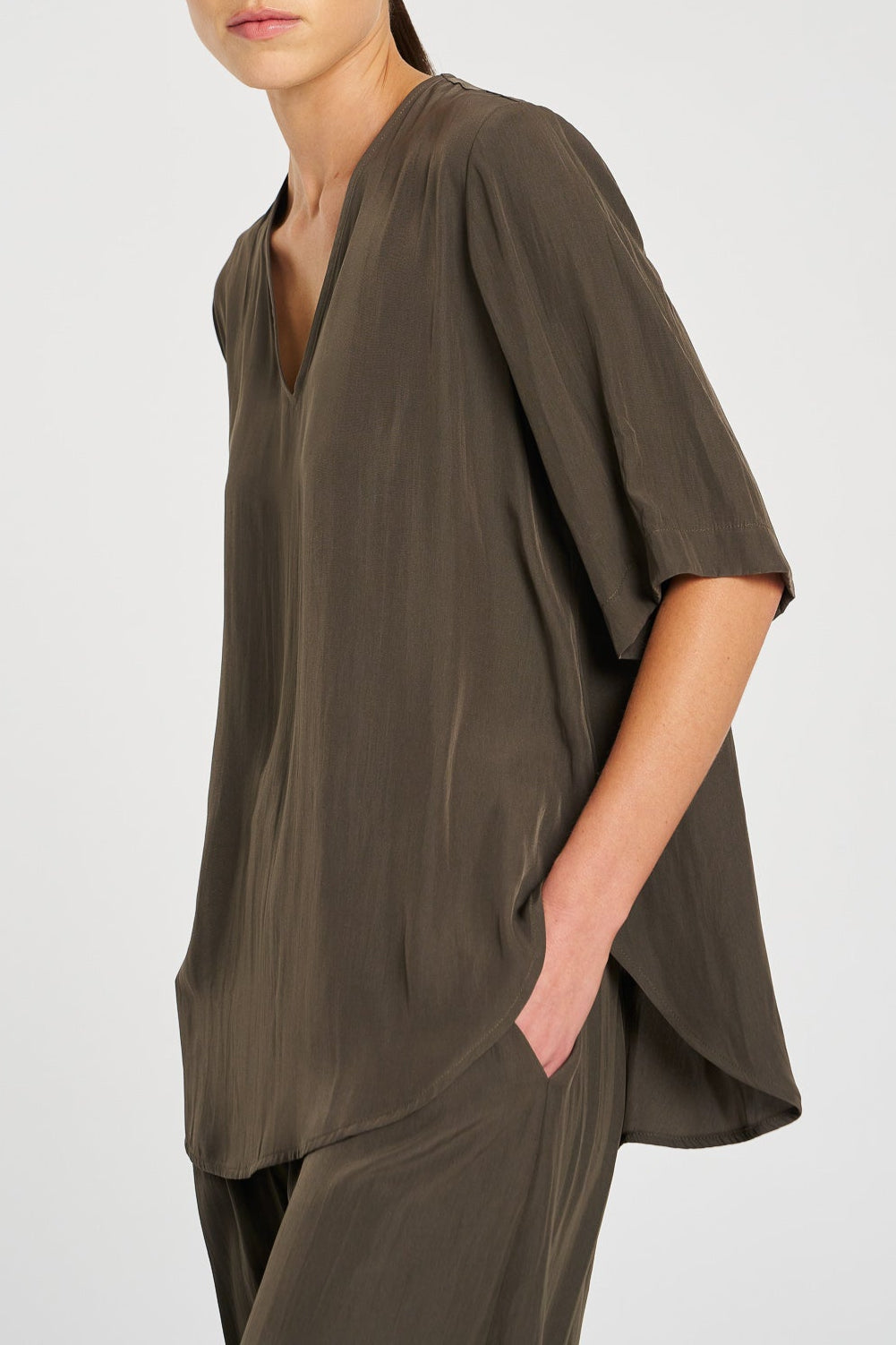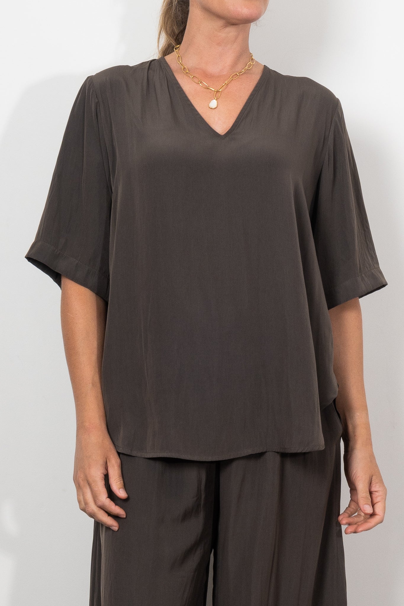 The clean V neckline frames the face and elongates the silhouette, while the curved hem creates a soft, flattering line over the hips. Relaxed 3/4 sleeves keep you cool and comfortable, whether you’re powering through a busy workday or packing it into your carry-on for a weekend away.