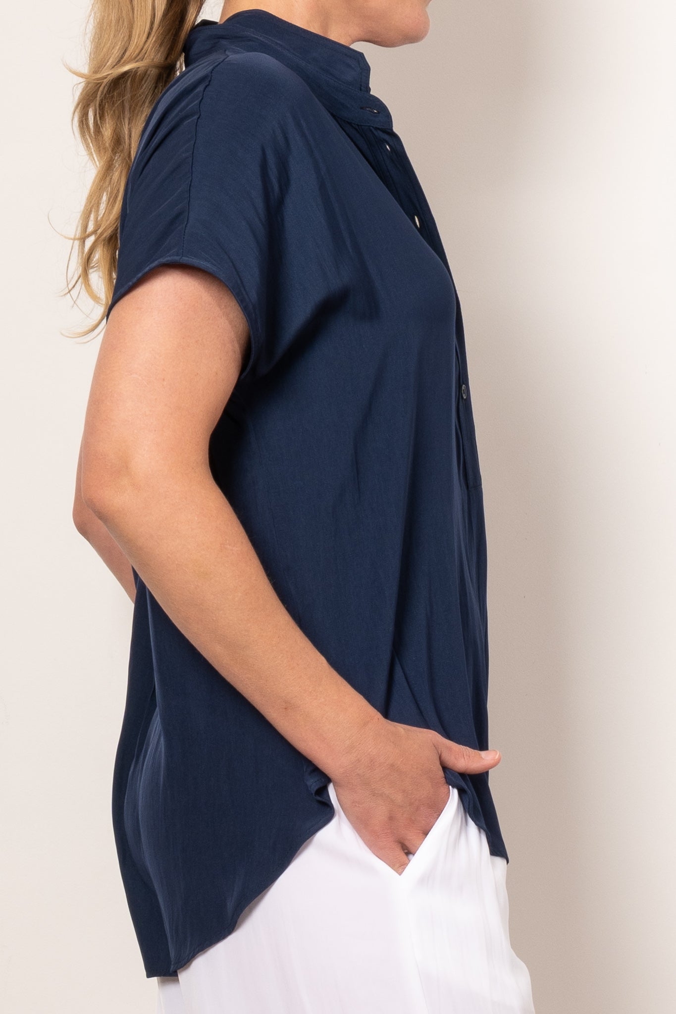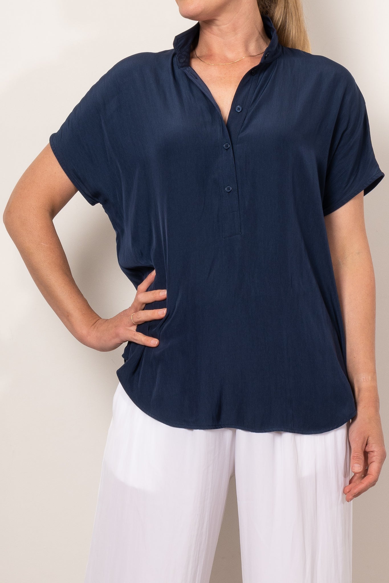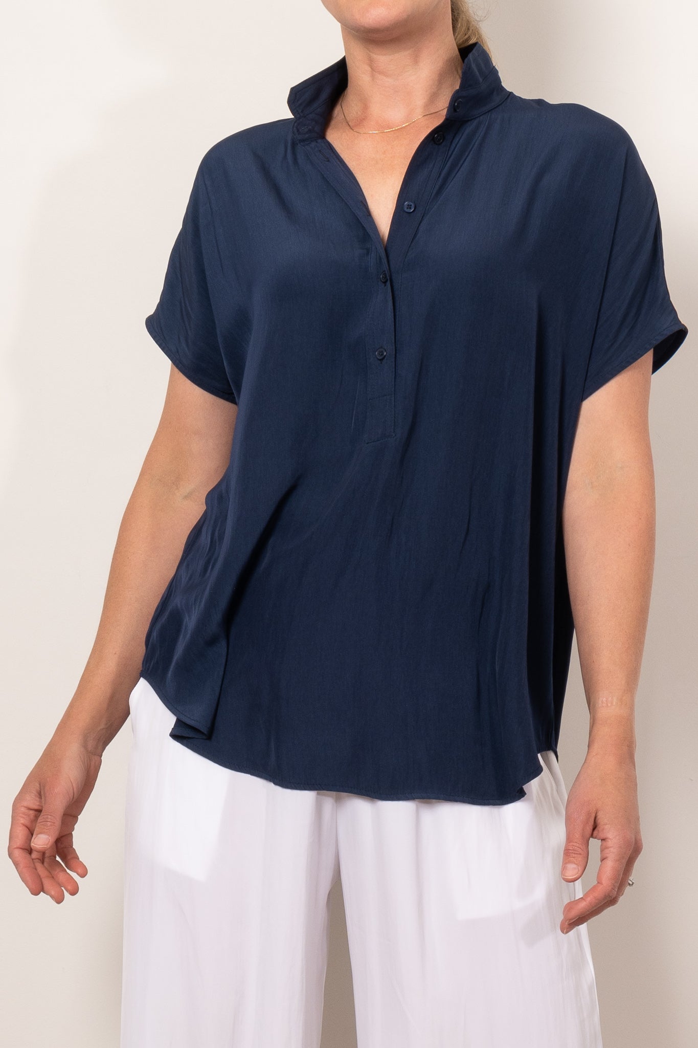 Introducing the Mela Purdie Tab Stand Shell, expertly crafted from the luxurious Mache fabric for a relaxed yet polished look. This design features a crisp front placket with button closure and capped sleeves. Made in Australia.