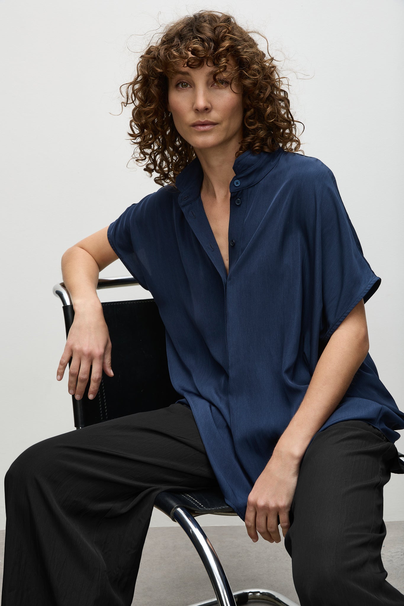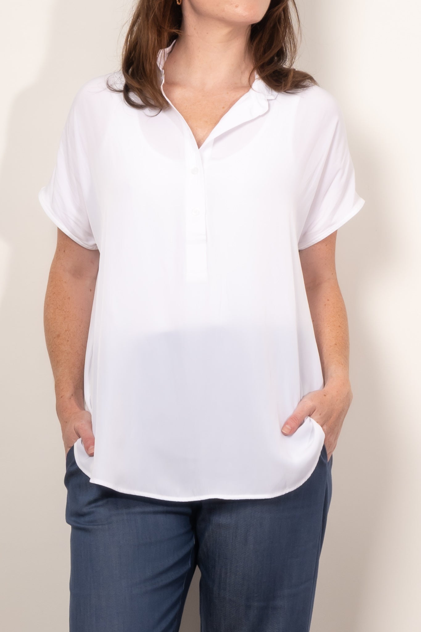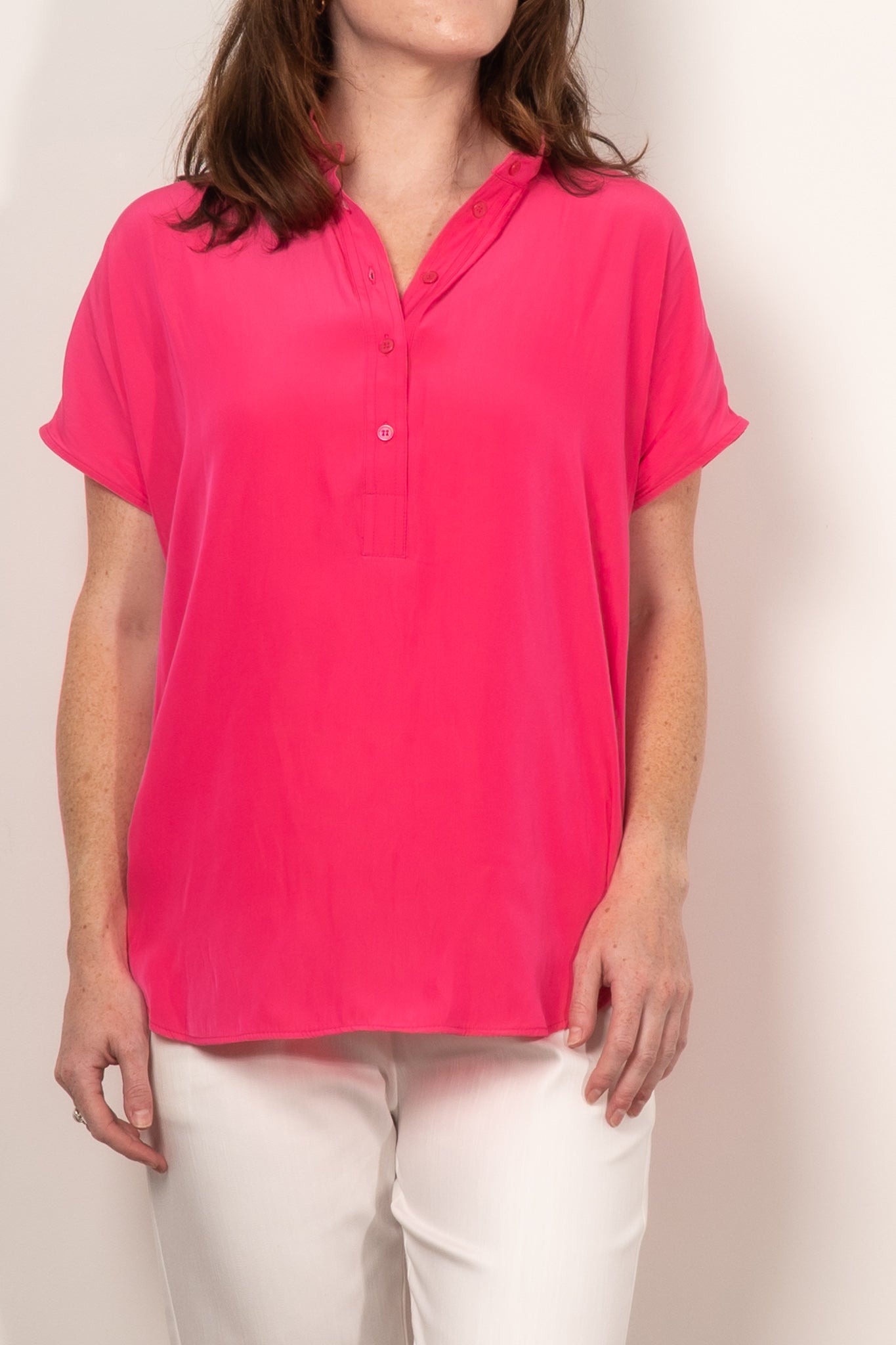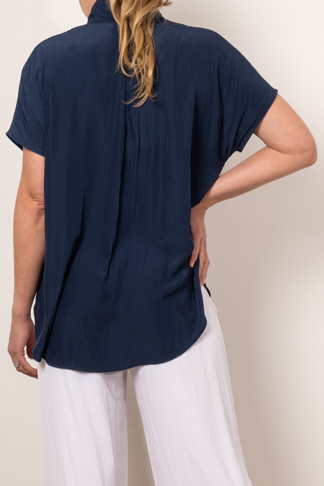 Introducing the Mela Purdie Tab Stand Shell, expertly crafted from the luxurious Mache fabric for a relaxed yet polished look. This design features a crisp front placket with button closure and capped sleeves. Made in Australia.