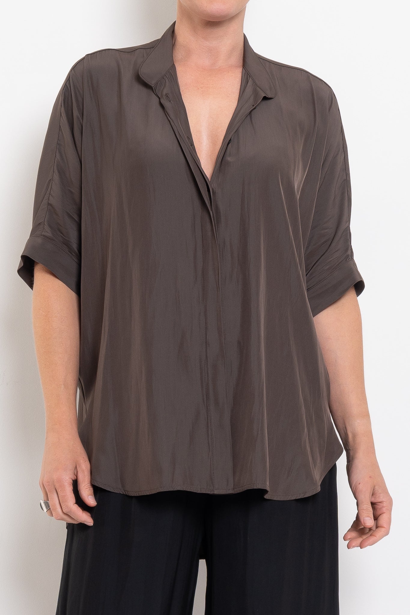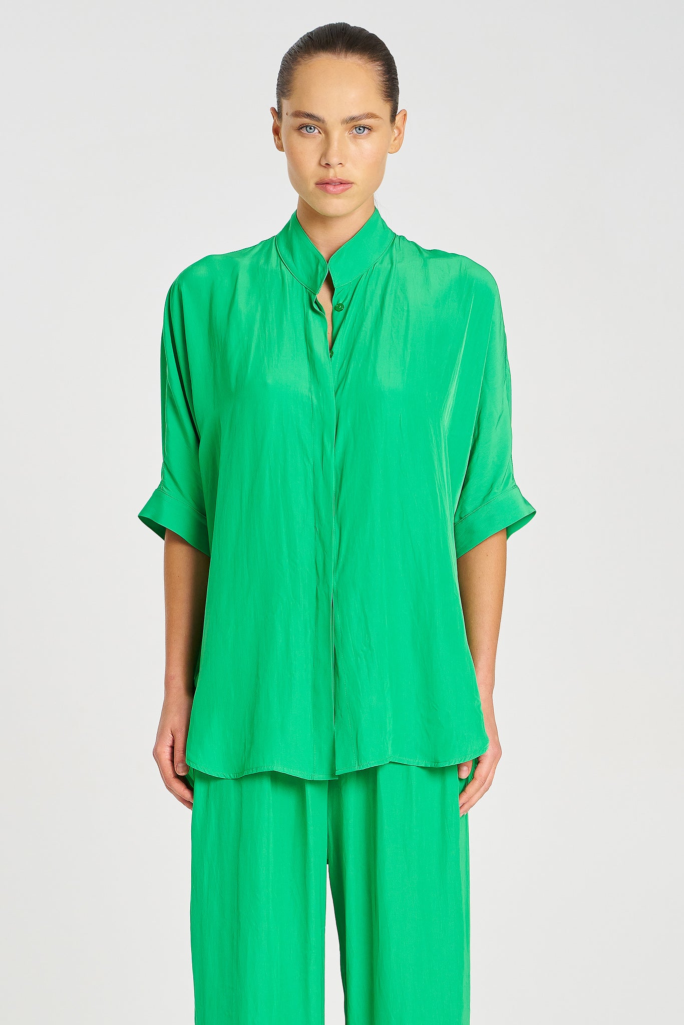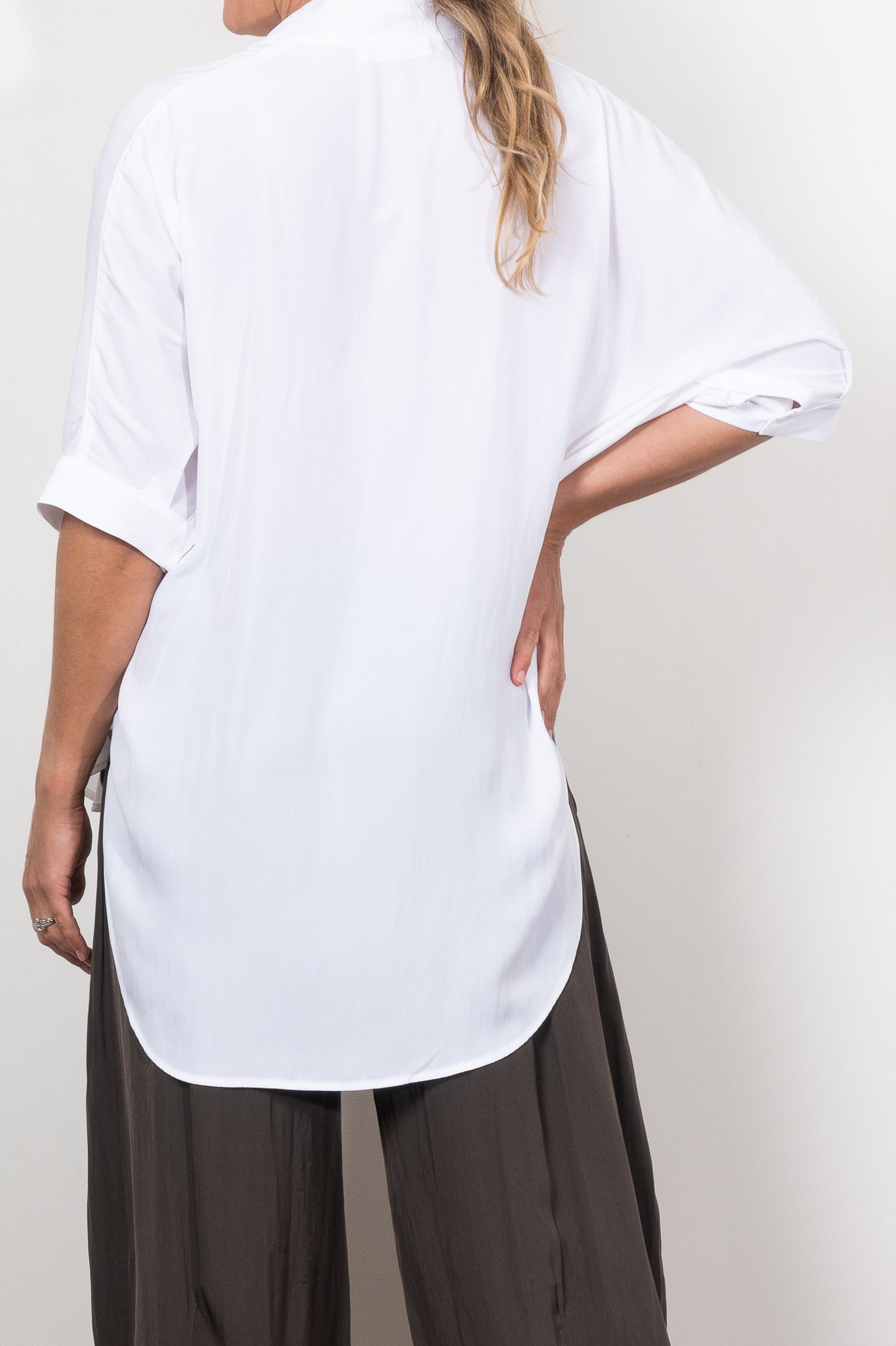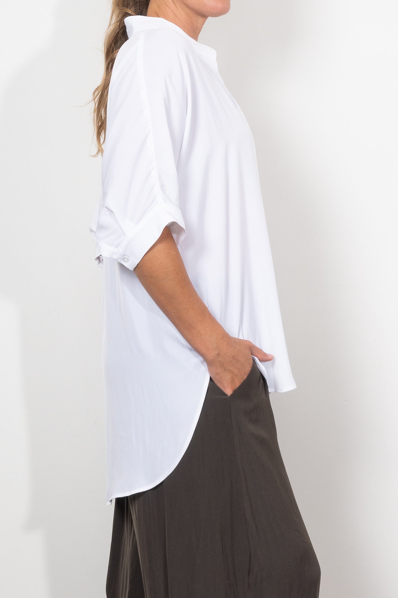 The Villa Overshirt is cut from Mela Purdie’s signature Mache, a Japanese-woven fabric that feels like silk yet resists creasing — making it as practical as it is luxurious. Its stand collar and concealed placket bring subtle structure, while the dramatic curved hemline creates a flowing, modern silhouette. Designed with a relaxed fit, it’s the piece that elevates everything from casual denim to tailored pants, carrying you from weekday errands to evening dinners in style.